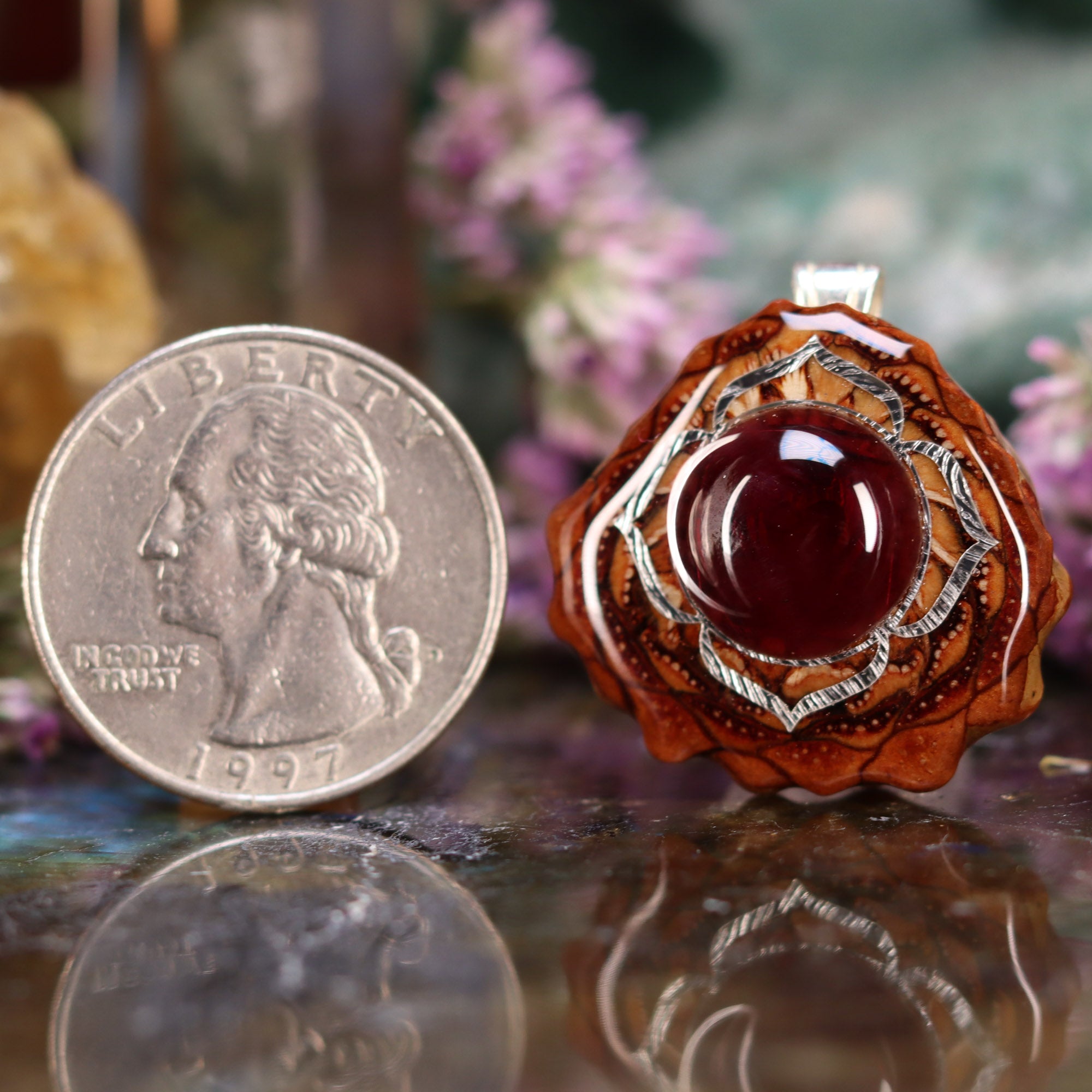 Every pinecone pendant is an elegant gift from Mother Nature -- unveiling the ornate Sacred Geometry hidden at the center of one of the world's densest Pinecones. Because only one cross-section is taken from the "heart" of each Cone, every pendant is absolutely unique, and truly one-of-a-kind.