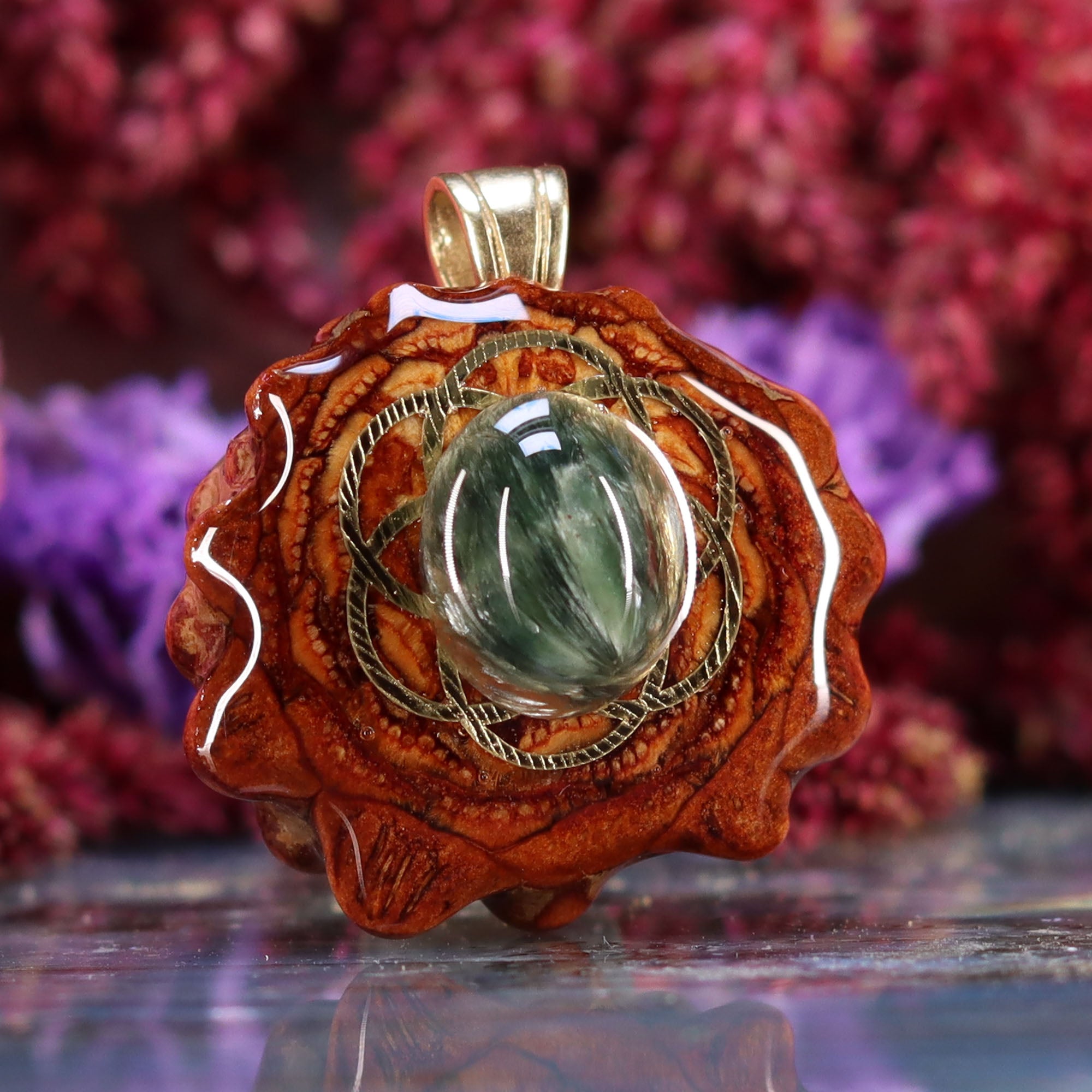 Every pinecone pendant is an elegant gift from Mother Nature -- unveiling the ornate Sacred Geometry hidden at the center of one of the world's densest Pinecones. Because only one cross-section is taken from the "heart" of each Cone, every pendant is absolutely unique, and truly one-of-a-kind.