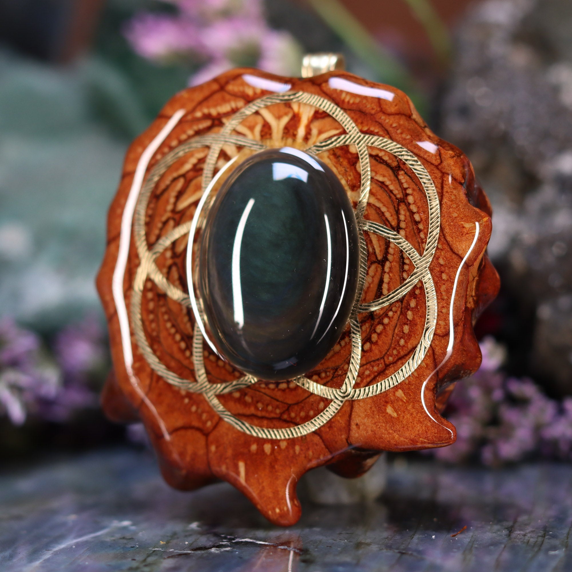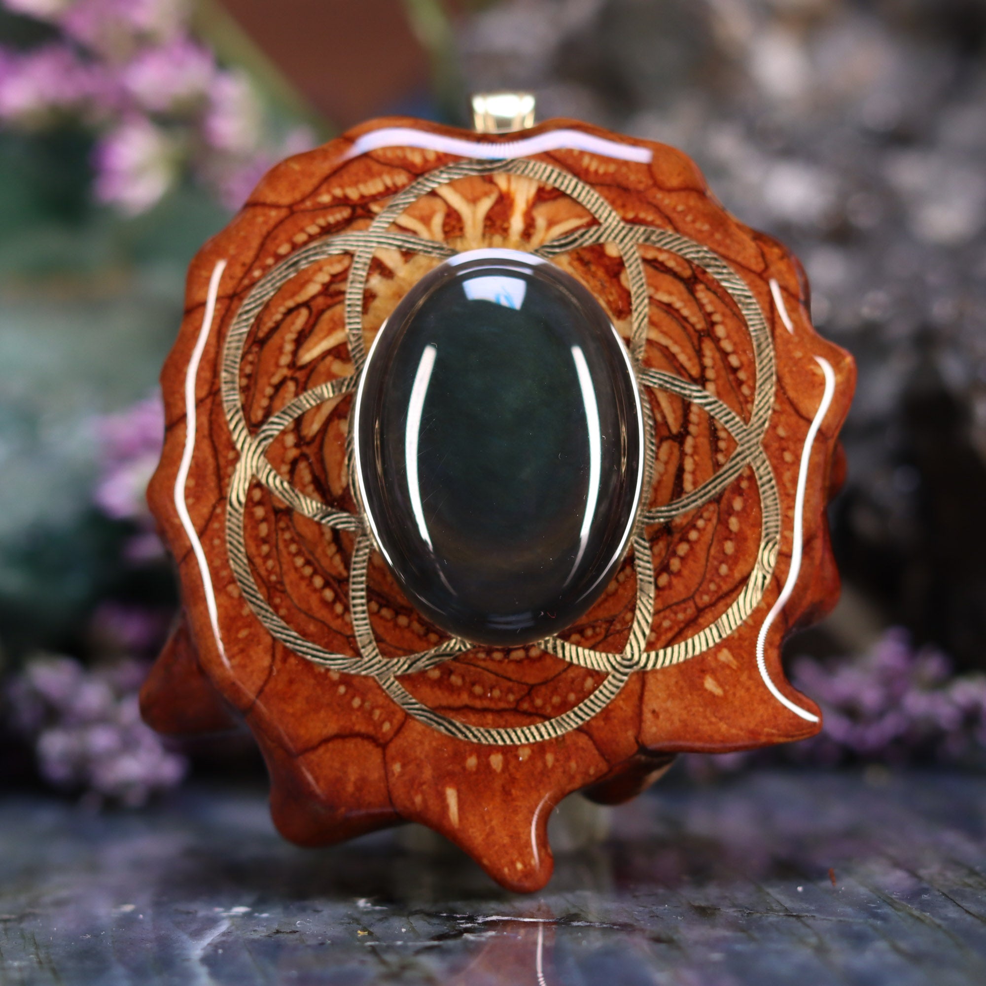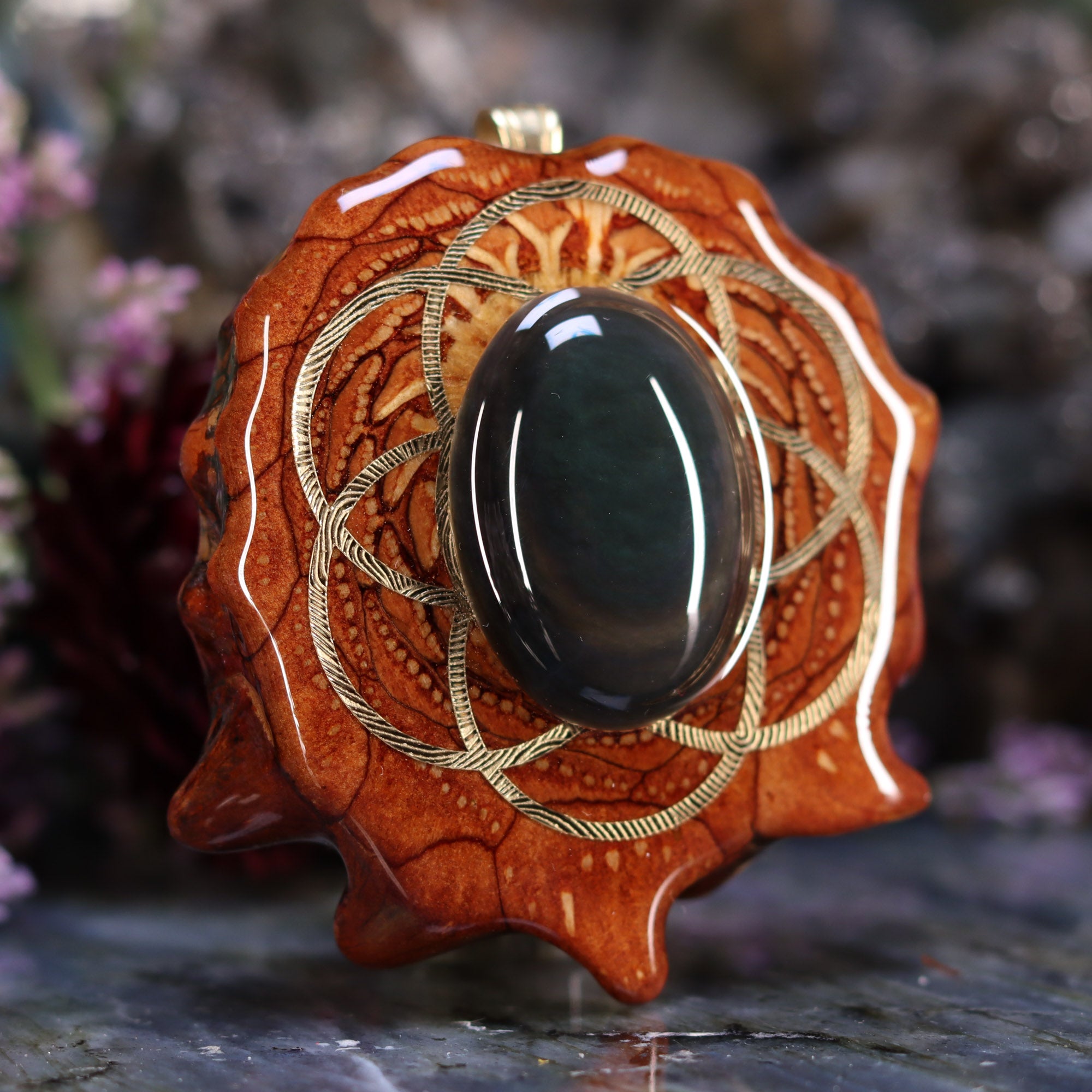 Every pinecone pendant is an elegant gift from Mother Nature -- unveiling the ornate Sacred Geometry hidden at the center of one of the world's densest Pinecones. Because only one cross-section is taken from the "heart" of each Cone, every pendant is absolutely unique, and truly one-of-a-kind.