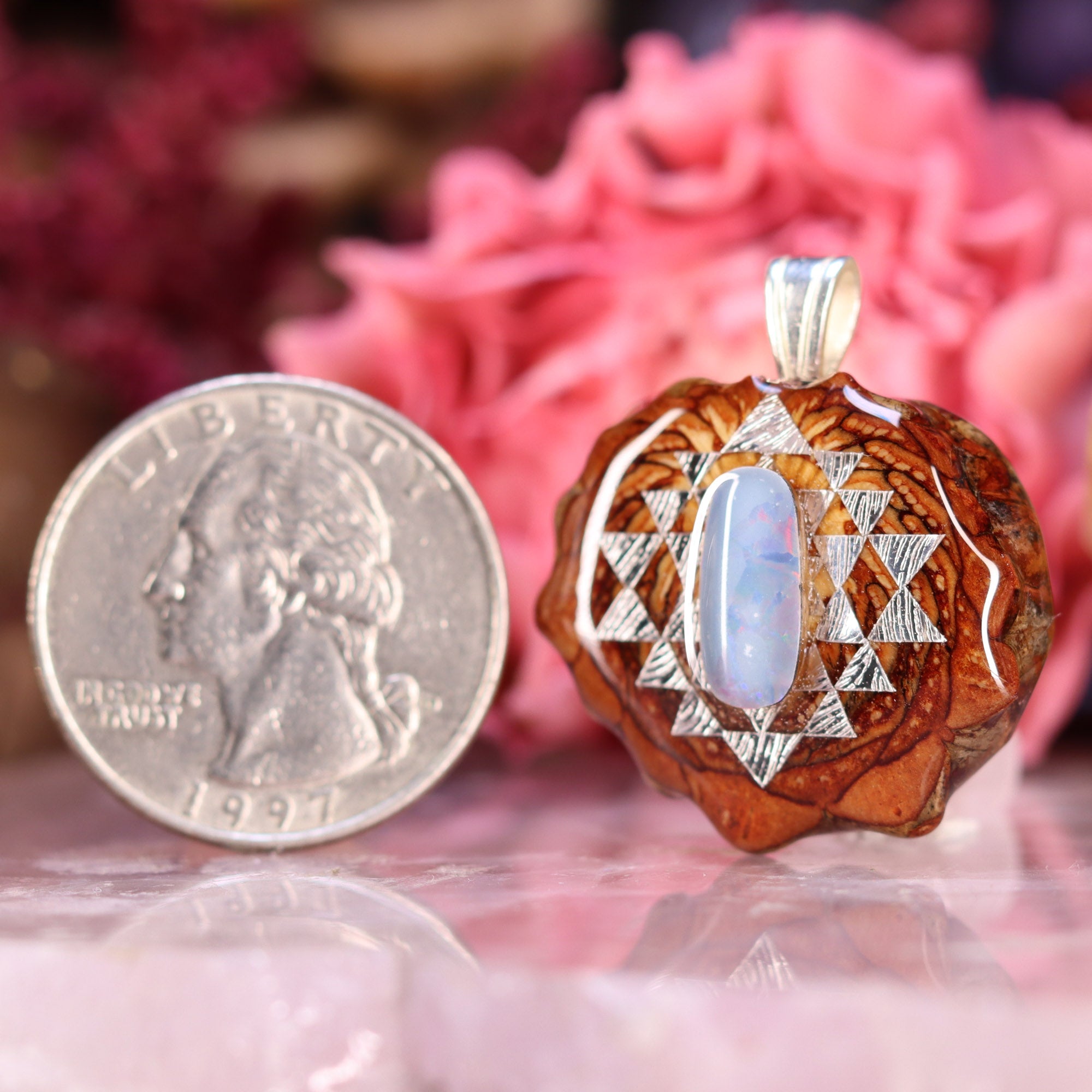 This piece bears a Sterling Silver Sri Yantra (literally meaning "holy instrument") Mandala, symbolizing the junction between the physical universe and its unmanifest source according to Hindu Mysticism. Four triangles face upwards to represent the Divine Masculine (Shiva), and five triangles face downwards to represent the Divine Feminine (Shakti). The Sri Yantra is often referred to as the Chakra Raja – King of all Chakras – making it a supreme instrument in the path of spiritual advancement.