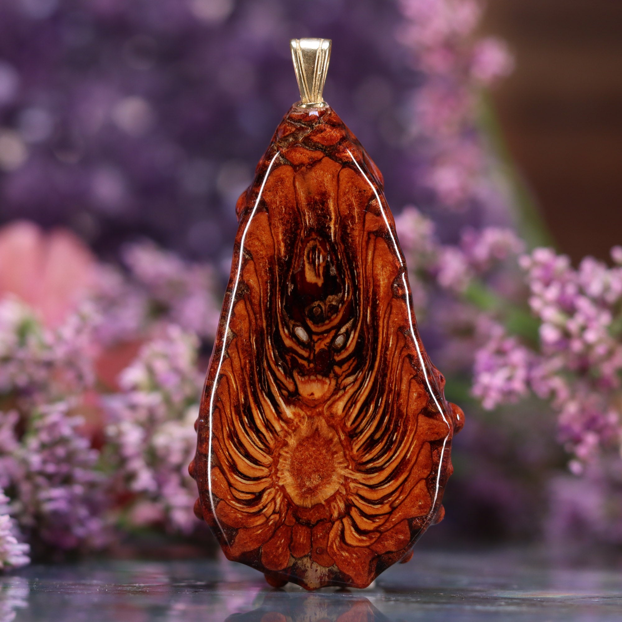 Every pinecone pendant is an elegant gift from Mother Nature -- unveiling the ornate Sacred Geometry hidden at the center of one of the world's densest Pinecones. Because only one cross-section is taken from the "heart" of each Cone, every pendant is absolutely unique, and truly one-of-a-kind.