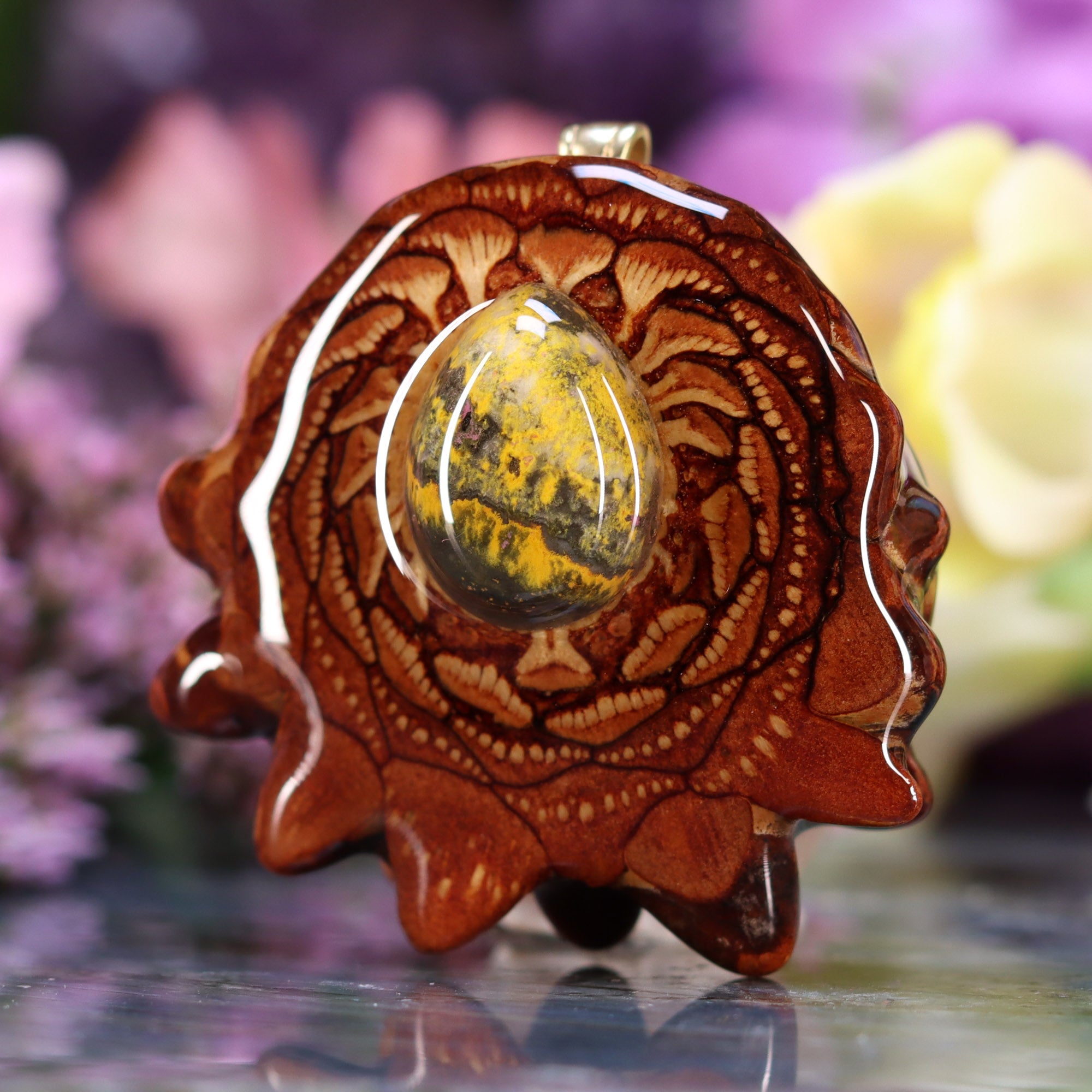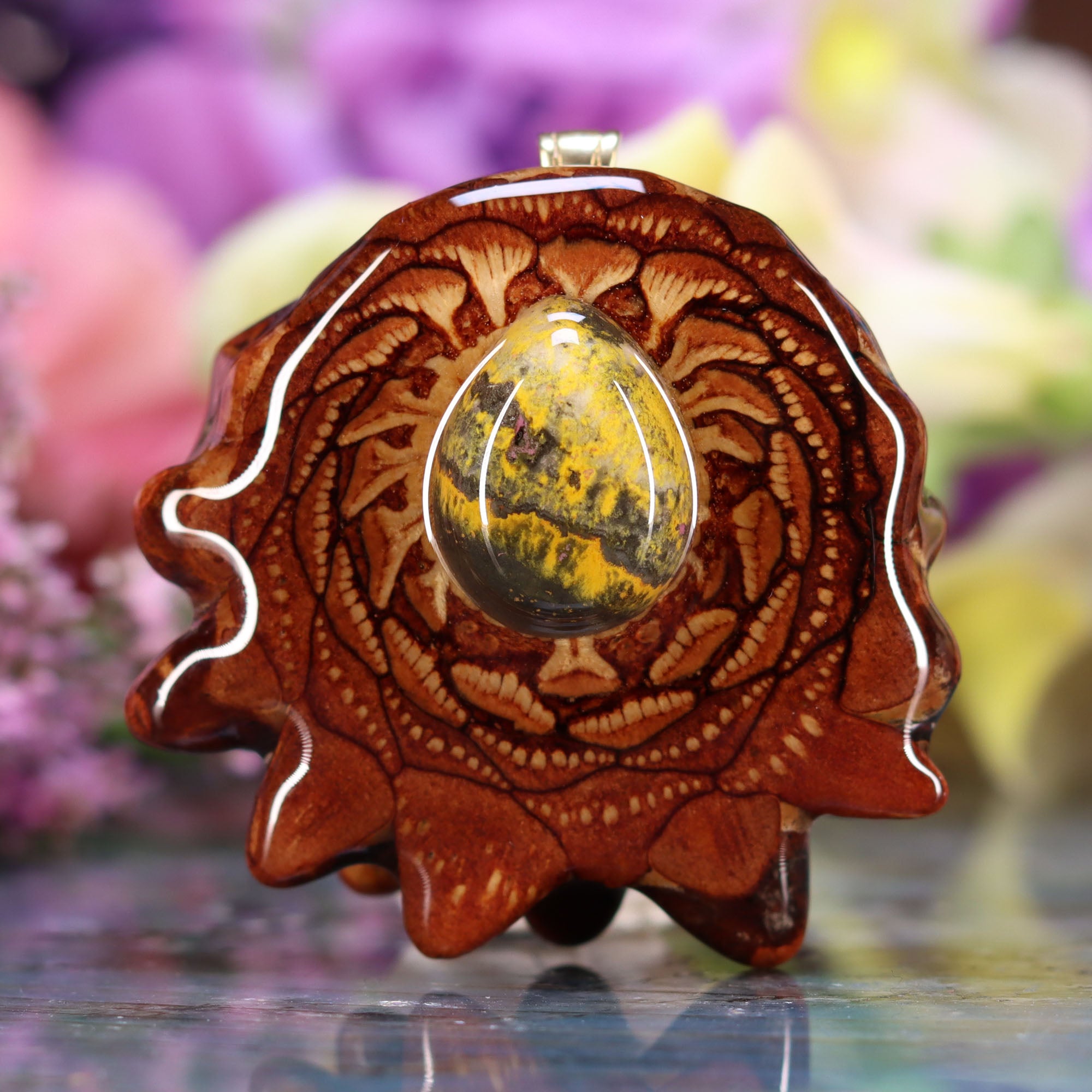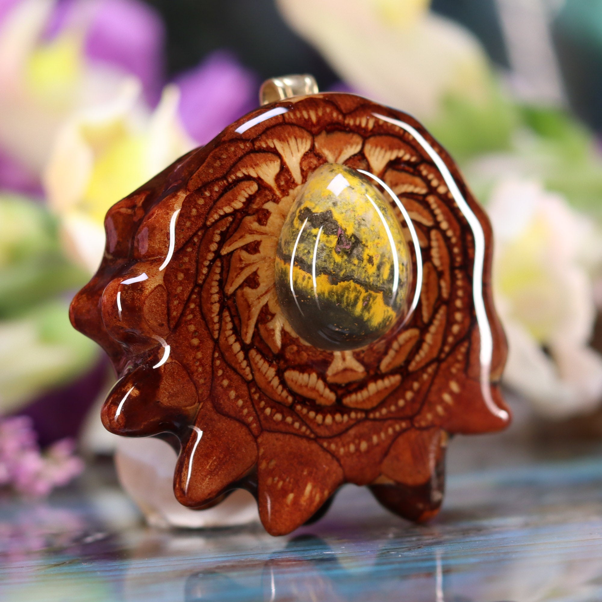 Every pinecone pendant is an elegant gift from Mother Nature -- unveiling the ornate Sacred Geometry hidden at the center of one of the world's densest Pinecones. Because only one cross-section is taken from the "heart" of each Cone, every pendant is absolutely unique, and truly one-of-a-kind.