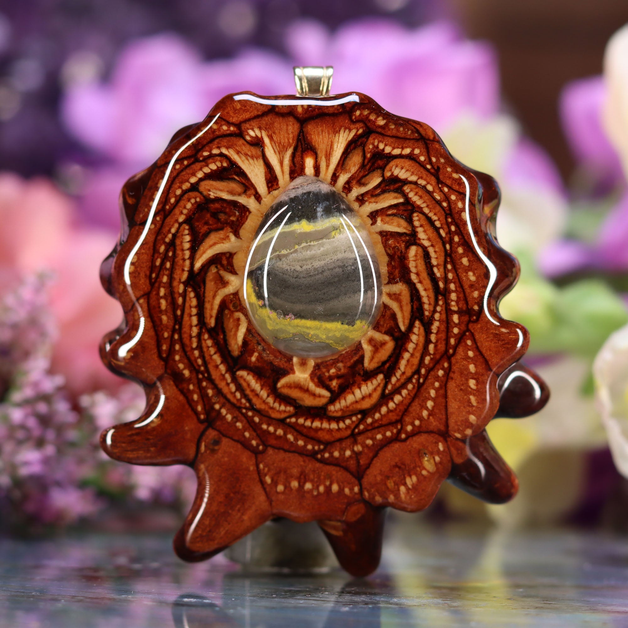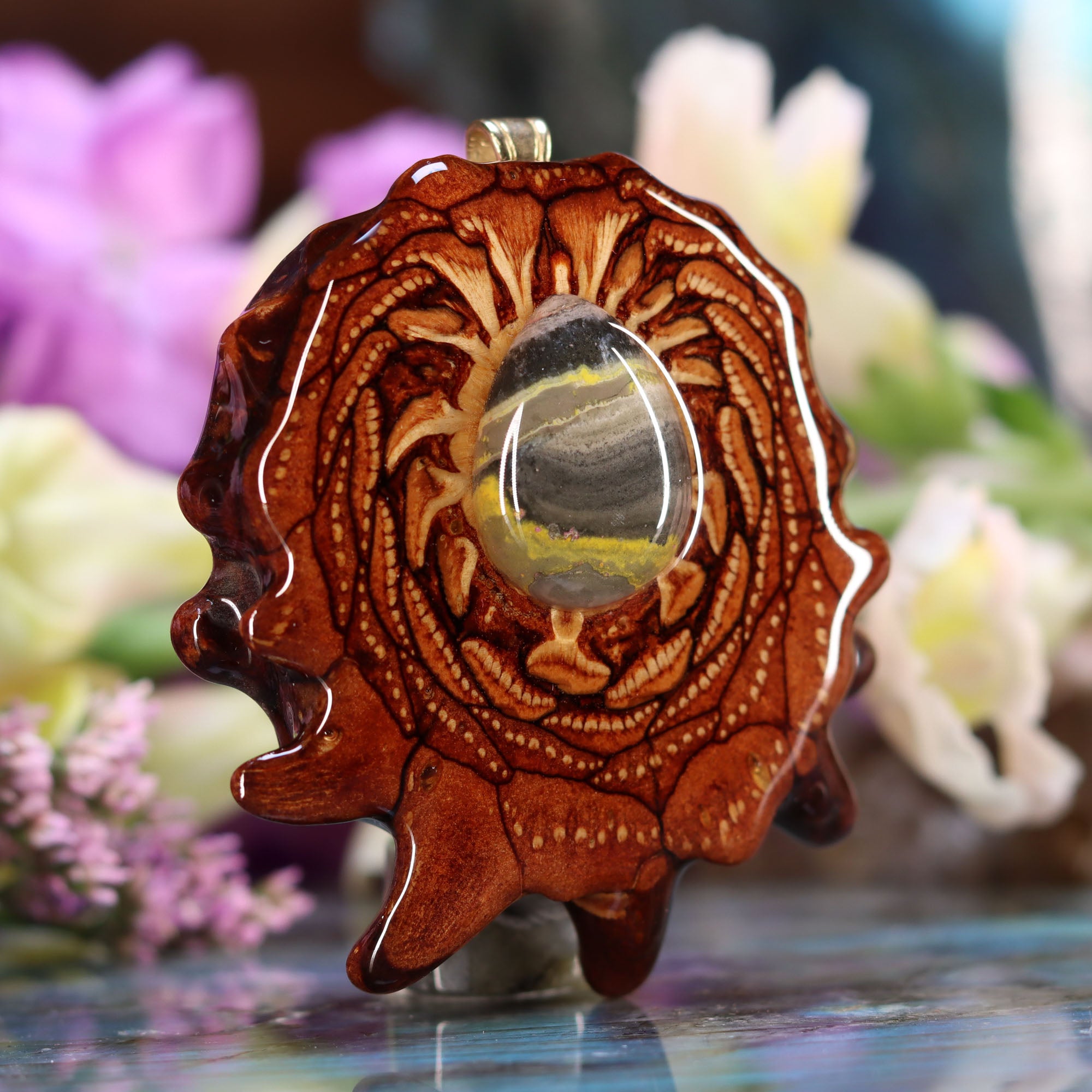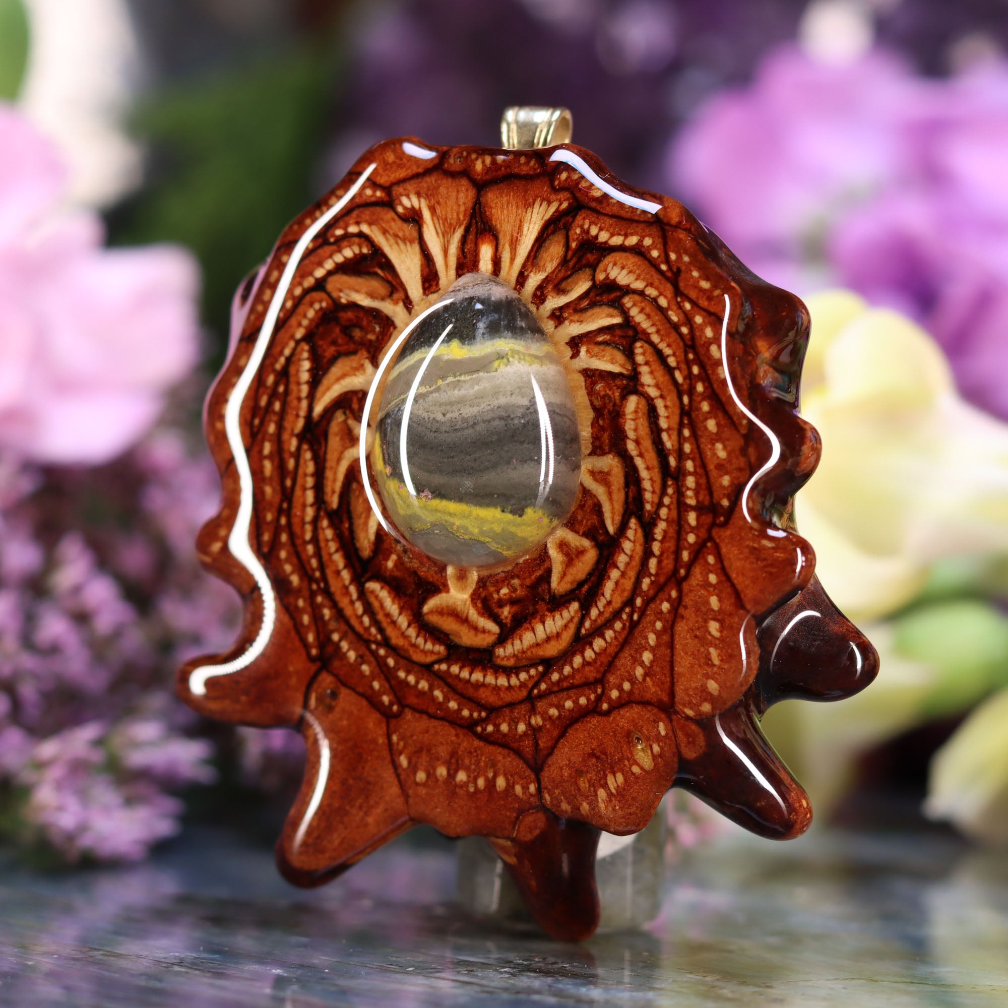 Every pinecone pendant is an elegant gift from Mother Nature -- unveiling the ornate Sacred Geometry hidden at the center of one of the world's densest Pinecones. Because only one cross-section is taken from the "heart" of each Cone, every pendant is absolutely unique, and truly one-of-a-kind.