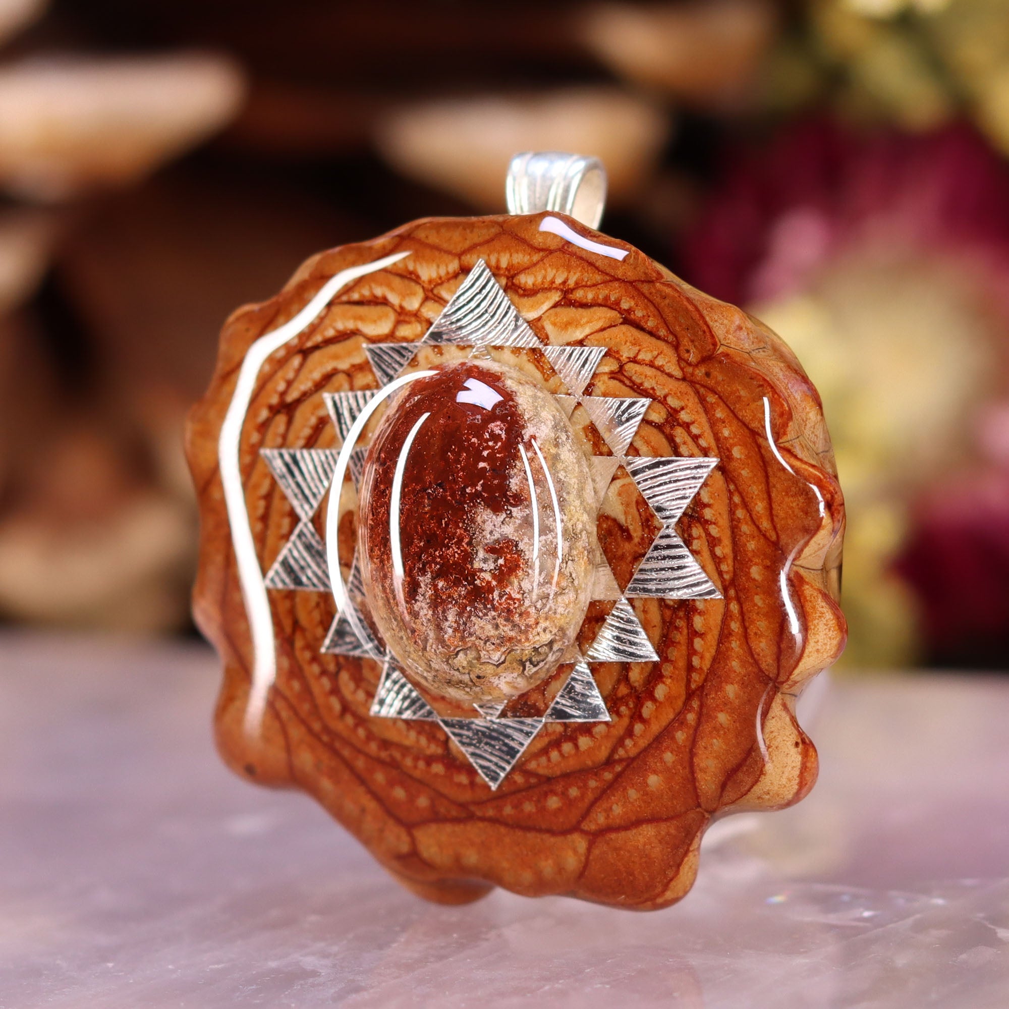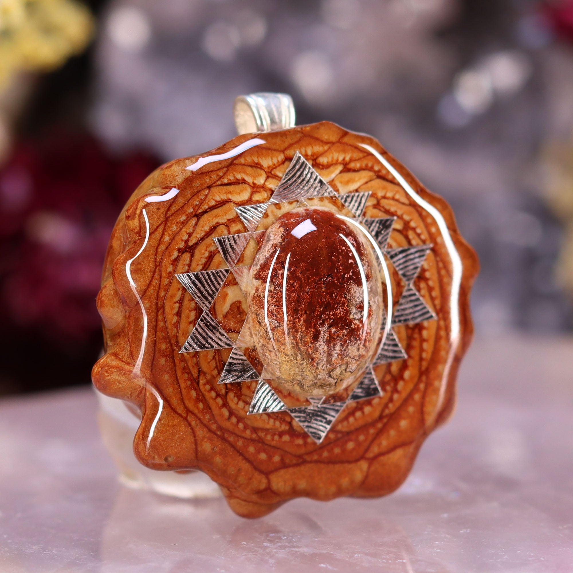 Every pinecone pendant is an elegant gift from Mother Nature -- unveiling the ornate Sacred Geometry hidden at the center of one of the world's densest Pinecones. Because only one cross-section is taken from the "heart" of each Cone, every pendant is absolutely unique, and truly one-of-a-kind.