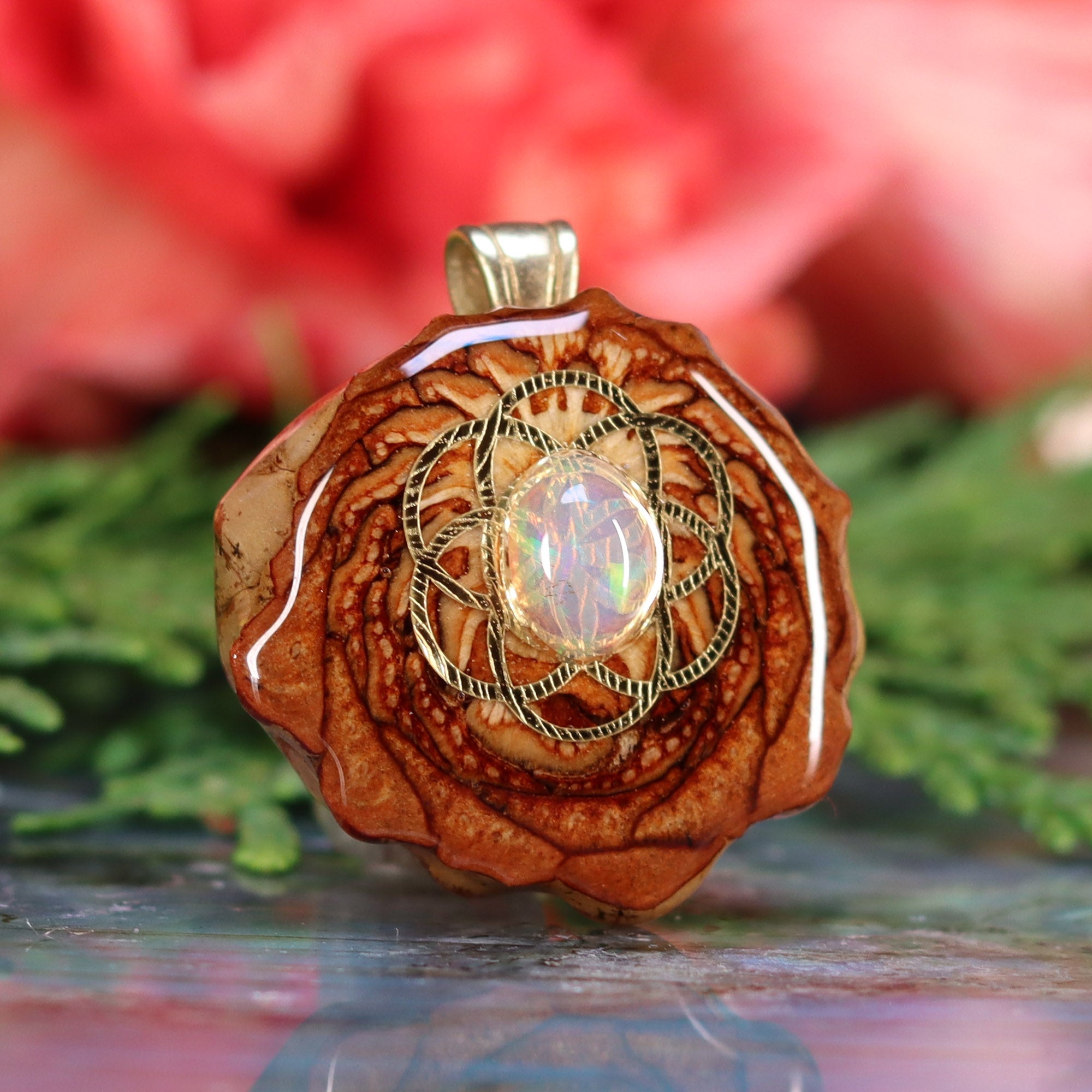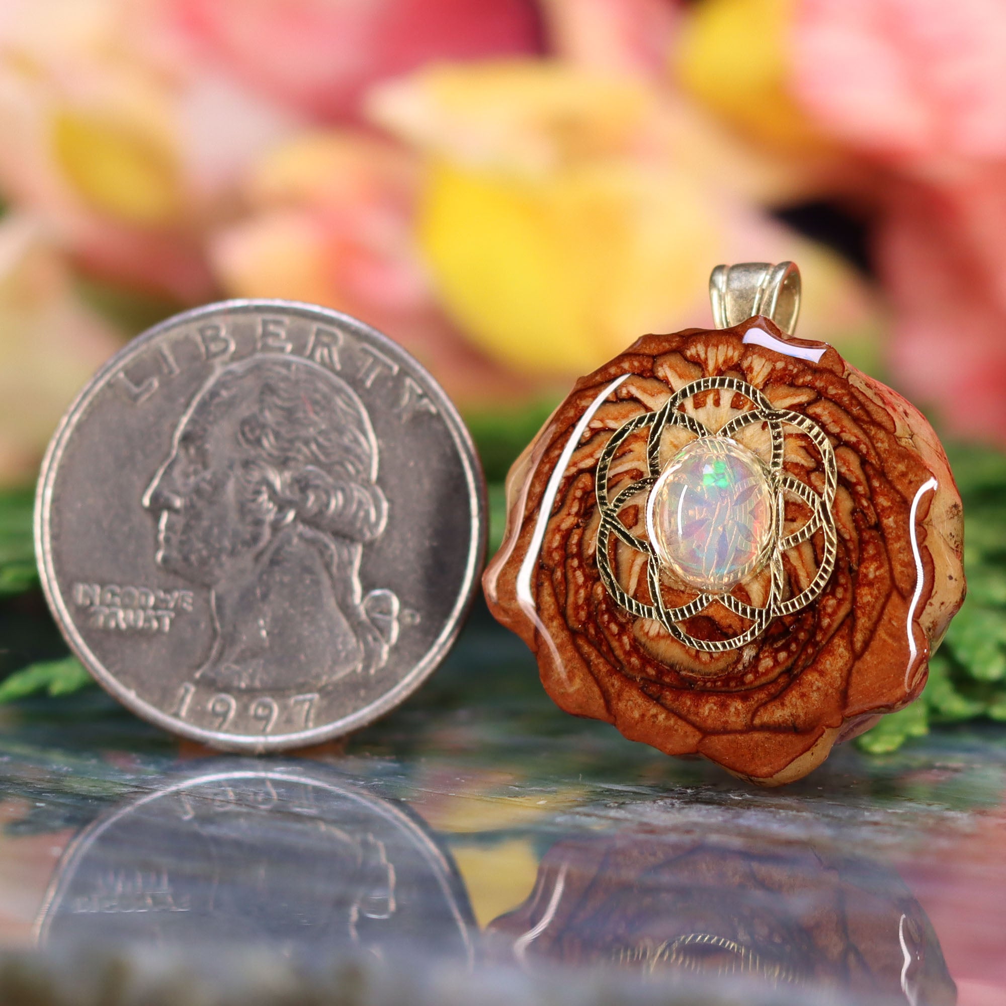 Every pinecone pendant is an elegant gift from Mother Nature -- unveiling the ornate Sacred Geometry hidden at the center of one of the world's densest Pinecones. Because only one cross-section is taken from the "heart" of each Cone, every pendant is absolutely unique, and truly one-of-a-kind.
