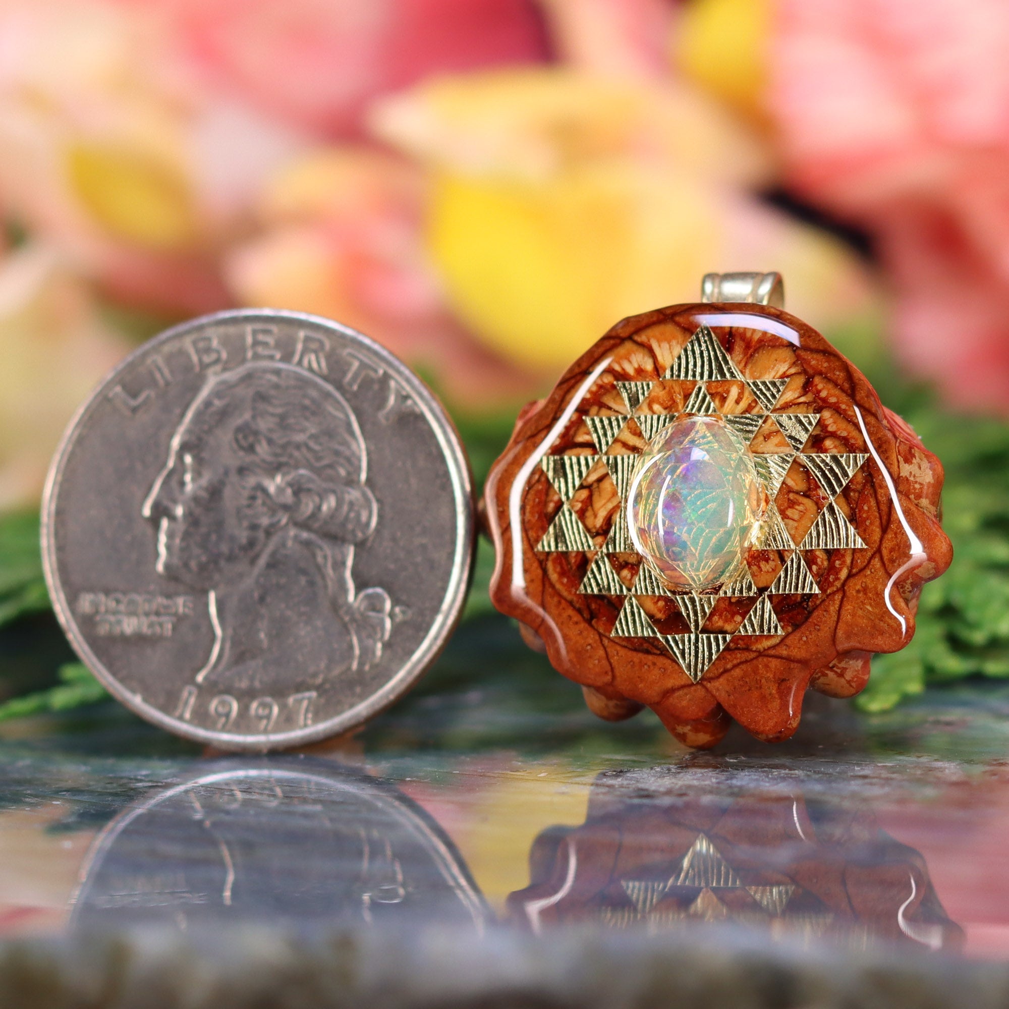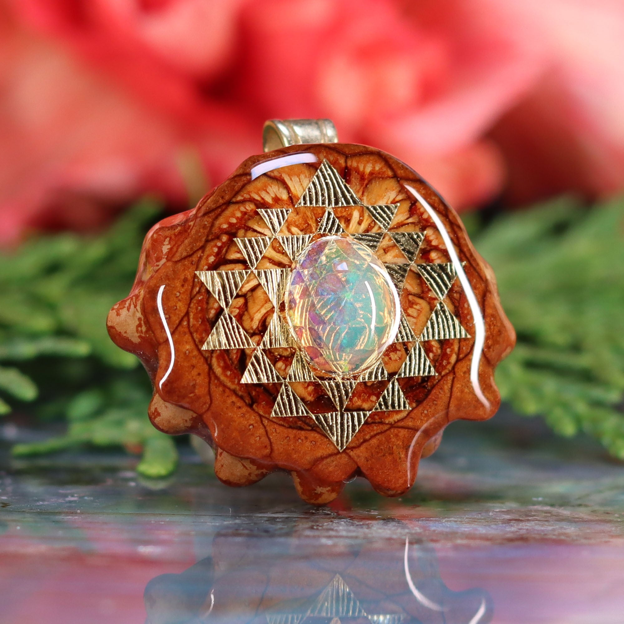 Every pinecone pendant is an elegant gift from Mother Nature -- unveiling the ornate Sacred Geometry hidden at the center of one of the world's densest Pinecones. Because only one cross-section is taken from the "heart" of each Cone, every pendant is absolutely unique, and truly one-of-a-kind.
