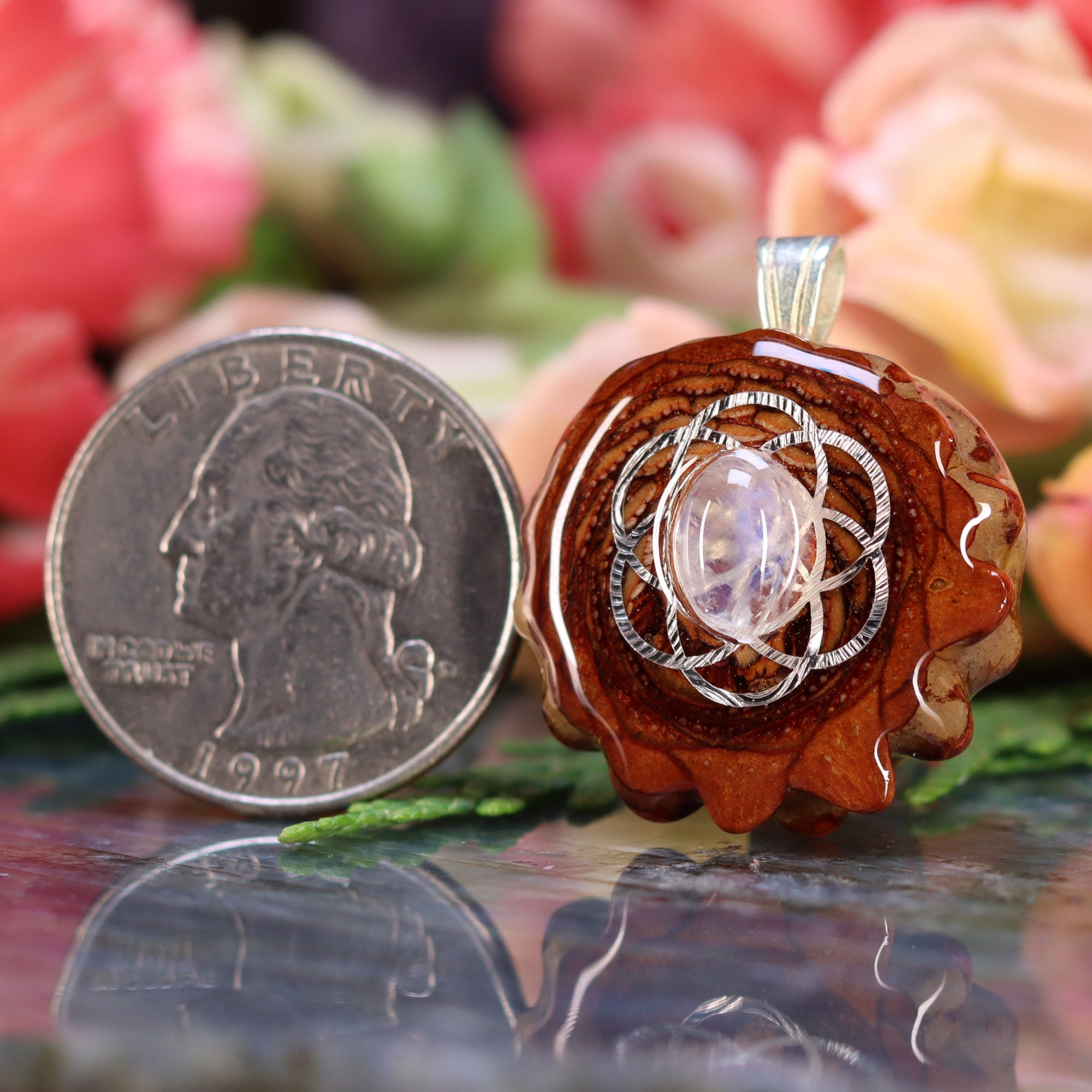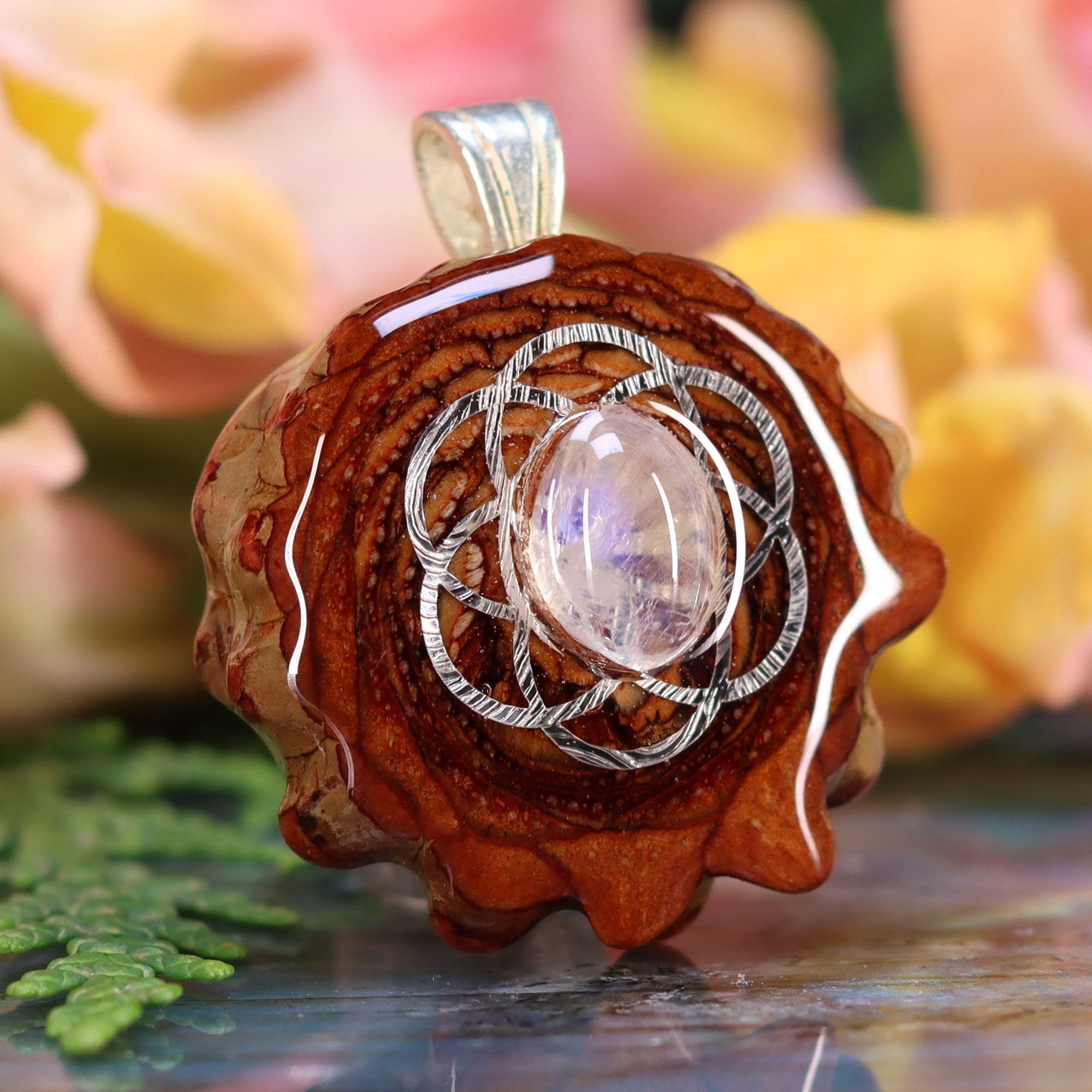 Every pinecone pendant is an elegant gift from Mother Nature -- unveiling the ornate Sacred Geometry hidden at the center of one of the world's densest Pinecones. Because only one cross-section is taken from the "heart" of each Cone, every pendant is absolutely unique, and truly one-of-a-kind.