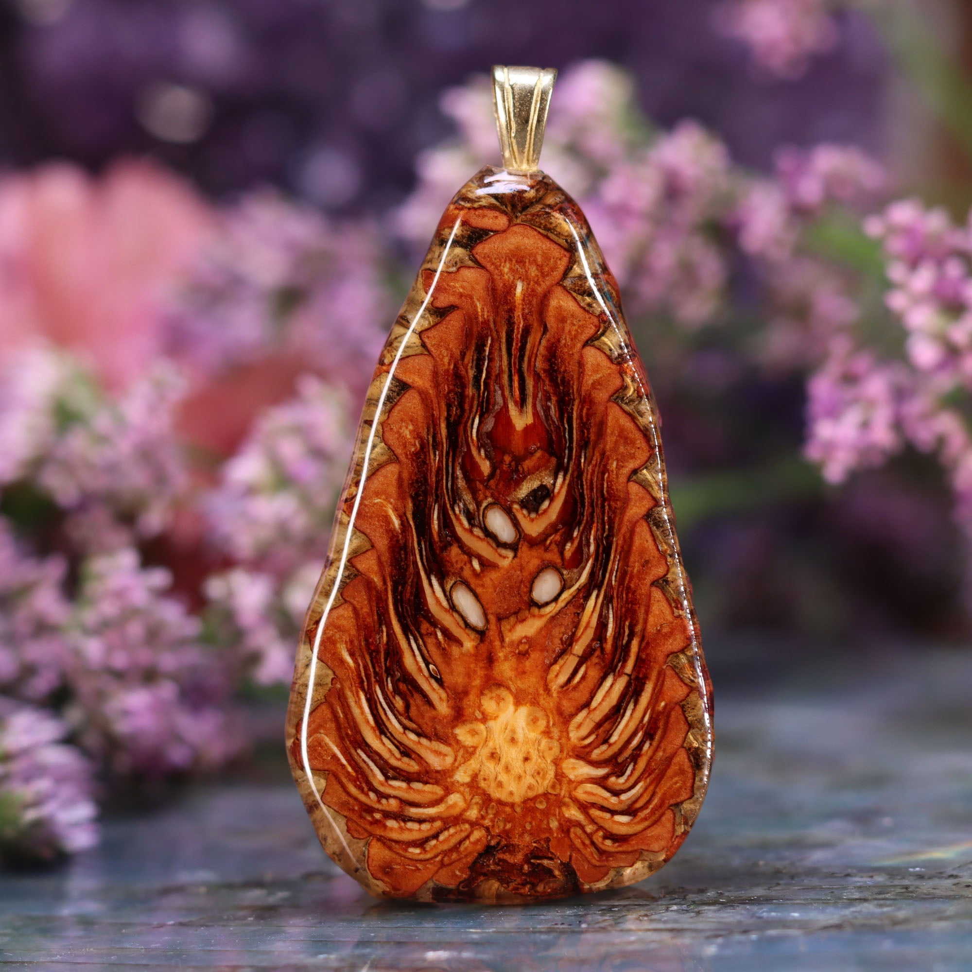 Our *new* Teardrop-style pendants reveal an elegant, angular pattern, only visible within the diagonal cross-section of specifically-shaped Pinecones. Due to the beautiful, diverse patterns displayed on both the front and back of these unique pendants, we’ve photographed both sides of these truly “reversible” new designs!