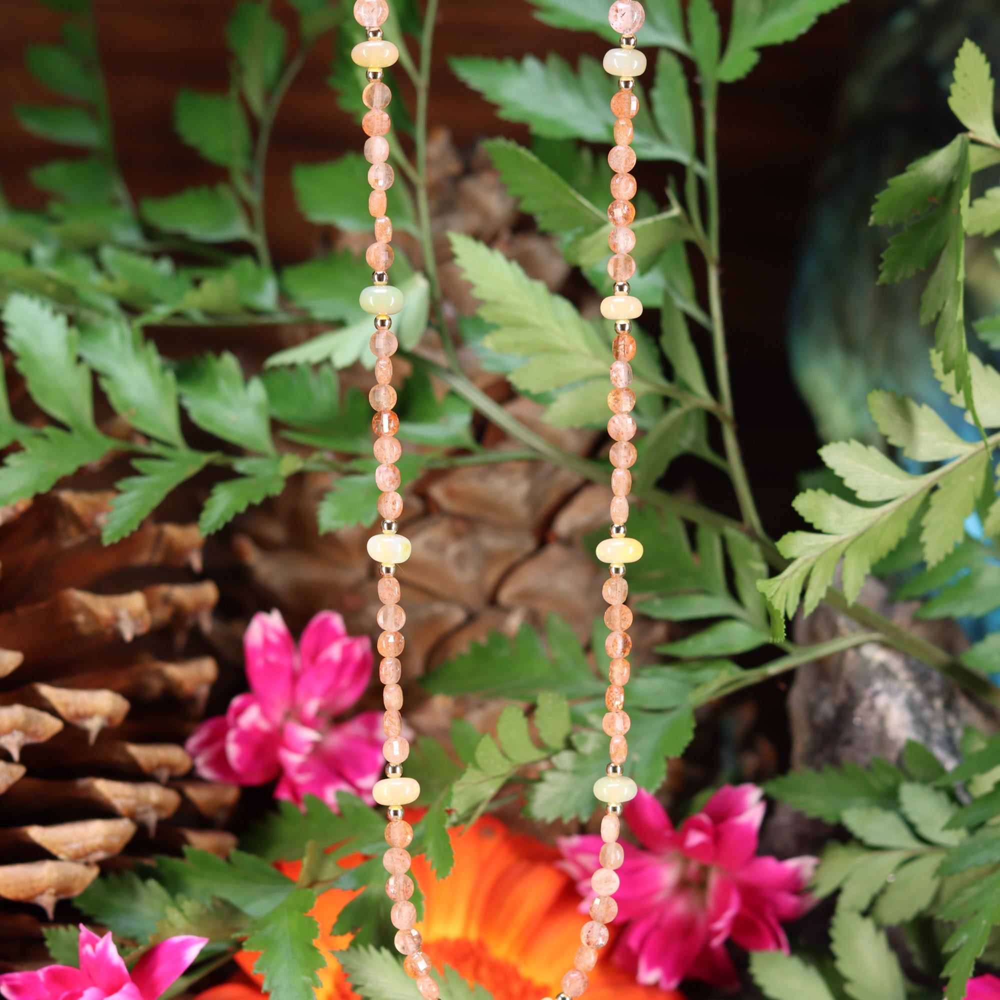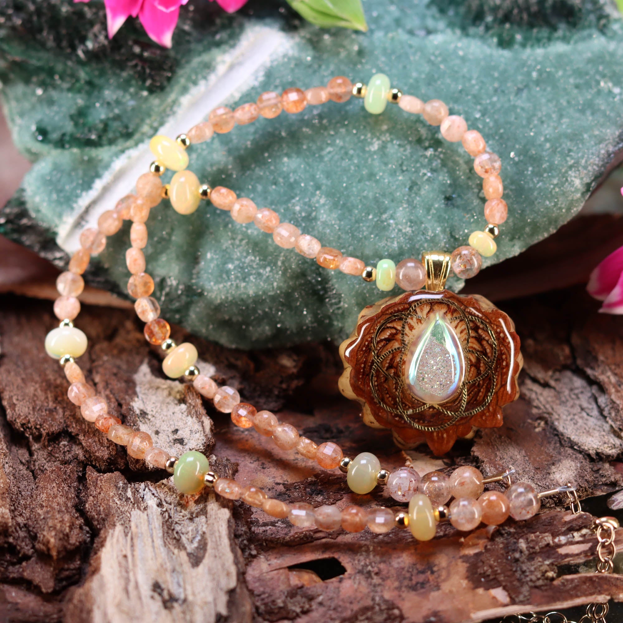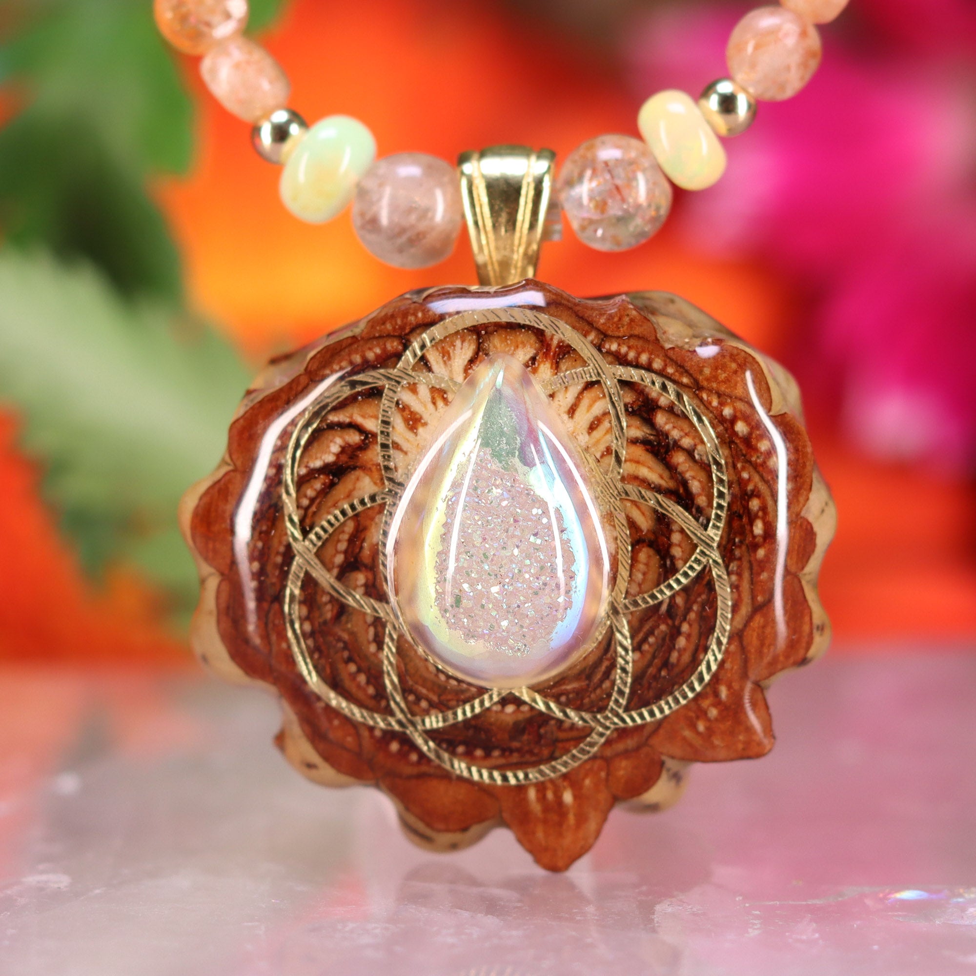 This necklace measures 14-17 inches (36-43 cm) and features a White Druzy Quartz with Gold Seed of Life pendant lovingly strung with a 3-inch length-adjustable 14k Gold Fill chain with Sunstone and Ethiopian Opal beads to activate and energize body, mind and spirit!