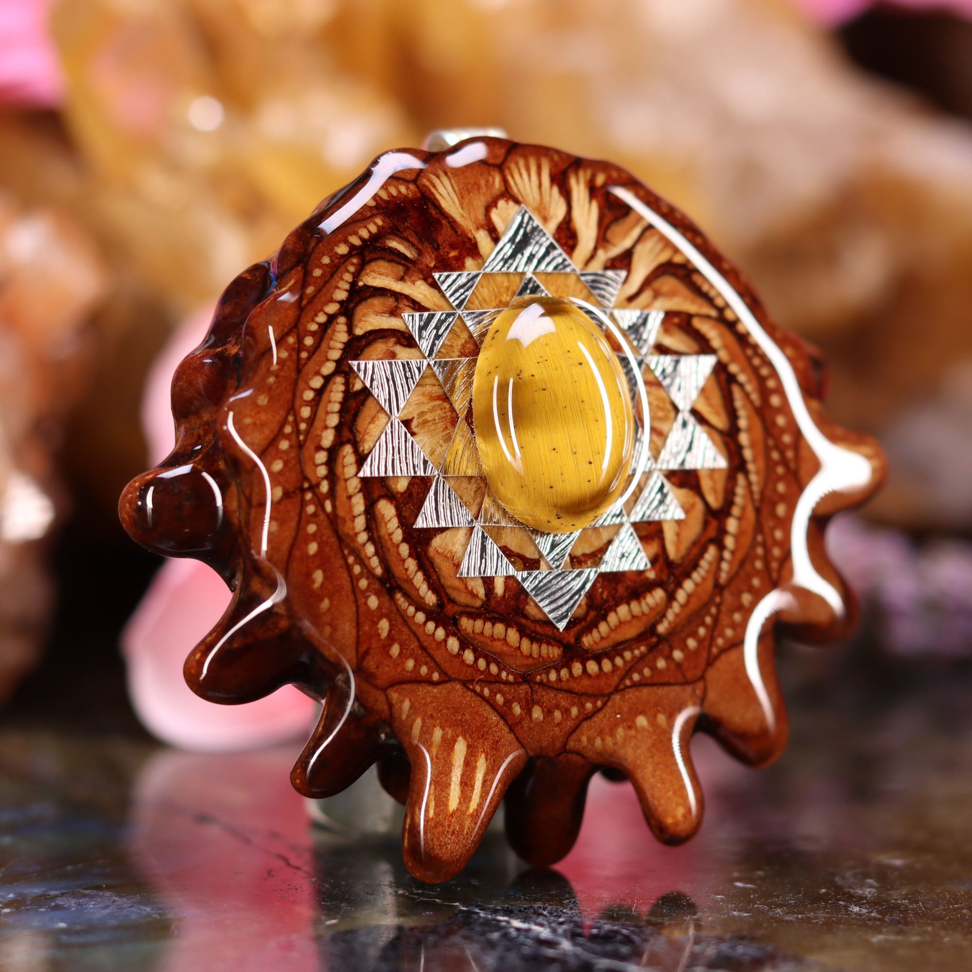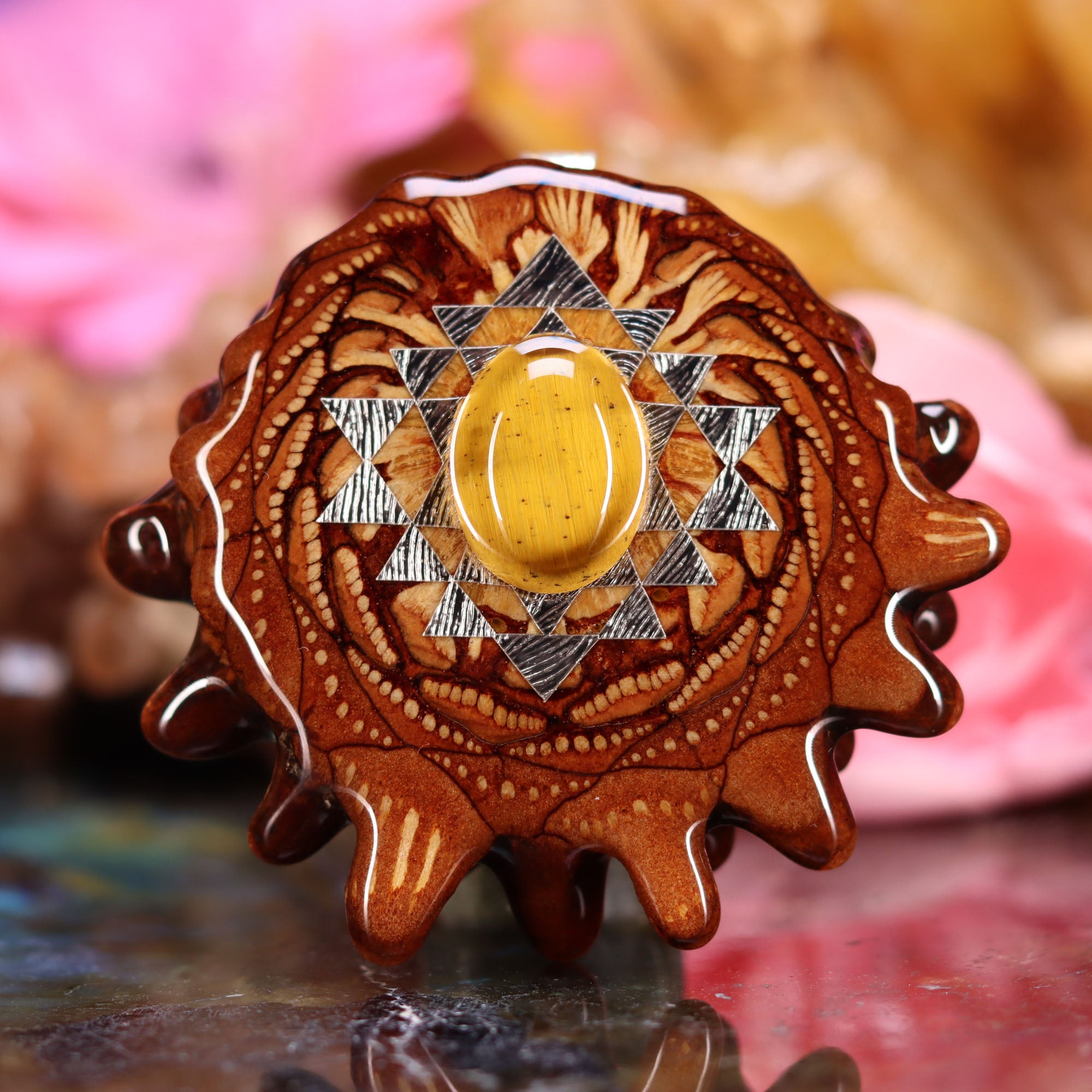 This piece bears a Sterling Silver Sri Yantra (literally meaning "holy instrument") Mandala, symbolizing the junction between the physical universe and its unmanifest source according to Hindu Mysticism. Four triangles face upwards to represent the Divine Masculine (Shiva), and five triangles face downwards to represent the Divine Feminine (Shakti). The Sri Yantra is often referred to as the Chakra Raja – King of all Chakras – making it a supreme instrument in the path of spiritual advancement.