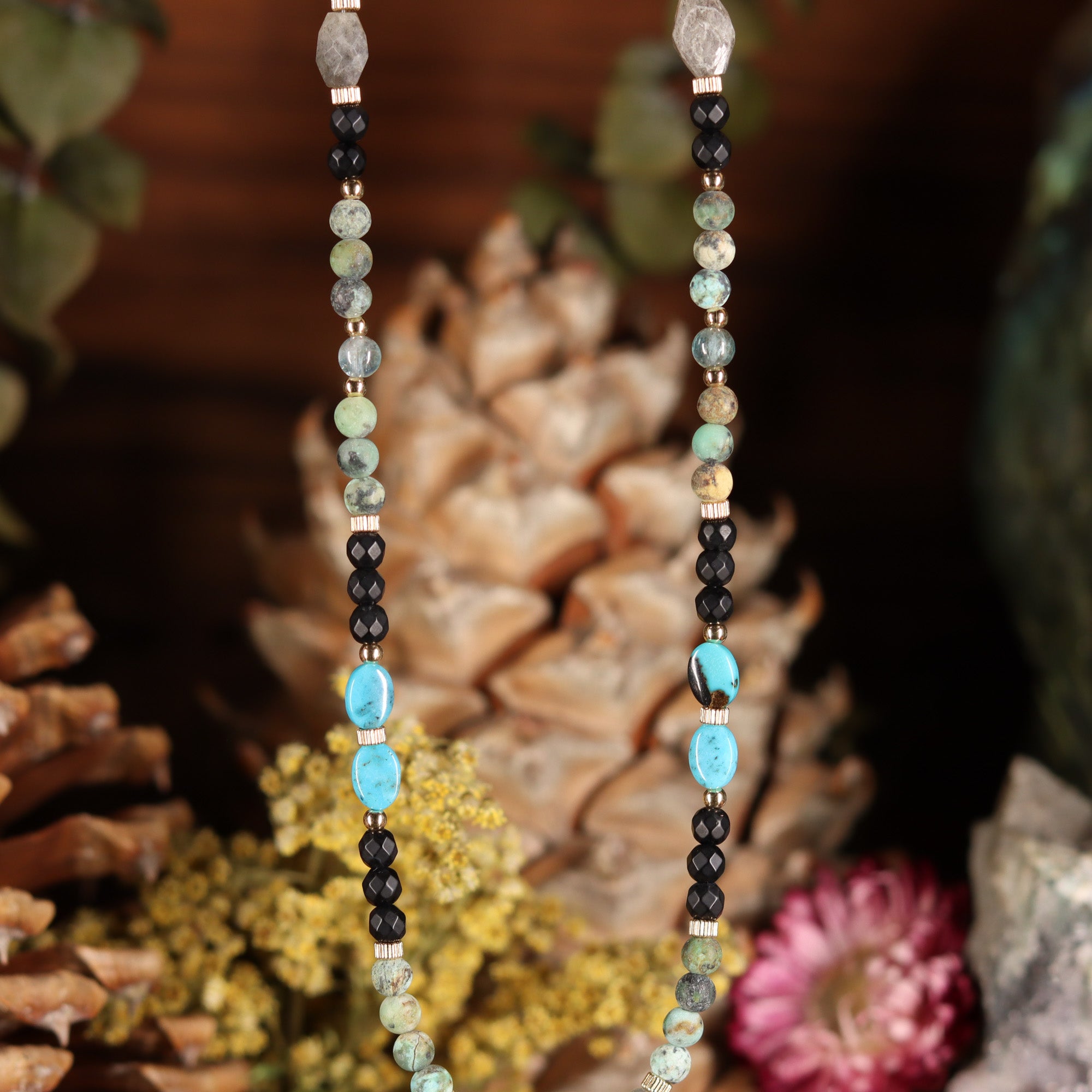 This necklace measures 11.25 inches (28.5 cm) and features an Amber Bee pendant lovingly strung with a 3-inch length-adjustable 14k Gold Fill chain with Aquamarine, Turquoise, Matte Onyx, and Labradorite beads to activate and energize body, mind and spirit!
