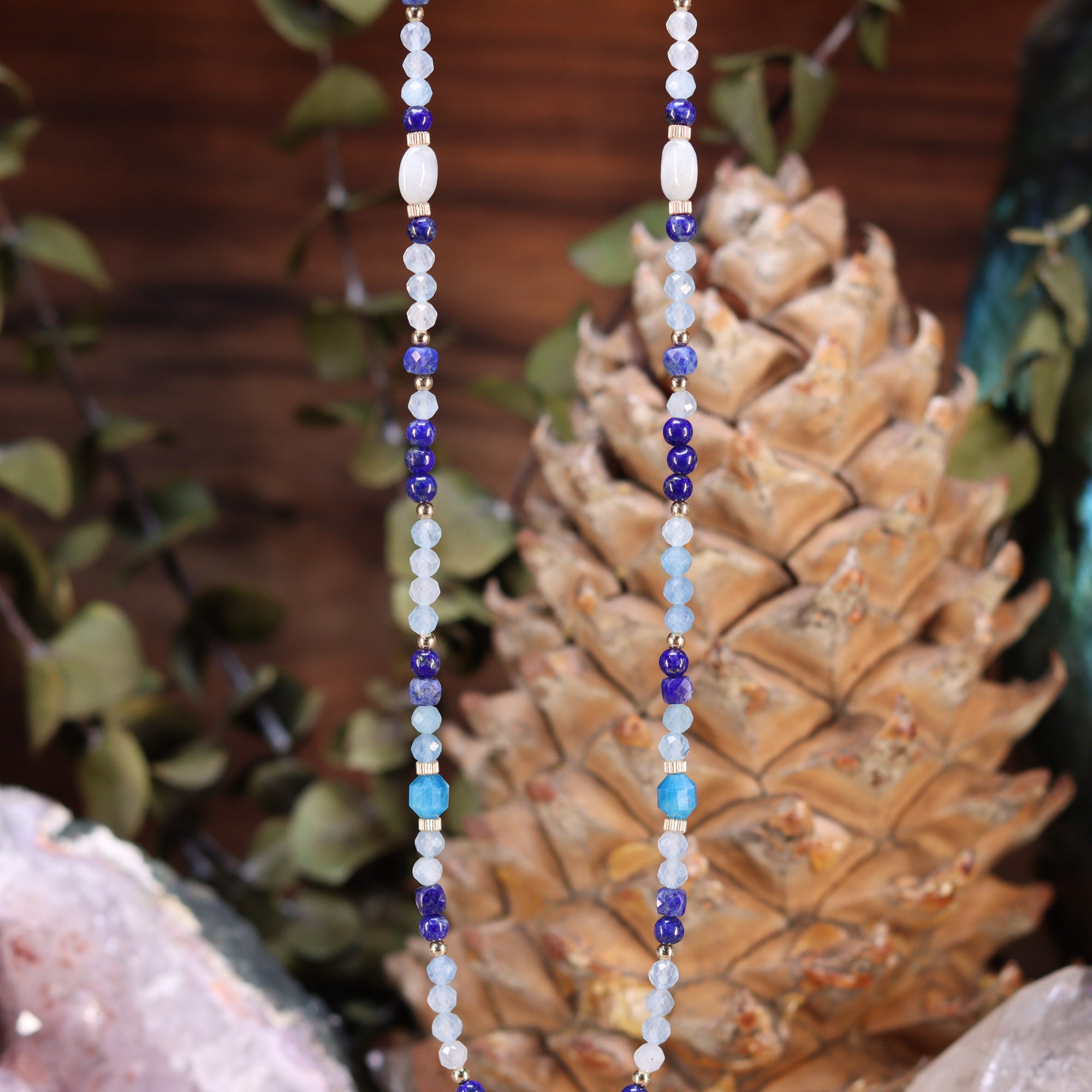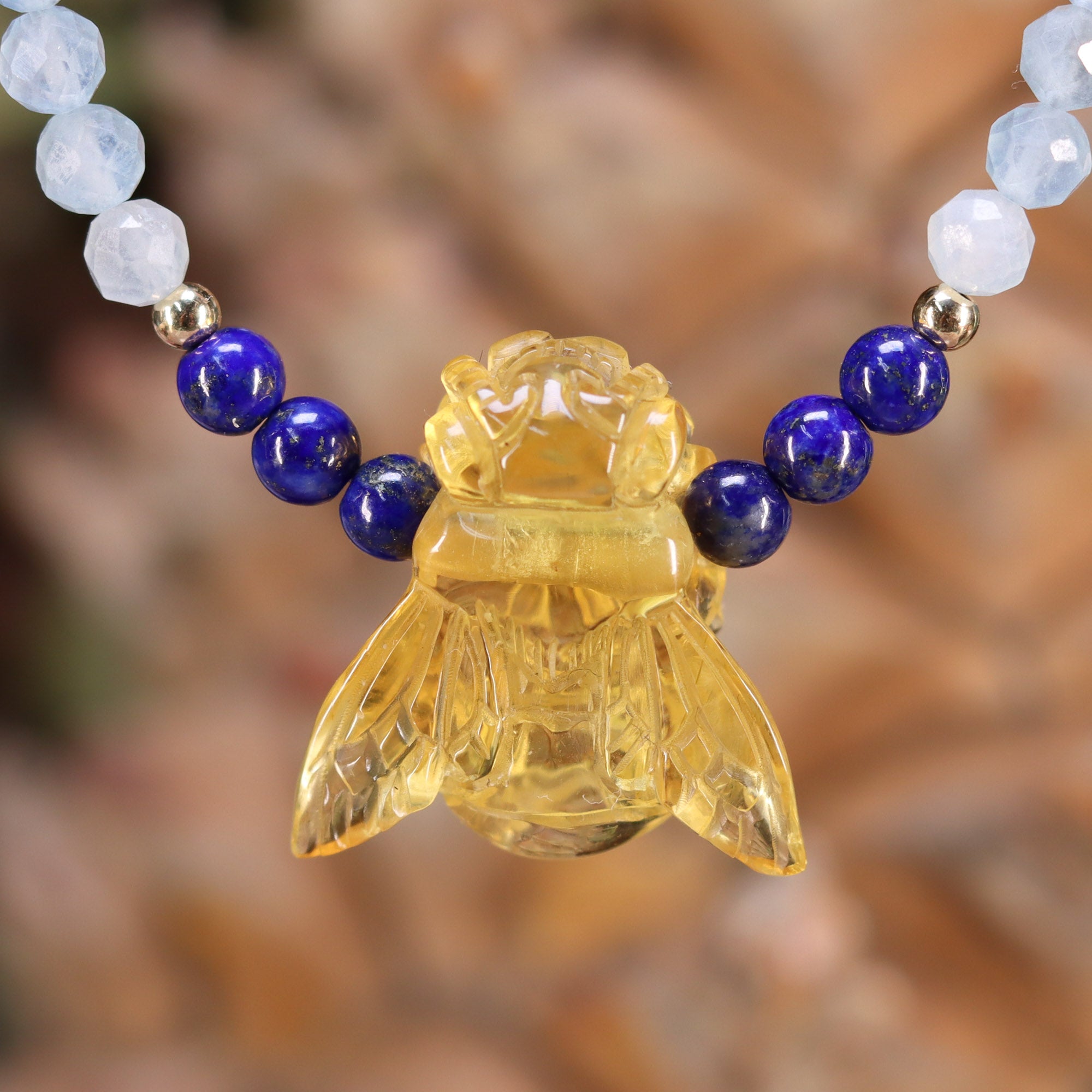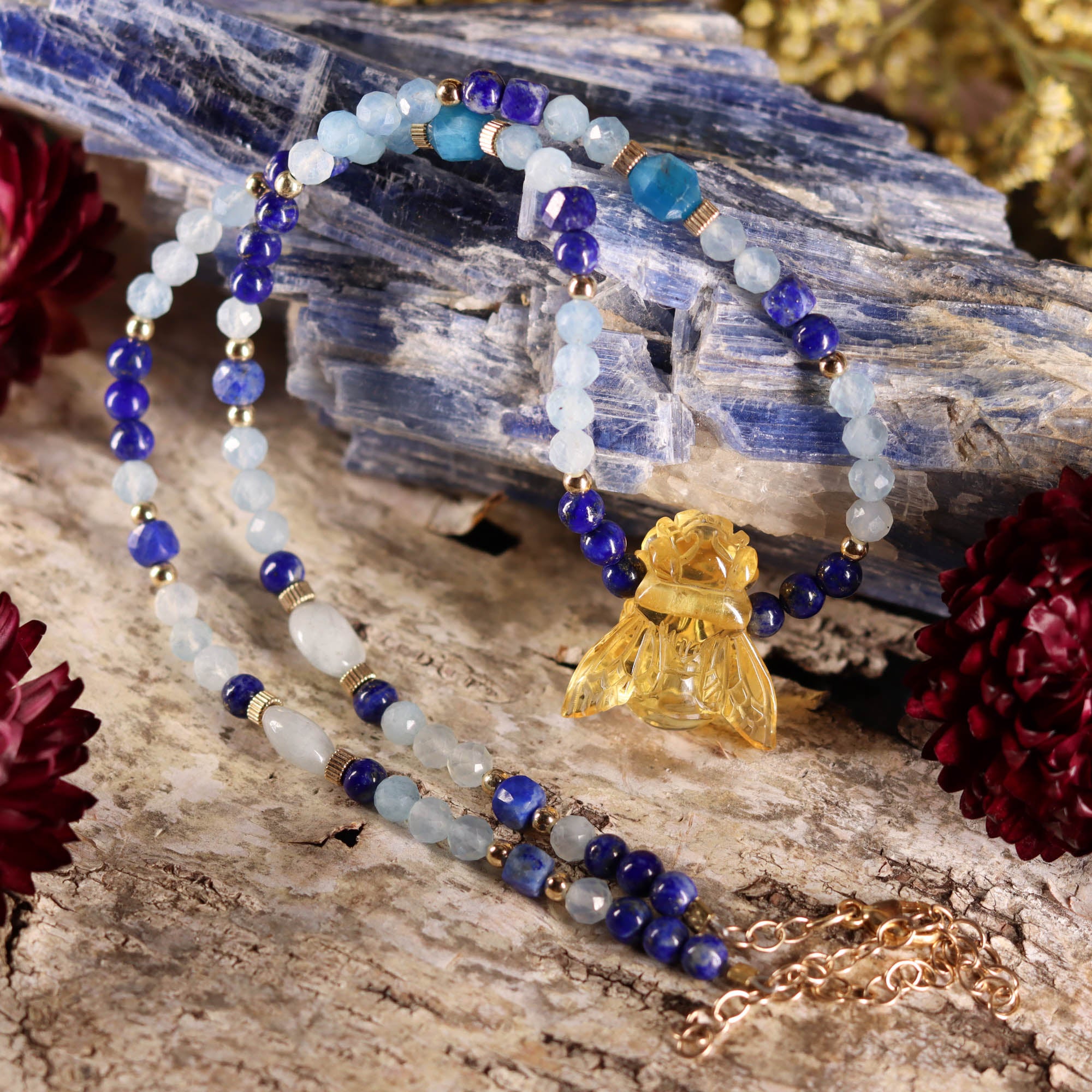 This necklace measures 14.5 inches (37 cm) and features an Amber Bee pendant lovingly strung with a 3-inch length-adjustable 14k Gold Fill chain with Lapis Lazuli, Aquamarine, and Blue Apatite beads to activate and energize body, mind and spirit!