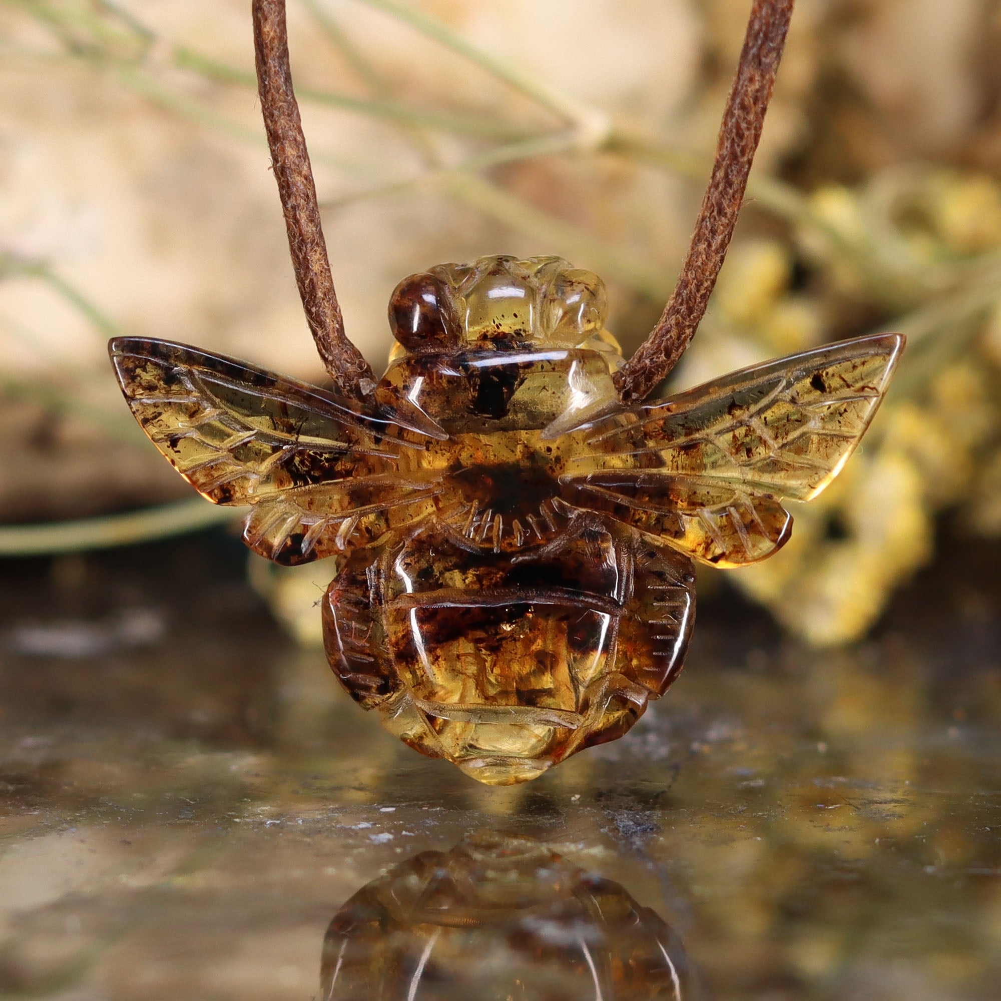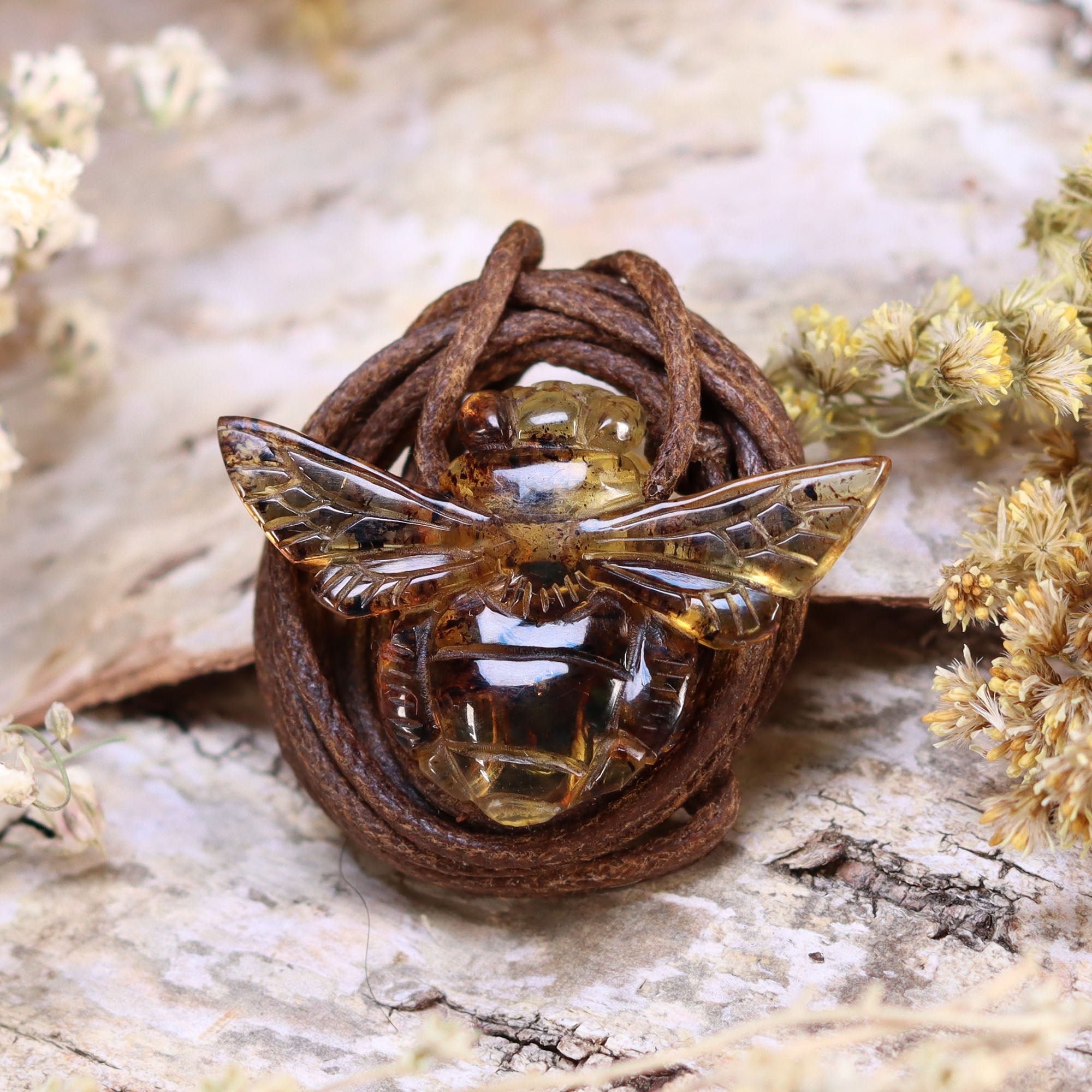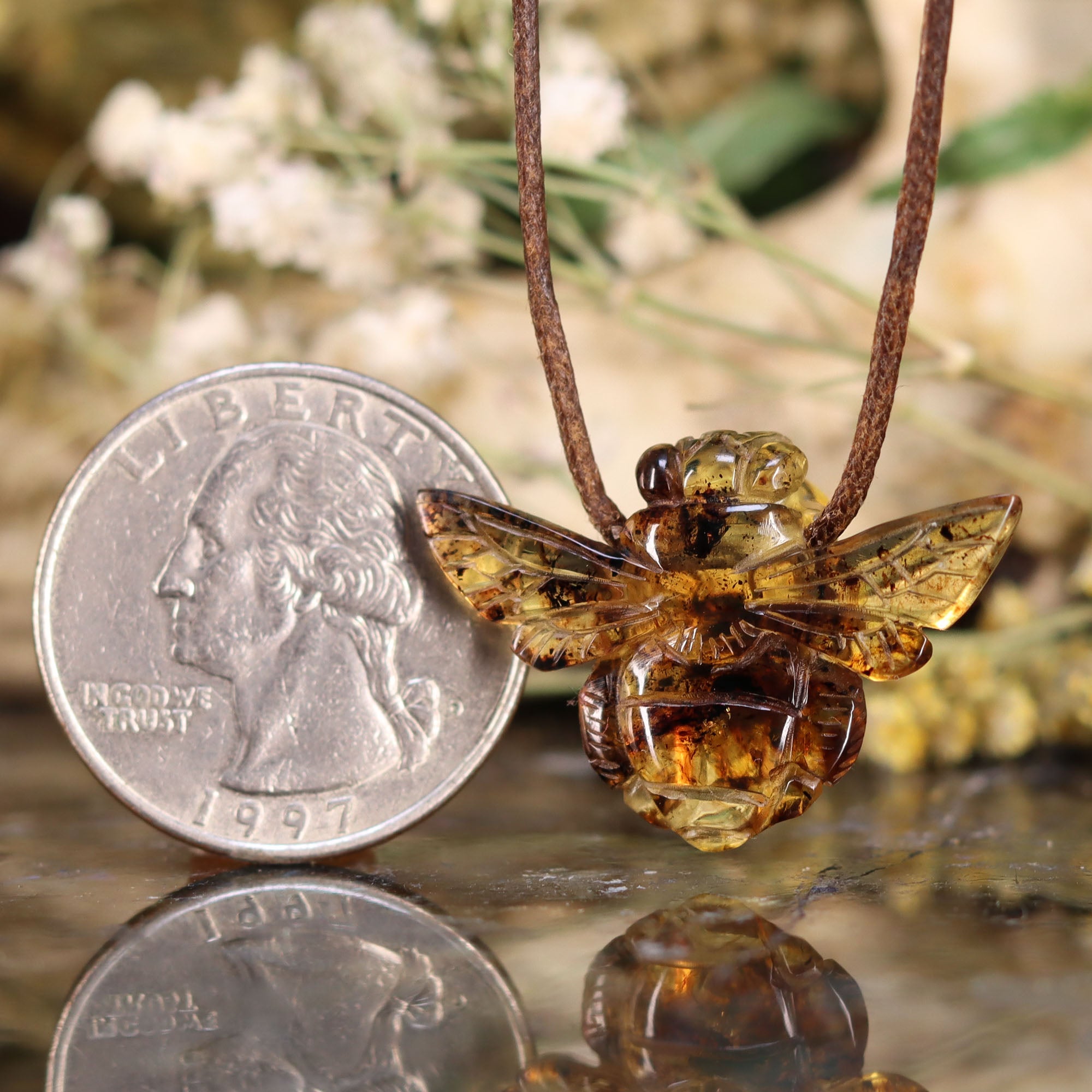 Hand-carved from translucent Amber, each honey-bee is entirely unique -- providing a one-of-a-kind connection to the potent, healing energy of the Bee.