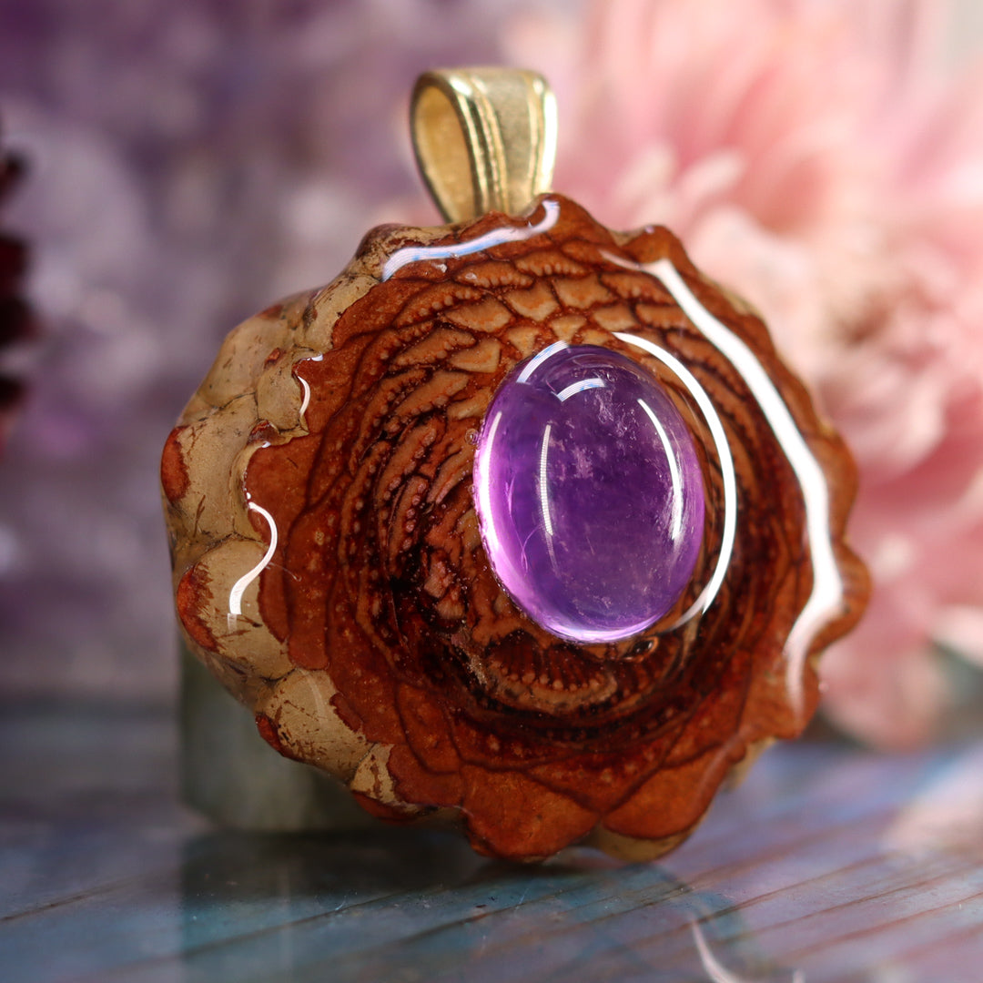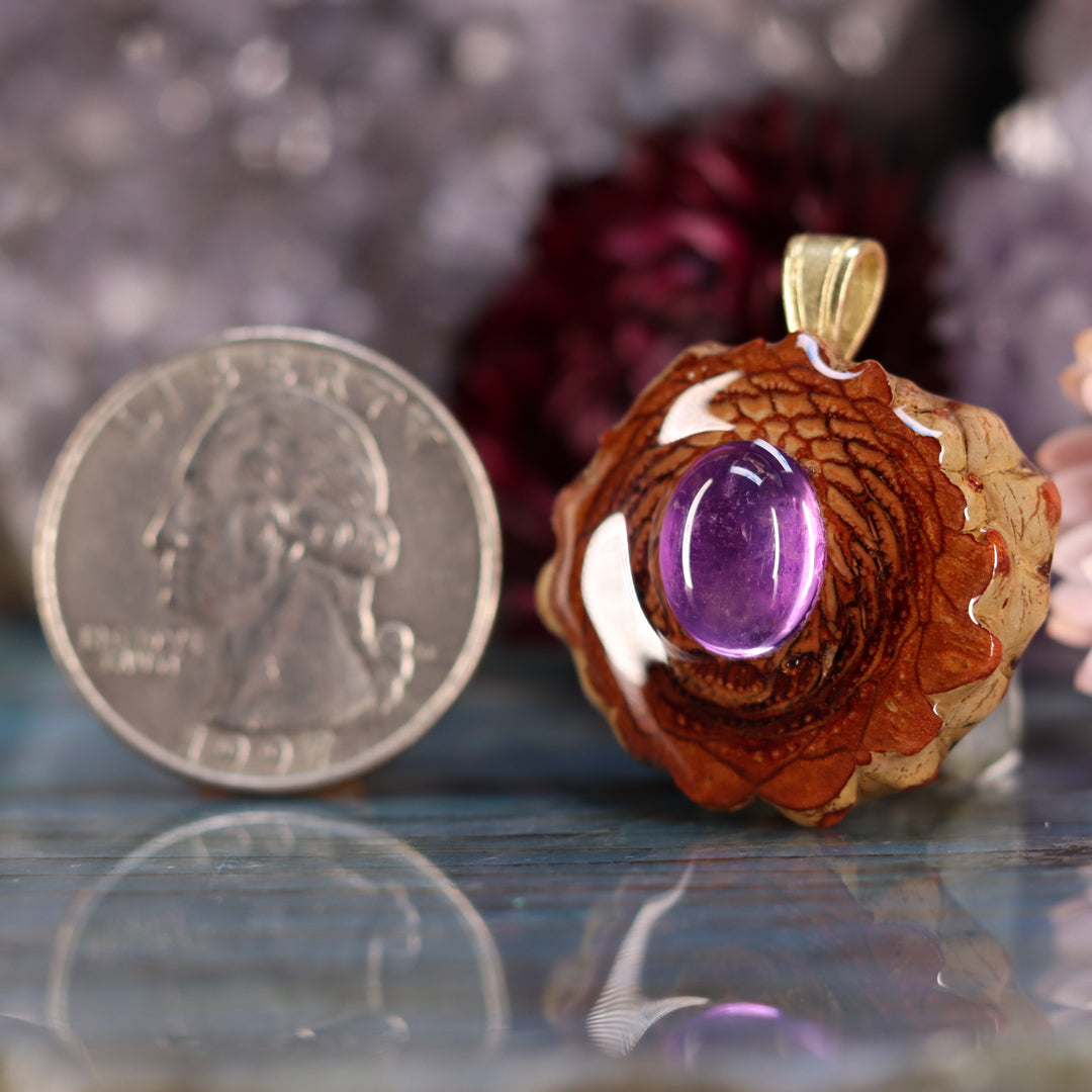 Every pinecone pendant is an elegant gift from Mother Nature -- unveiling the ornate Sacred Geometry hidden at the center of one of the world's densest Pinecones. Because only one cross-section is taken from the "heart" of each Cone, every pendant is absolutely unique, and truly one-of-a-kind.