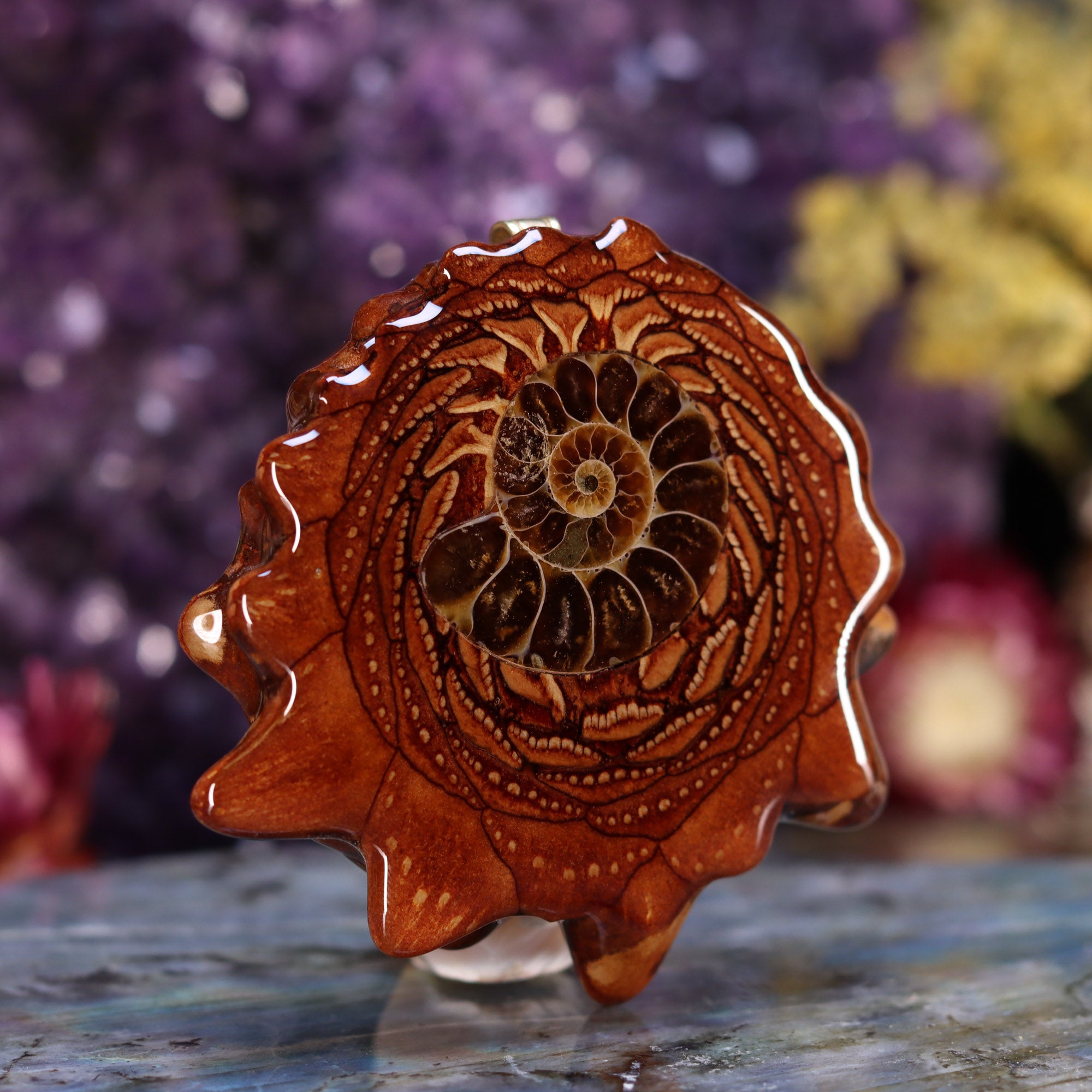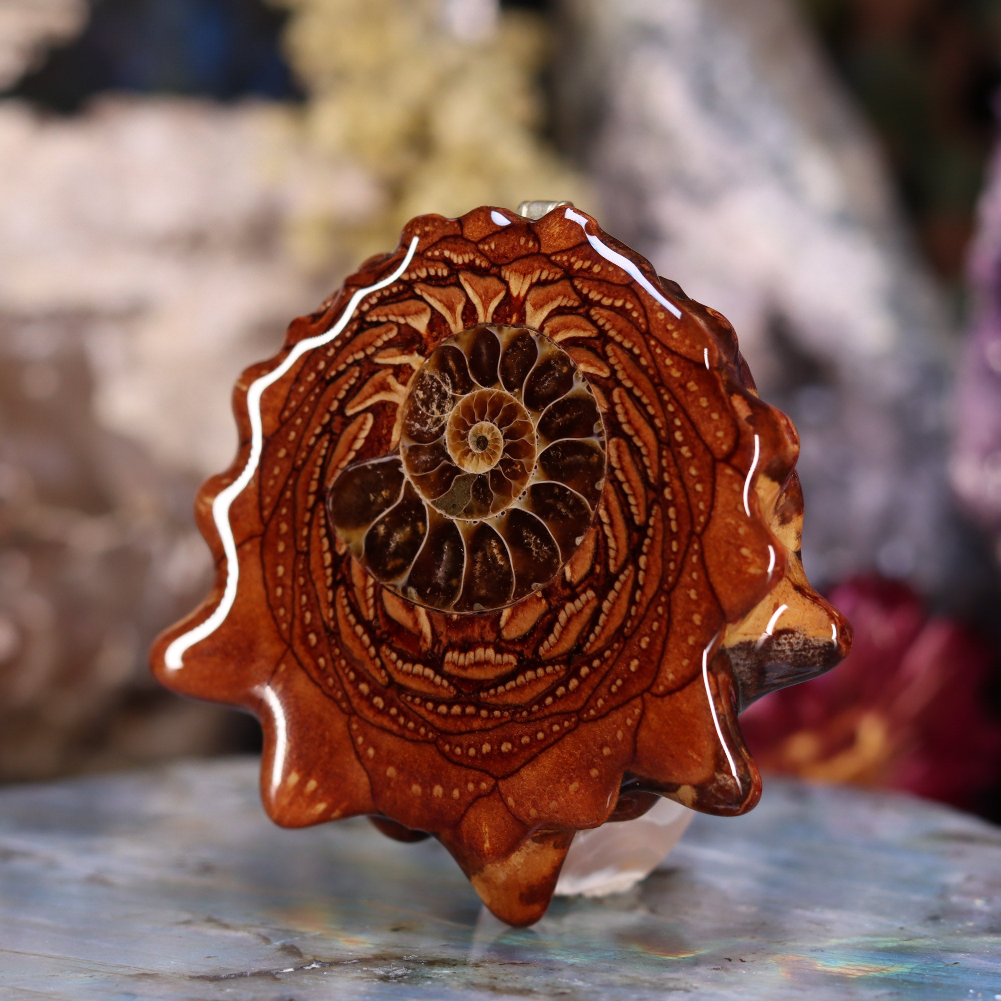 The 240 million year old ammonite fossils form a sacred geometrical shape called the "golden mean spiral," traveling both infinitely outward and infinitely inward. This spiral can be mathematically represented by the Fibonacci Sequence – the numerical foundation that depicts the underlying growth, movement, and evolution throughout all of nature. Plants unfurl, flowers bloom, and our galaxy spirals according to this sequence. The ammonites are fitted expertly into the center of each pine cone's mandala so as to blend the golden mean spirals of tree and shell into a single dynamic Fibonacci movement – evoking a sense of wonder and connectedness to our universe's greater intelligent design.