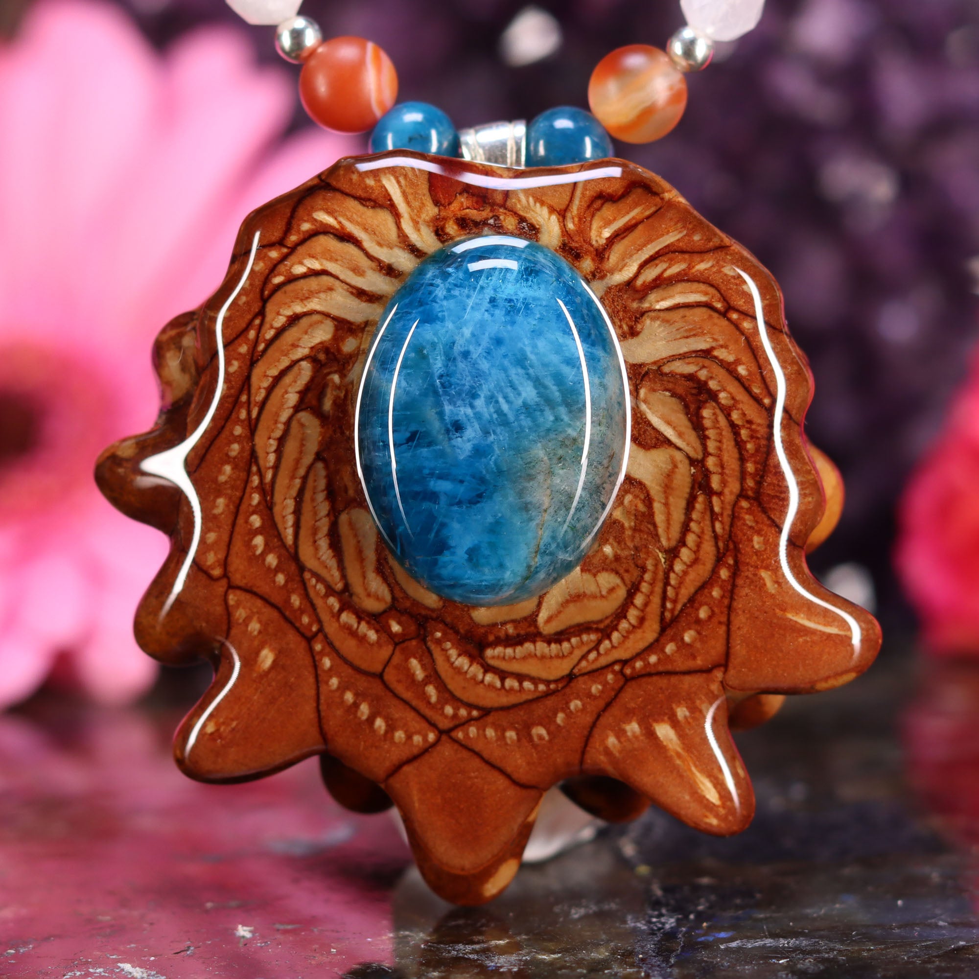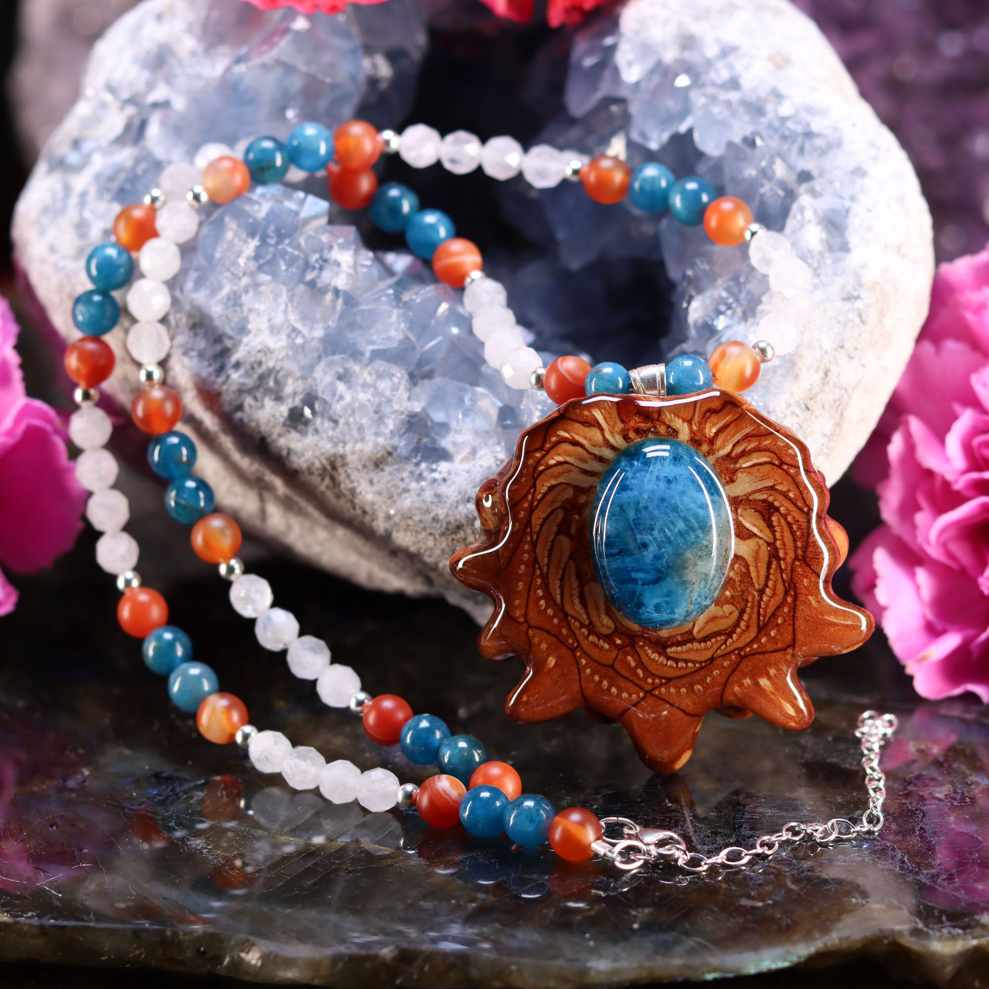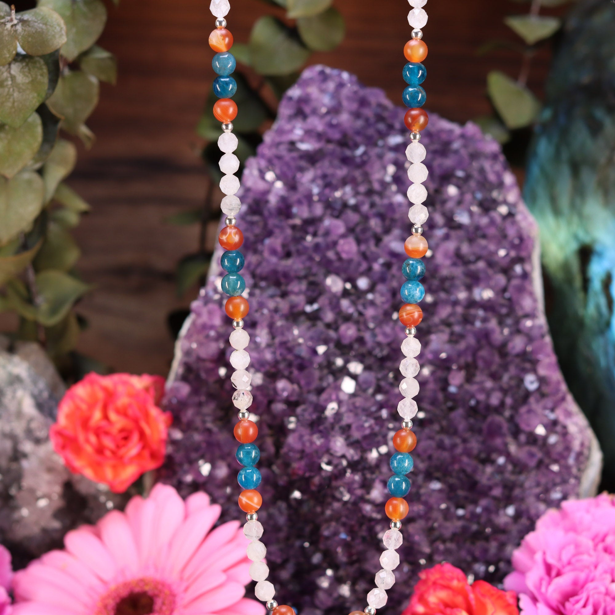 This necklace measures 17 inches (43 cm) and features a Blue Apatite pendant lovingly strung with a 3-inch length-adjustable Sterling Silver chain strung with Blue Apatite, Carnelian, and Moonstone beads to activate and energize body, mind and spirit!