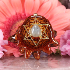This piece bears a 24k Gold Sri Yantra (literally meaning "holy instrument") Mandala, symbolizing the junction between the physical universe and its unmanifest source according to Hindu Mysticism. Four triangles face upwards to represent the Divine Masculine (Shiva), and five triangles face downwards to represent the Divine Feminine (Shakti). The Sri Yantra is often referred to as the Chakra Raja – King of all Chakras – making it a supreme instrument in the path of spiritual advancement.