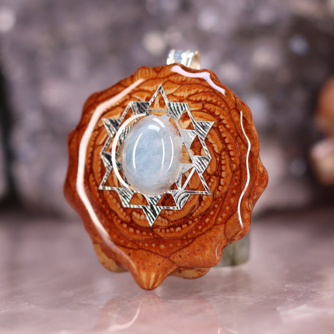 This piece bears a Sterling Silver Sri Yantra (literally meaning "holy instrument") Mandala, symbolizing the junction between the physical universe and its unmanifest source according to Hindu Mysticism. Four triangles face upwards to represent the Divine Masculine (Shiva), and five triangles face downwards to represent the Divine Feminine (Shakti). The Sri Yantra is often referred to as the Chakra Raja – King of all Chakras – making it a supreme instrument in the path of spiritual advancement.