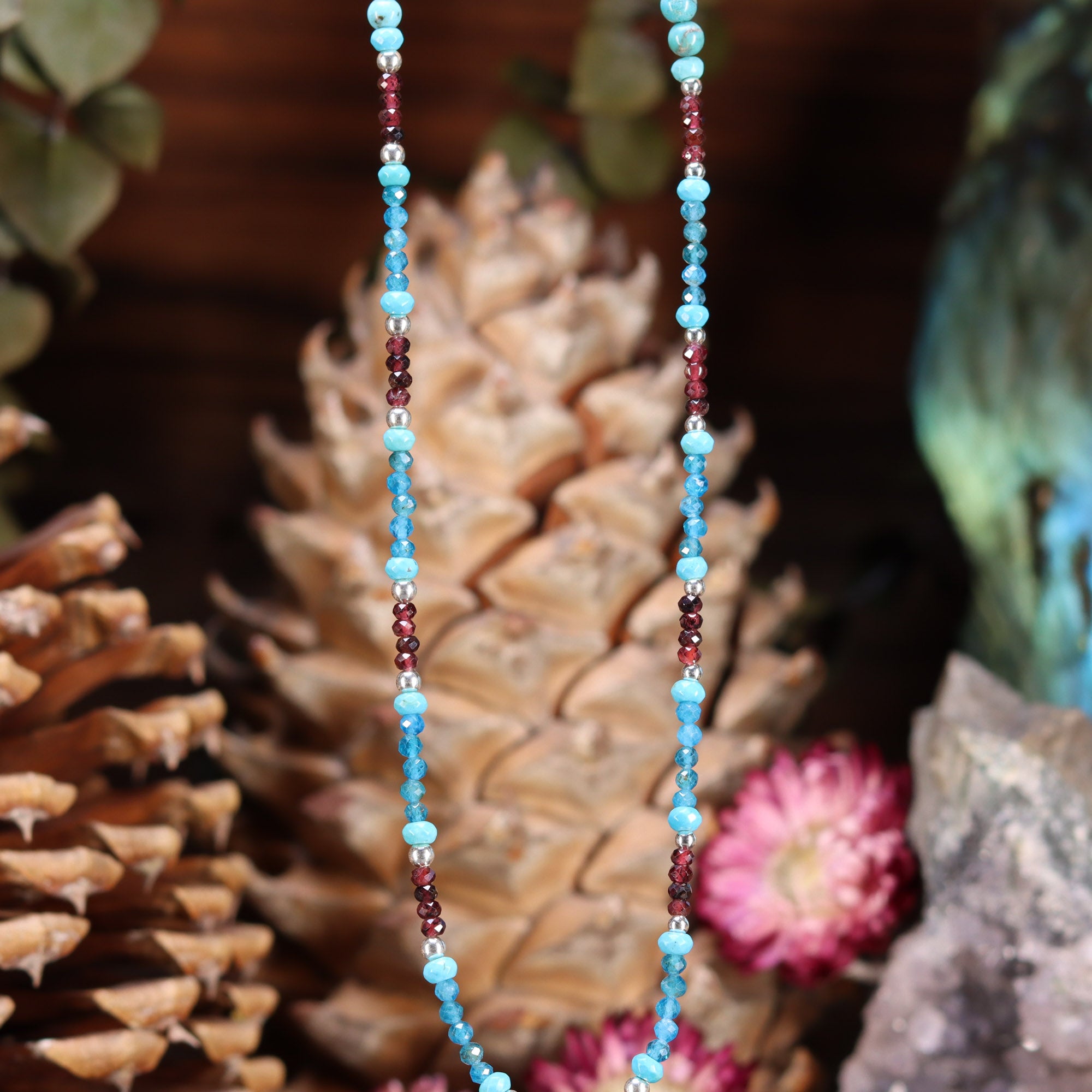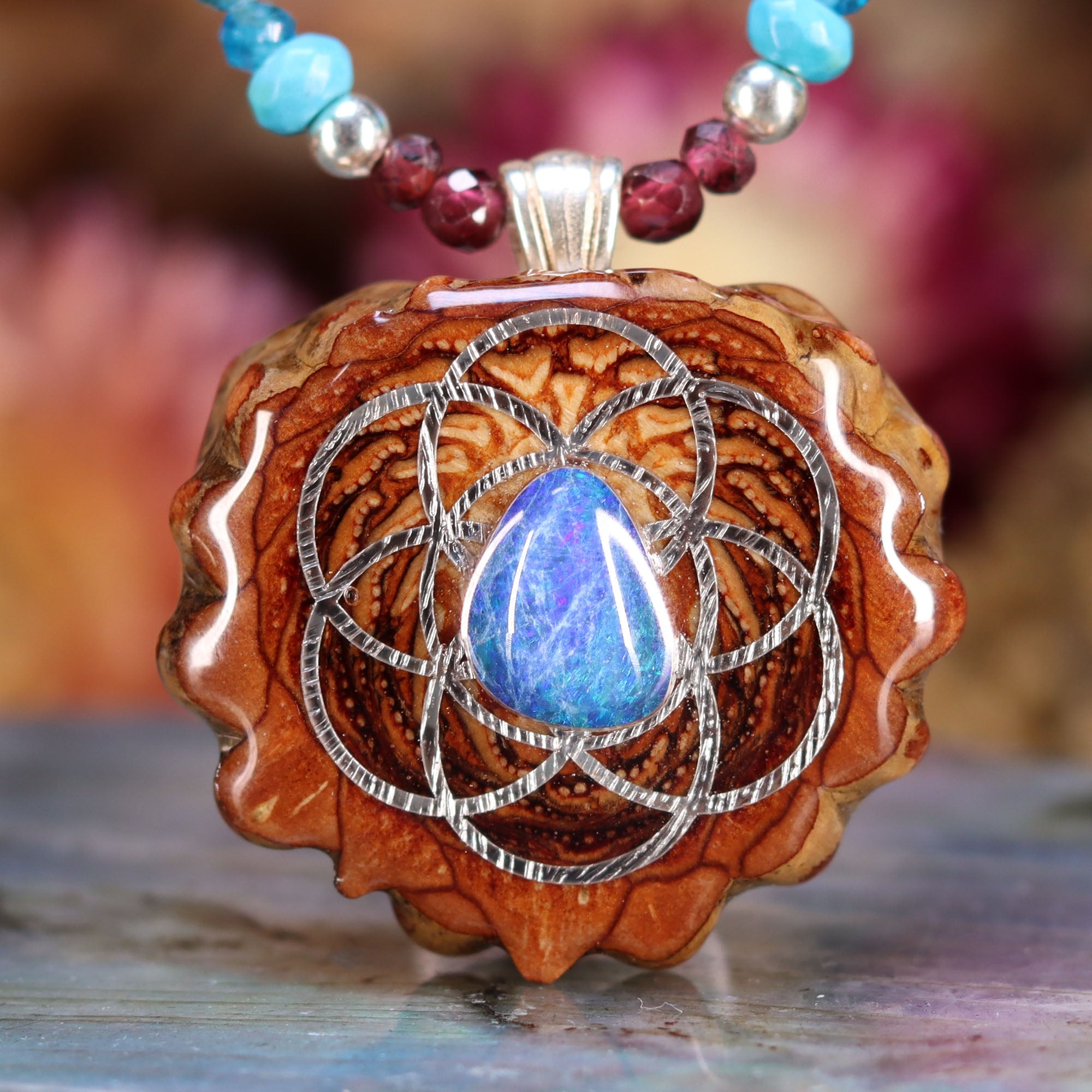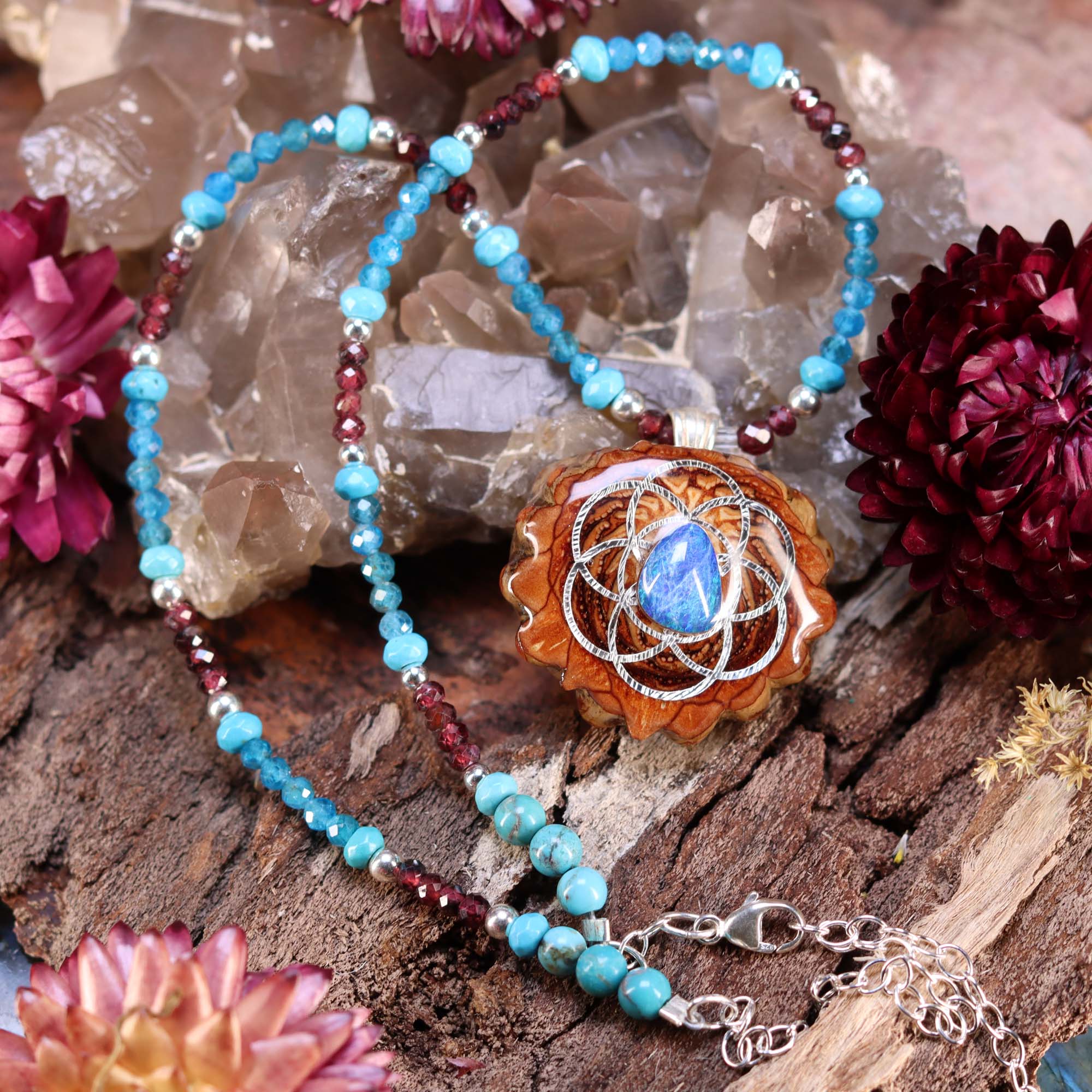 This necklace measures 11.5 inches (29.5 cm) and features an Australian Blue Opal with Silver Seed of Life pendant lovingly strung with a 4-inch length-adjustable Sterling Silver chain with Ruby, Turquoise, and Blue Apatite beads to activate and energize body, mind and spirit!