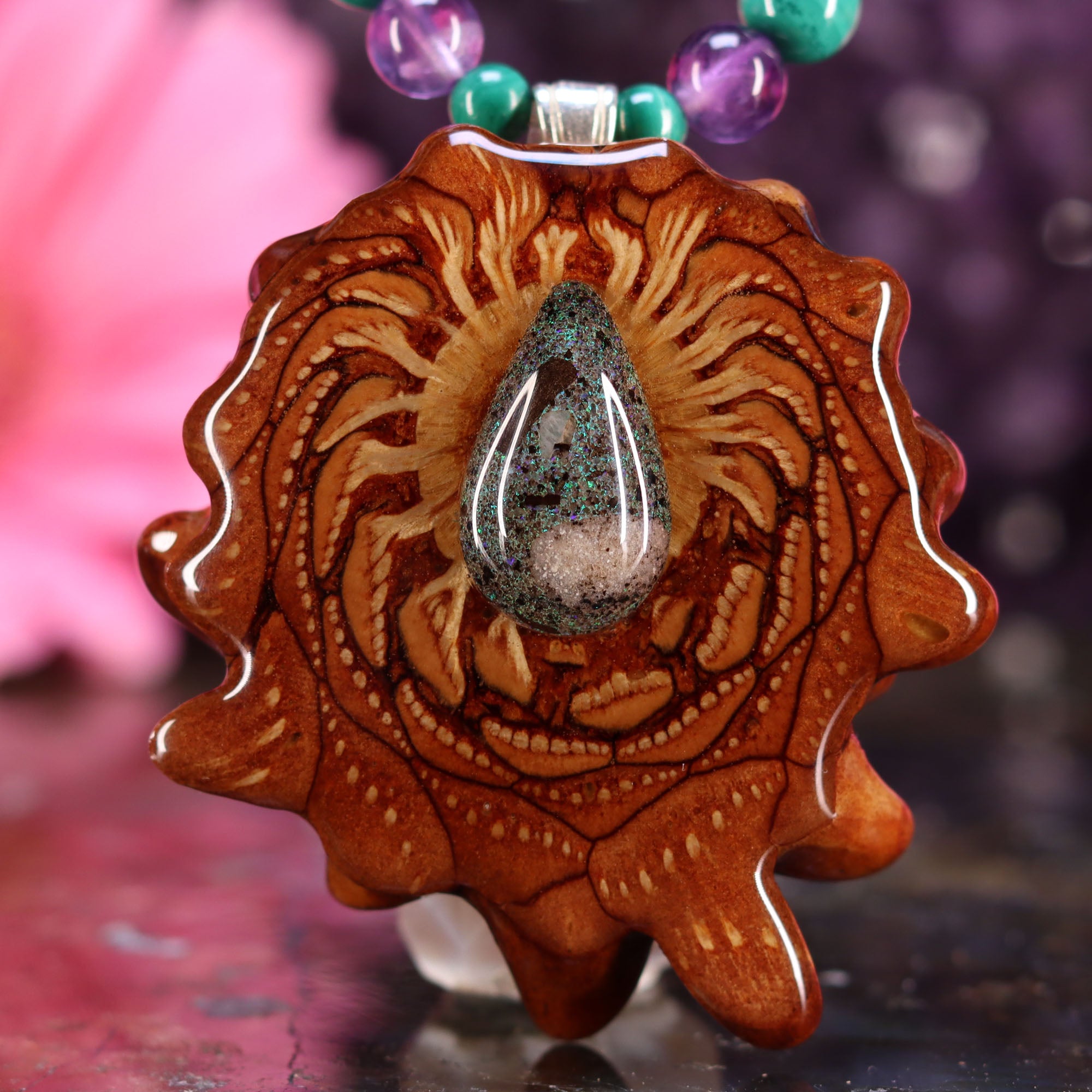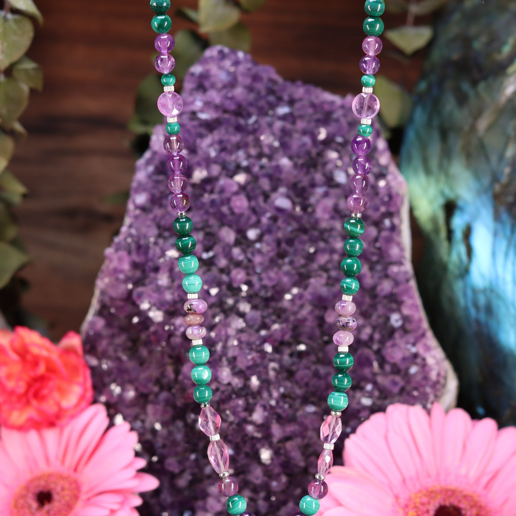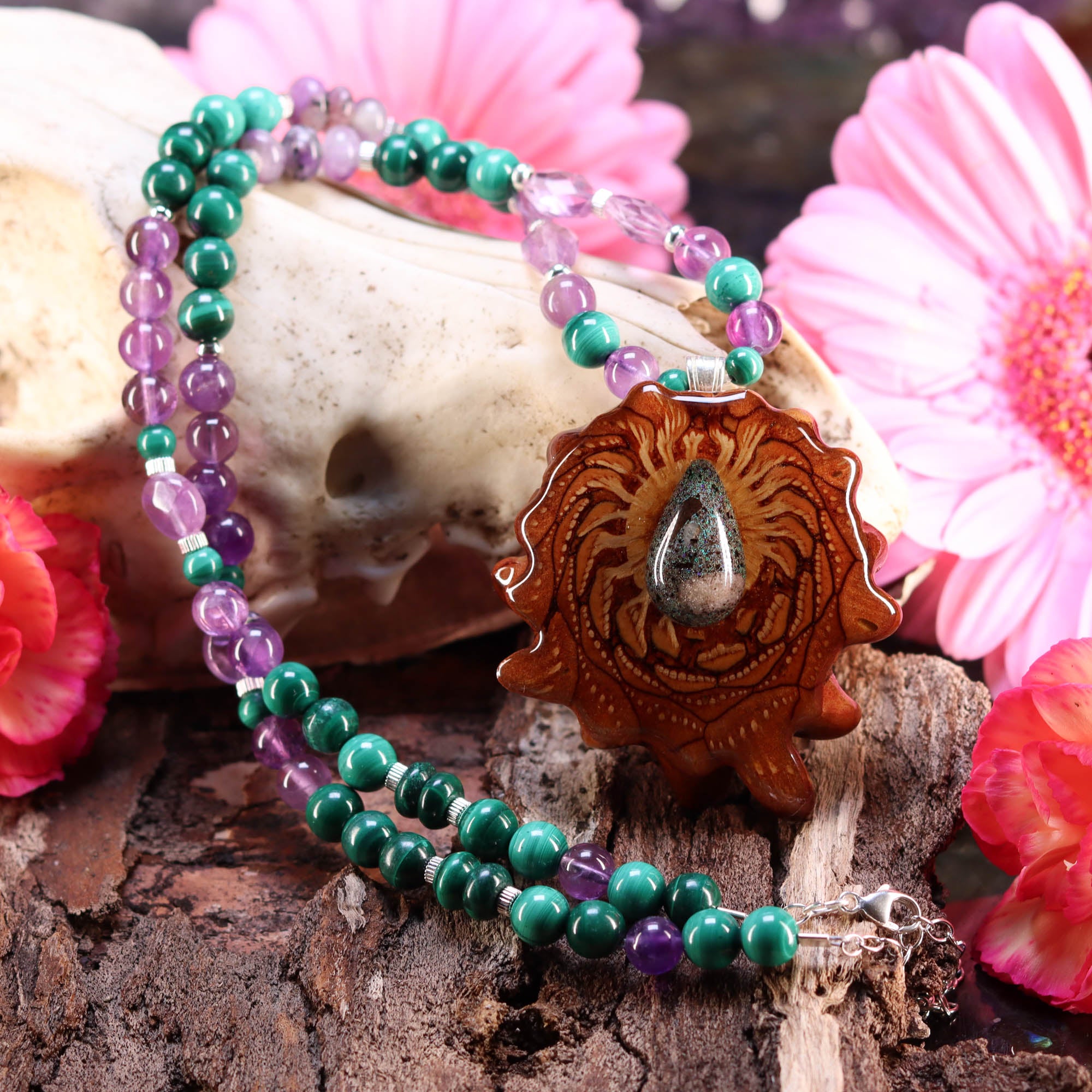 This necklace measures 17 inches (43 cm) and features a Black Opal pendant lovingly strung with a 3-inch length-adjustable Sterling Silver chain strung with Malachite, Amethyst, and Charoite beads to activate and energize body, mind and spirit!