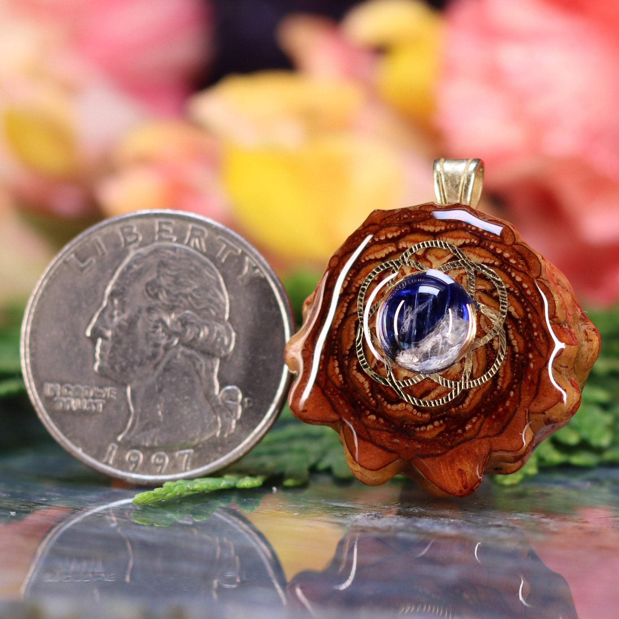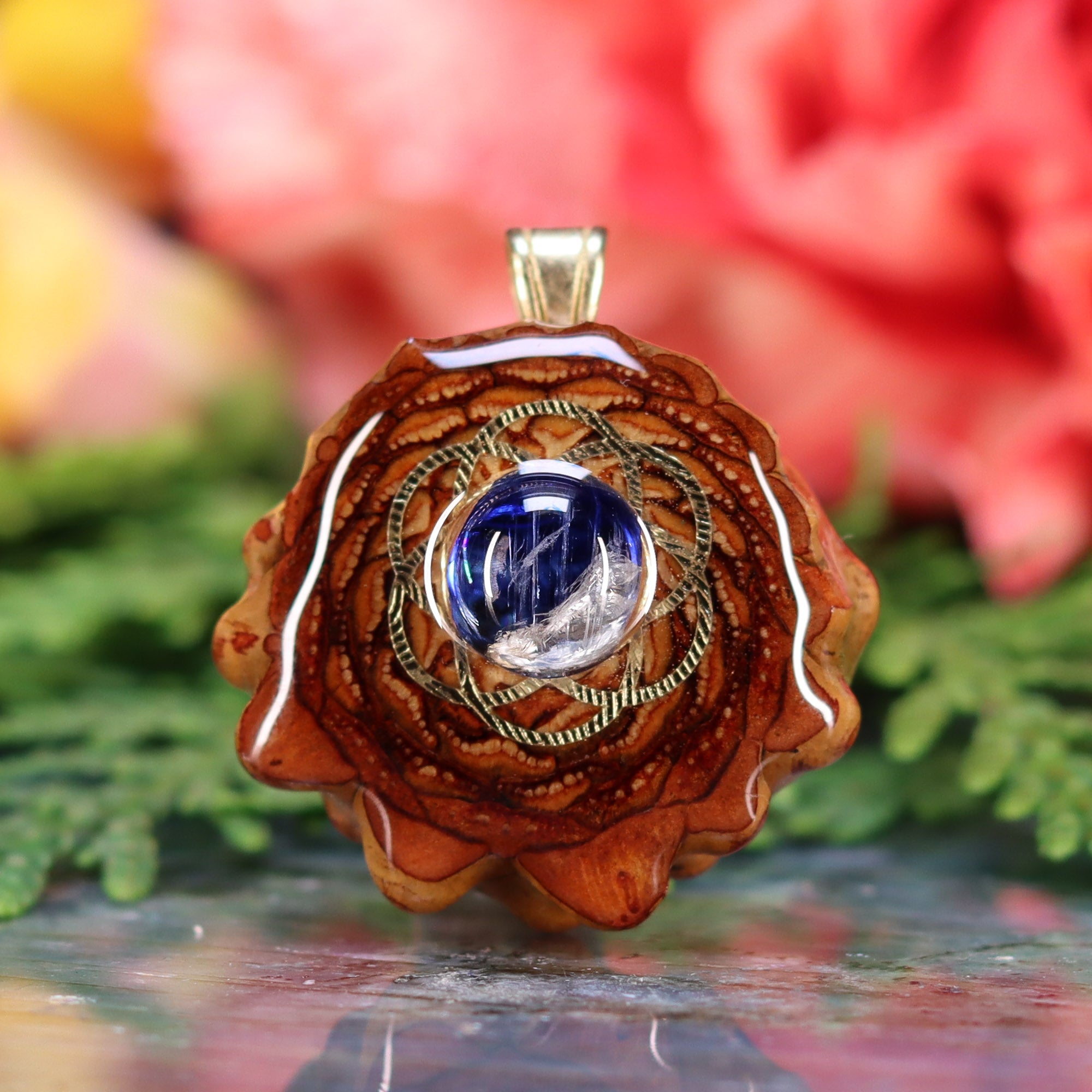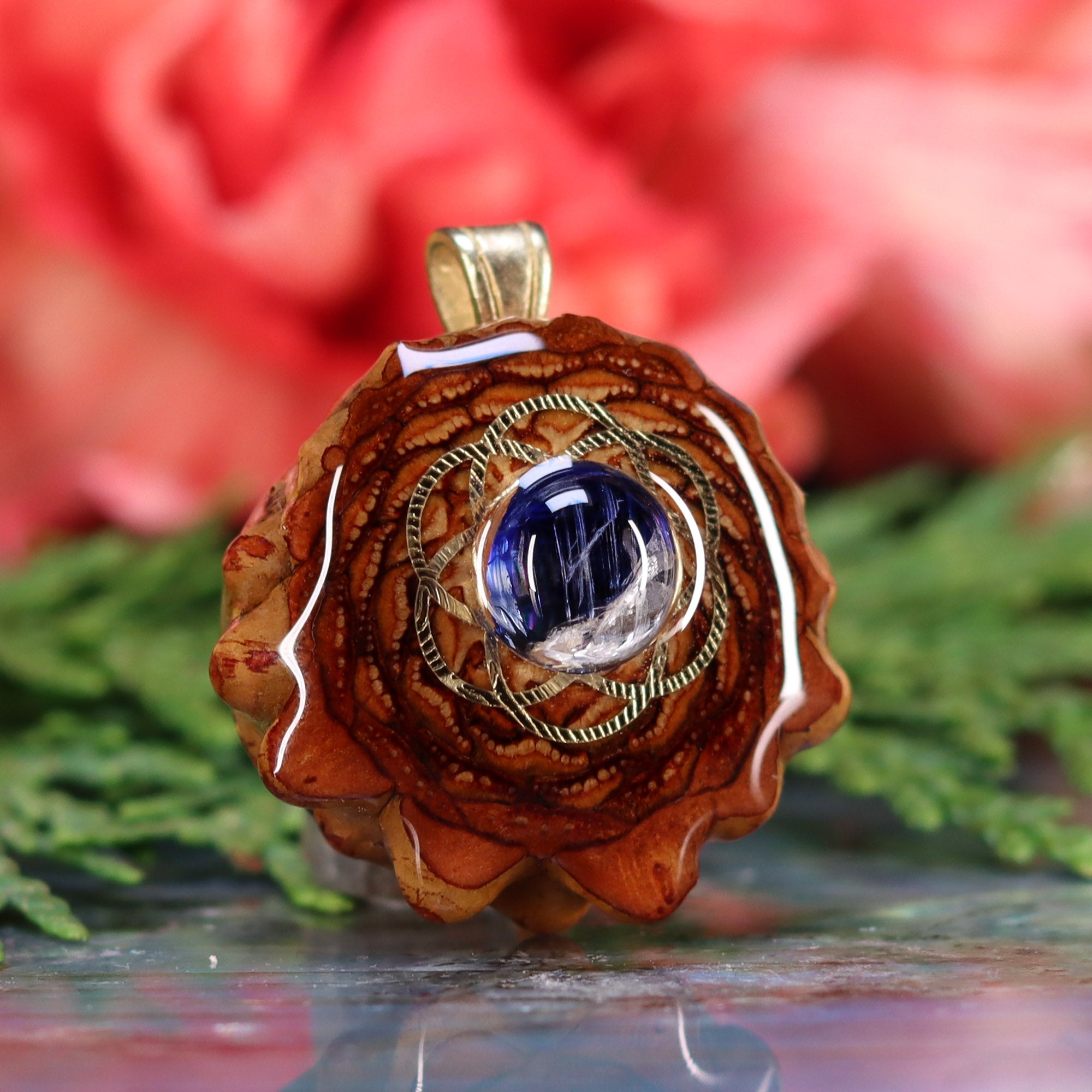 Every pinecone pendant is an elegant gift from Mother Nature -- unveiling the ornate Sacred Geometry hidden at the center of one of the world's densest Pinecones. Because only one cross-section is taken from the "heart" of each Cone, every pendant is absolutely unique, and truly one-of-a-kind.