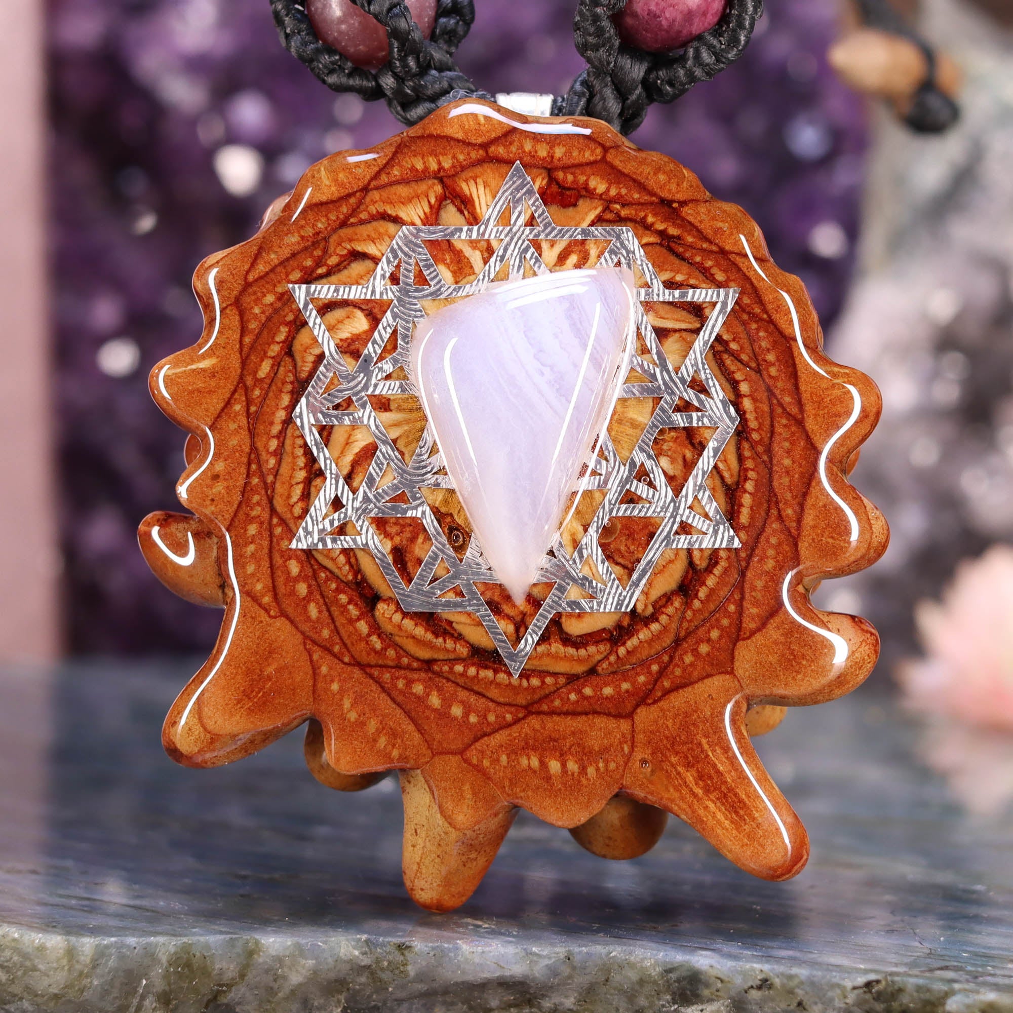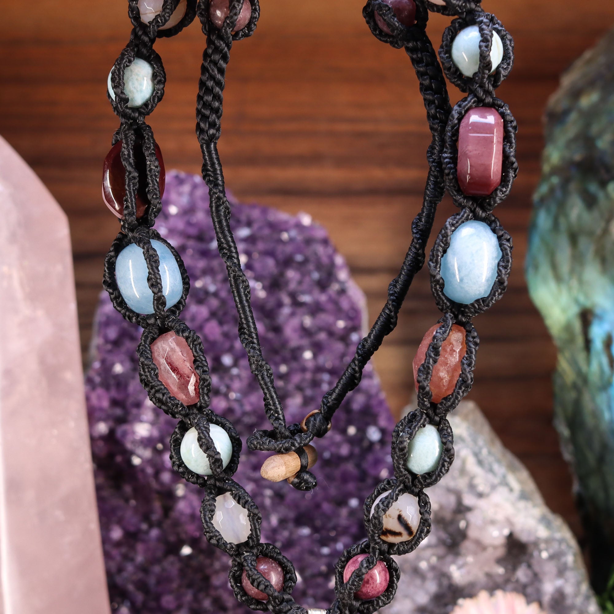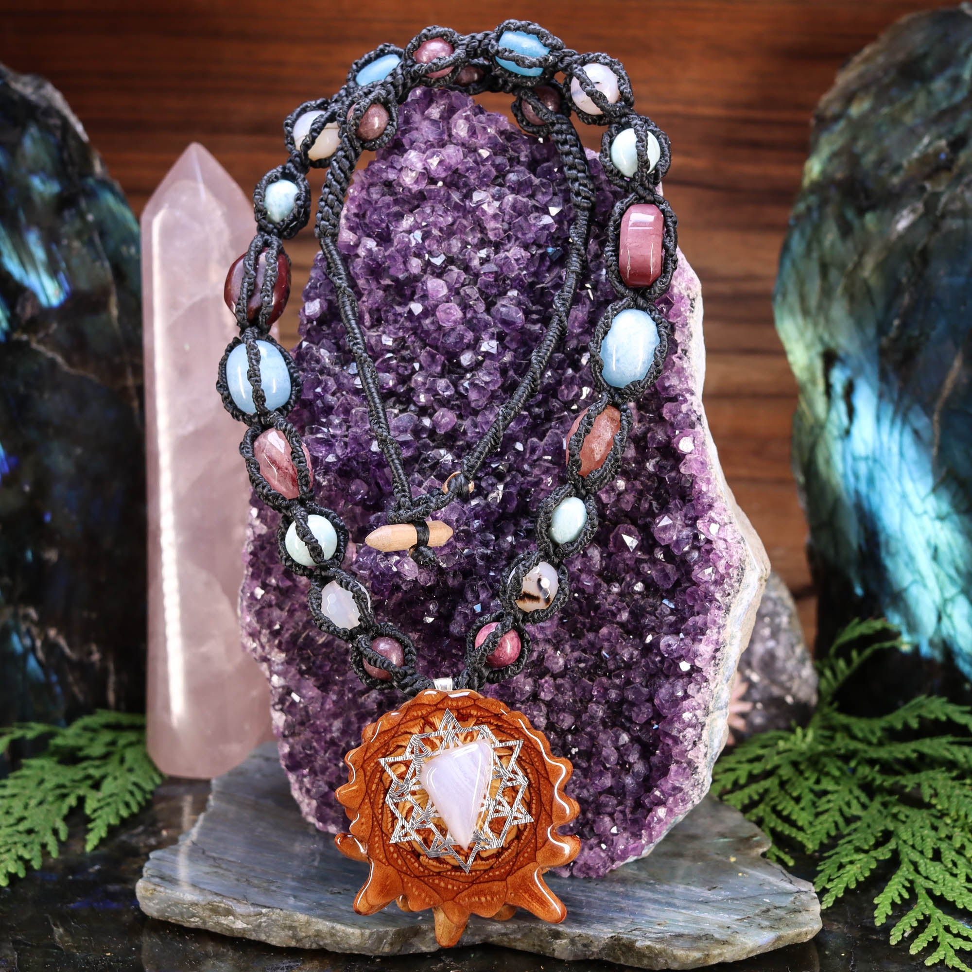Hand-woven in Bellingham, WA, this necklace features a Blue Lace Agate with Silver 64 Star Tetrahedron pendant lovingly strung with Dendritic Agate, Larimar, Strawberry Quartz, Aquamarine, Red Jasper, Aqua Stone, and Lepidolite beads to activate and energize body, mind and spirit!
