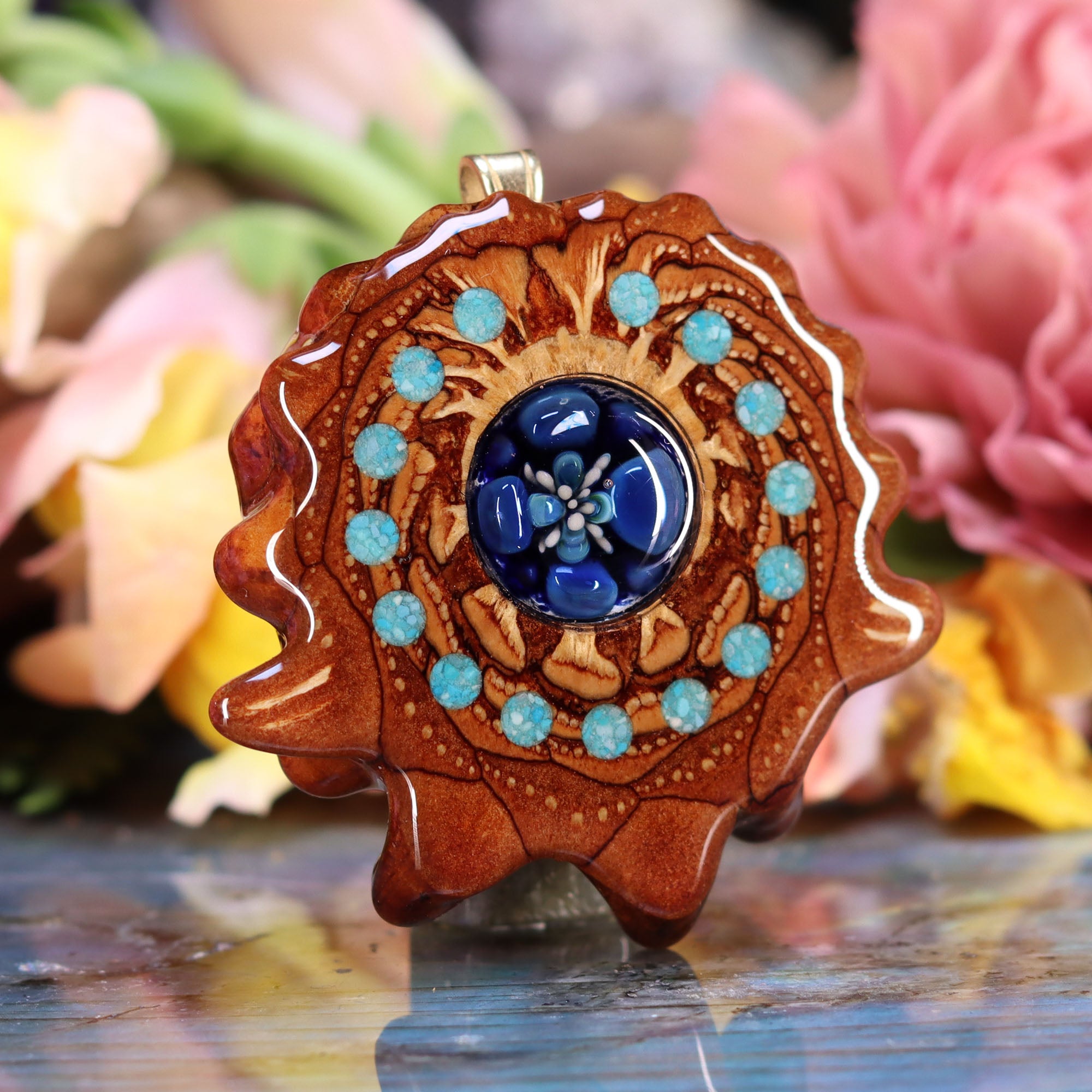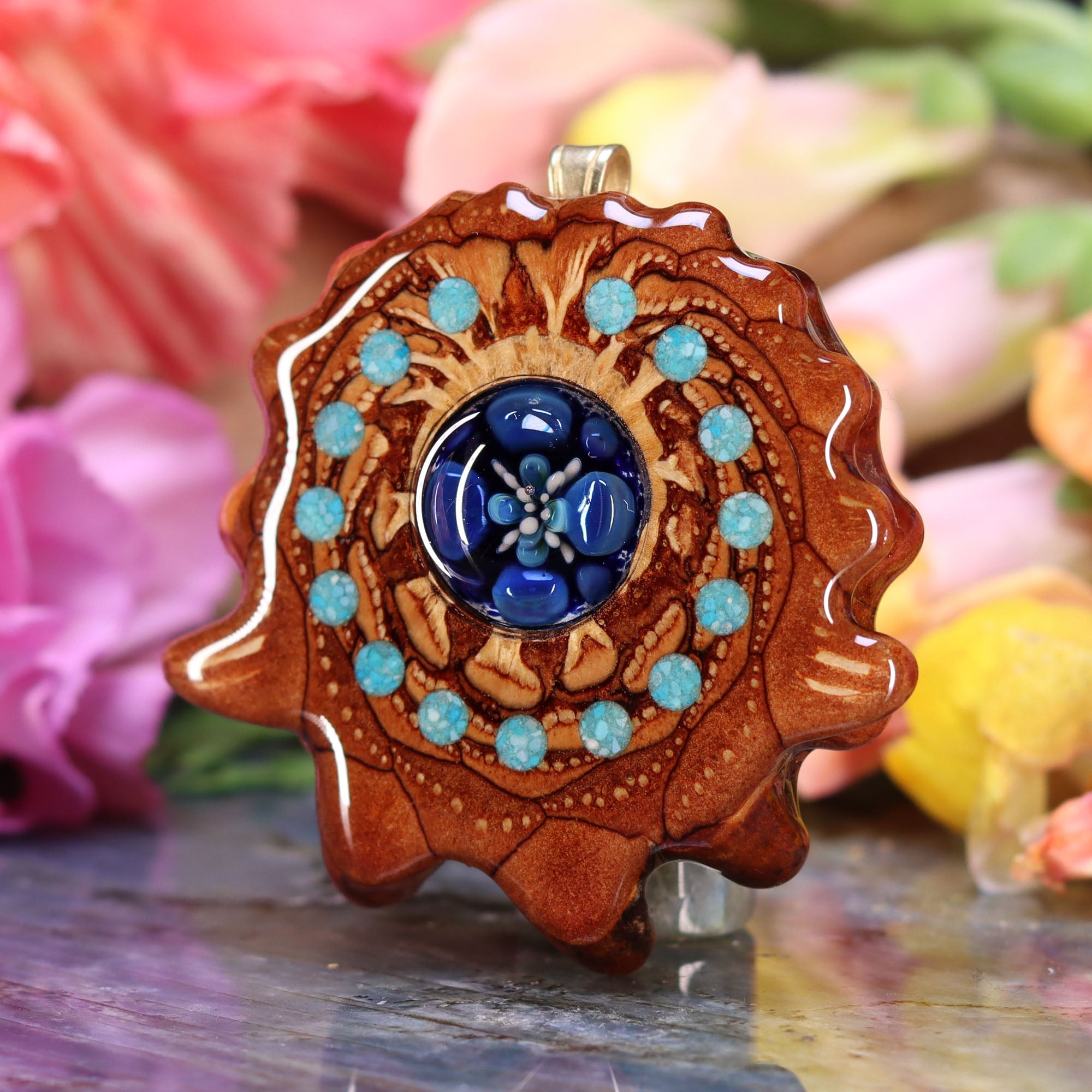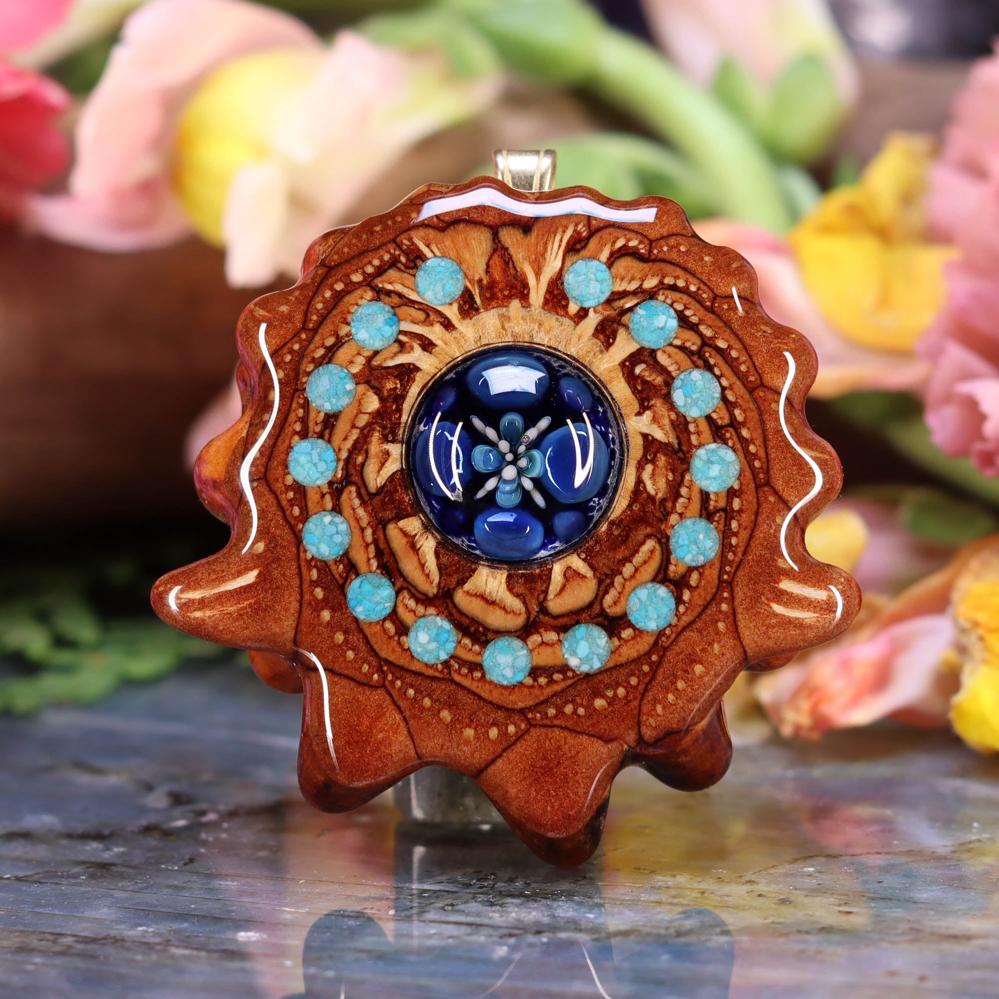 This epic collaboration between Third Eye Pinecones and Nick Anderson Art features a small Glass “Phoenix Orchid” Cab set inside one of our Pinecone Pendants! Each one of these Phoenix Orchid pendants is entirely unique, each with a life of its own. This piece is a one-of-a-kind creation, handmade by Nick, adding an exotic beauty and a stunning natural presence to the person wearing it.
