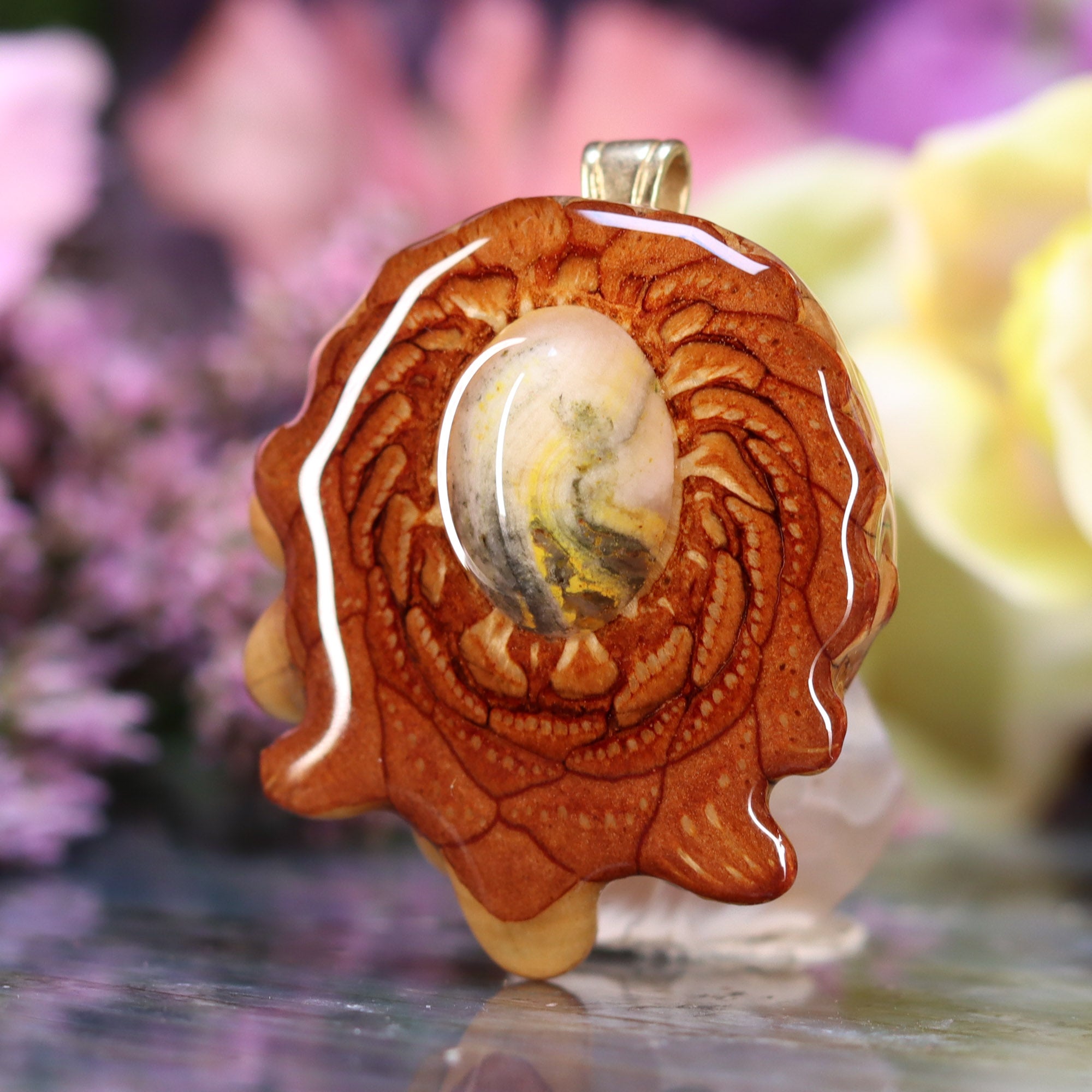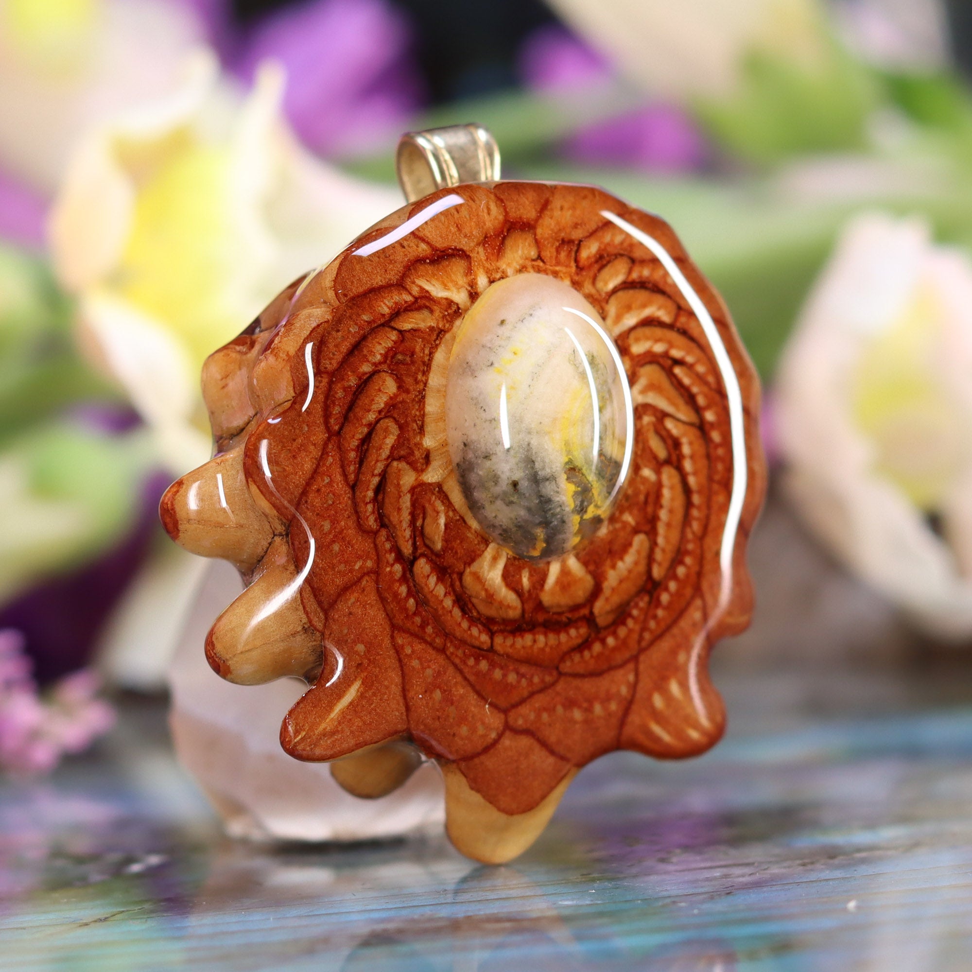 Every pinecone pendant is an elegant gift from Mother Nature -- unveiling the ornate Sacred Geometry hidden at the center of one of the world's densest Pinecones. Because only one cross-section is taken from the "heart" of each Cone, every pendant is absolutely unique, and truly one-of-a-kind.