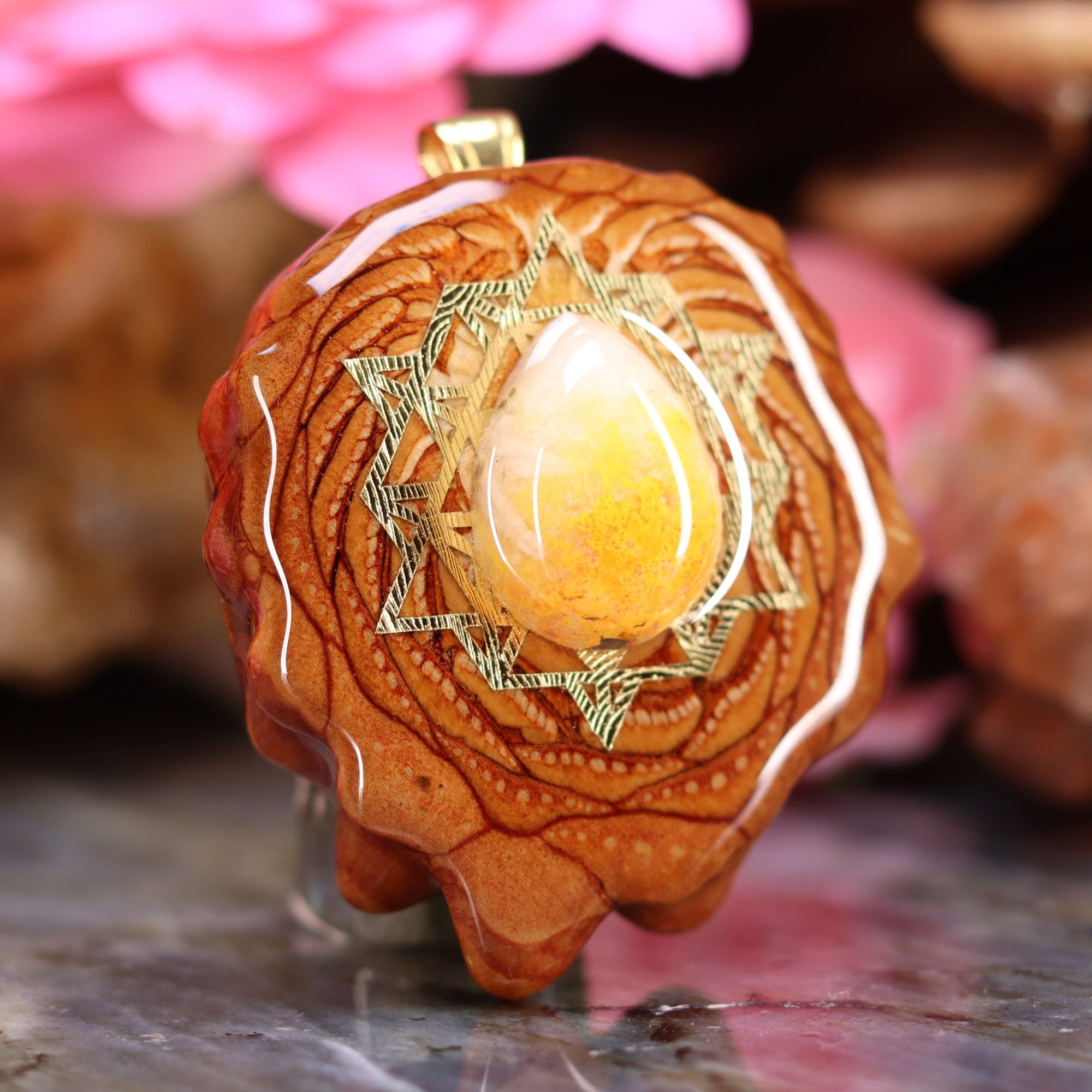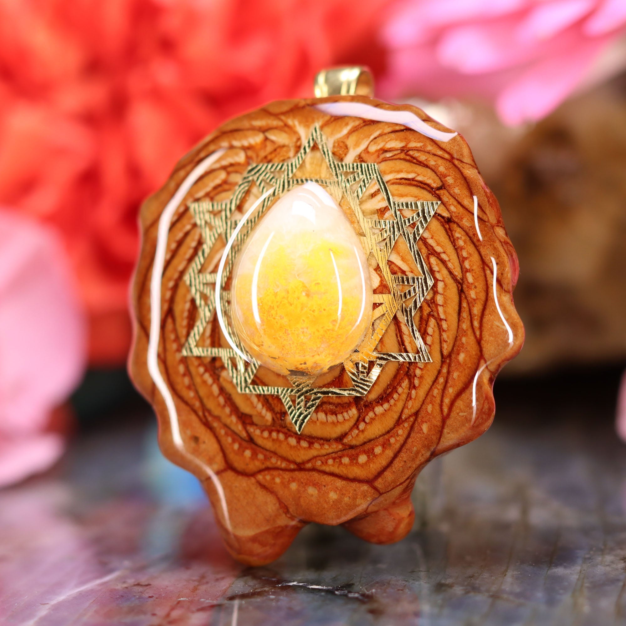Every pinecone pendant is an elegant gift from Mother Nature -- unveiling the ornate Sacred Geometry hidden at the center of one of the world's densest Pinecones. Because only one cross-section is taken from the "heart" of each Cone, every pendant is absolutely unique, and truly one-of-a-kind.