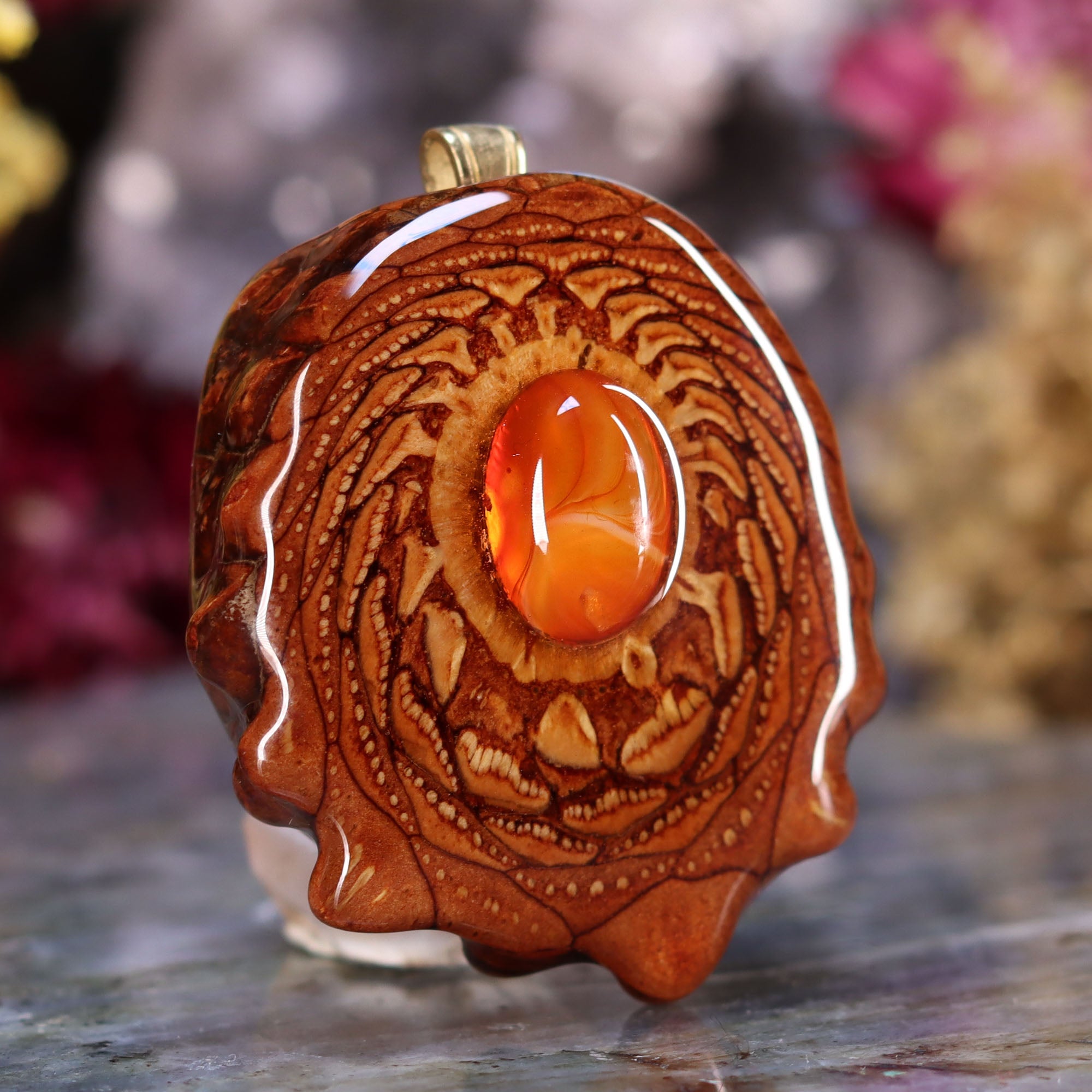 Every pinecone pendant is an elegant gift from Mother Nature -- unveiling the ornate Sacred Geometry hidden at the center of one of the world's densest Pinecones. Because only one cross-section is taken from the "heart" of each Cone, every pendant is absolutely unique, and truly one-of-a-kind.