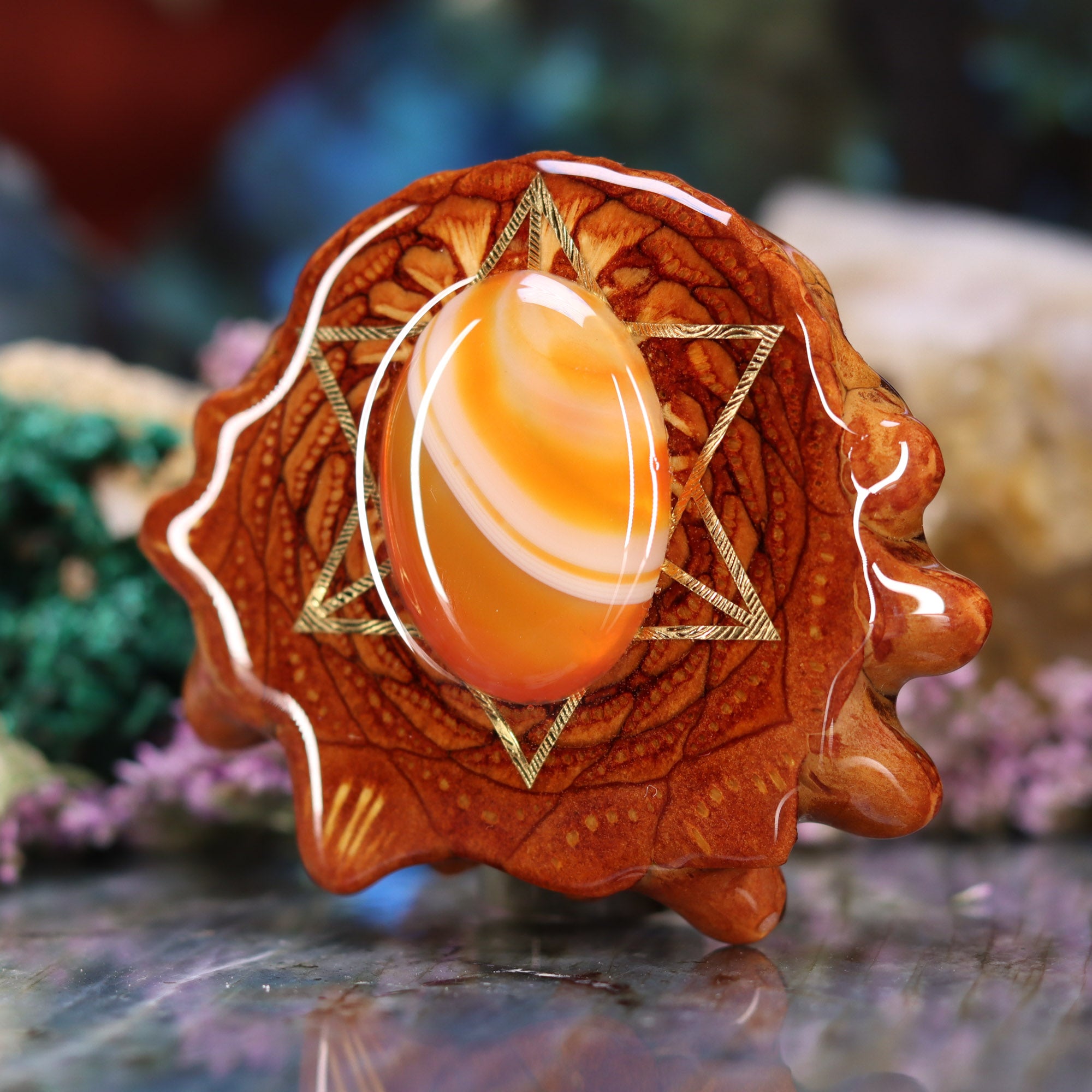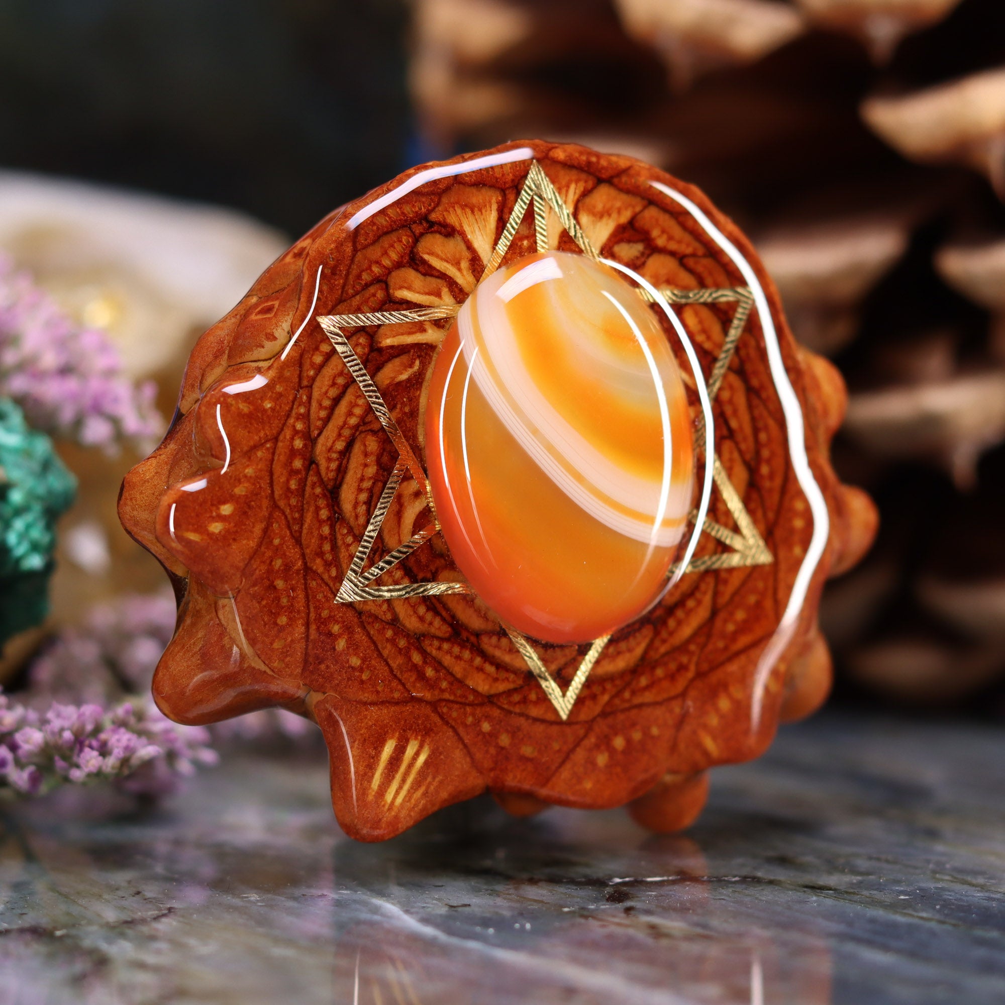 This Pinecone has been anointed with our "Merkaba" emblem, cast in 24k Gold. Merkaba - "Mer" meaning Light, "Ka" meaning Spirit, and "Ba" meaning Body - is a powerful icon historically known as the "Vehicle of Ascension". The Merkaba opens the mind to increased awareness and promotes deep conscious interconnection.