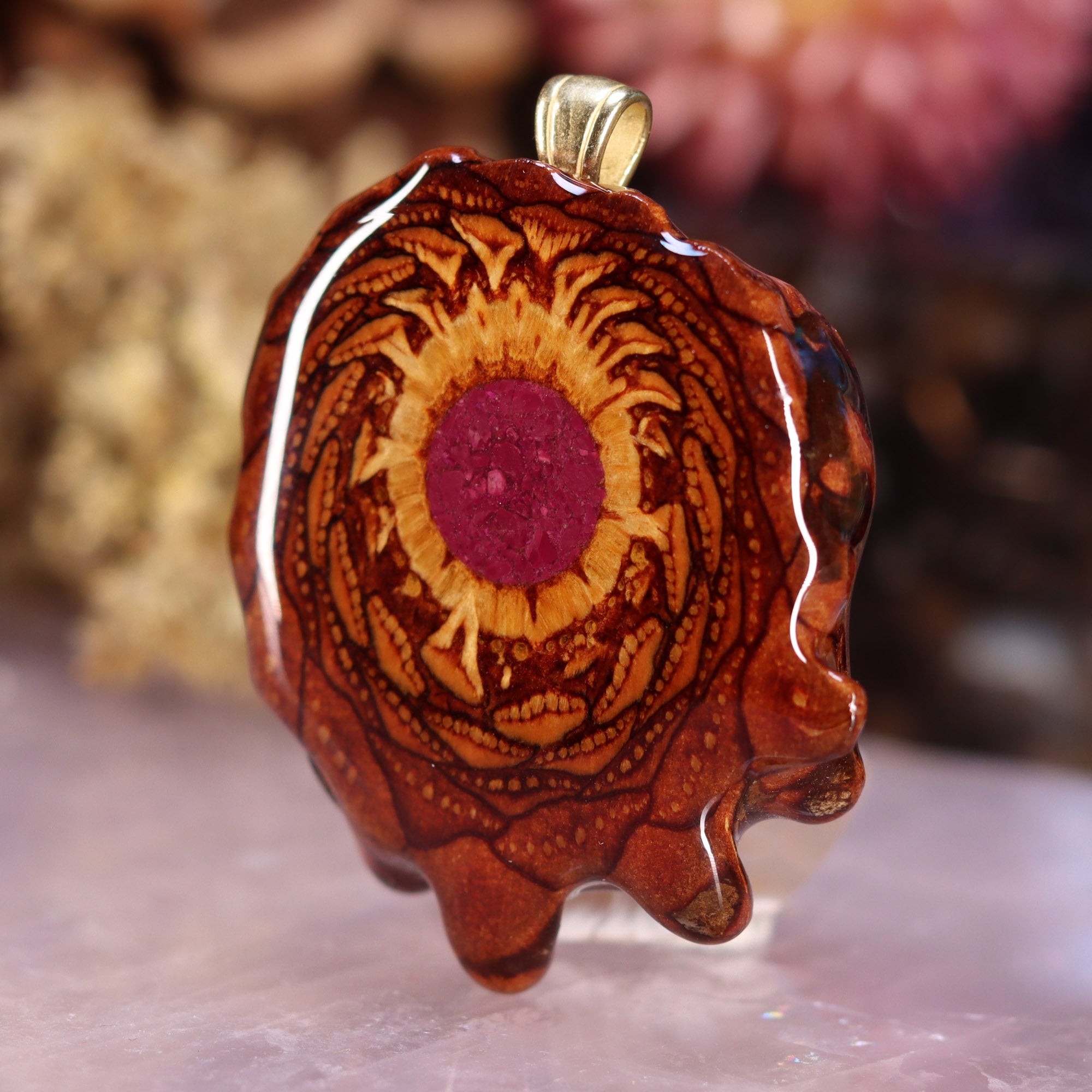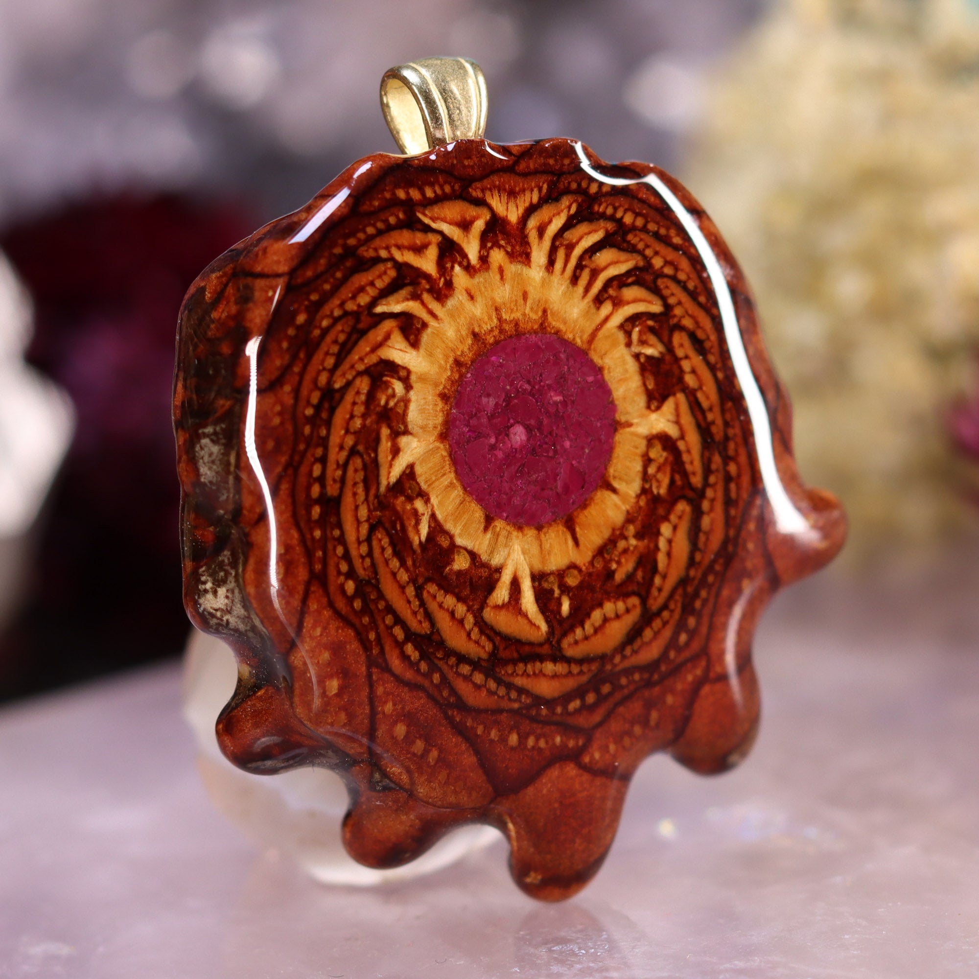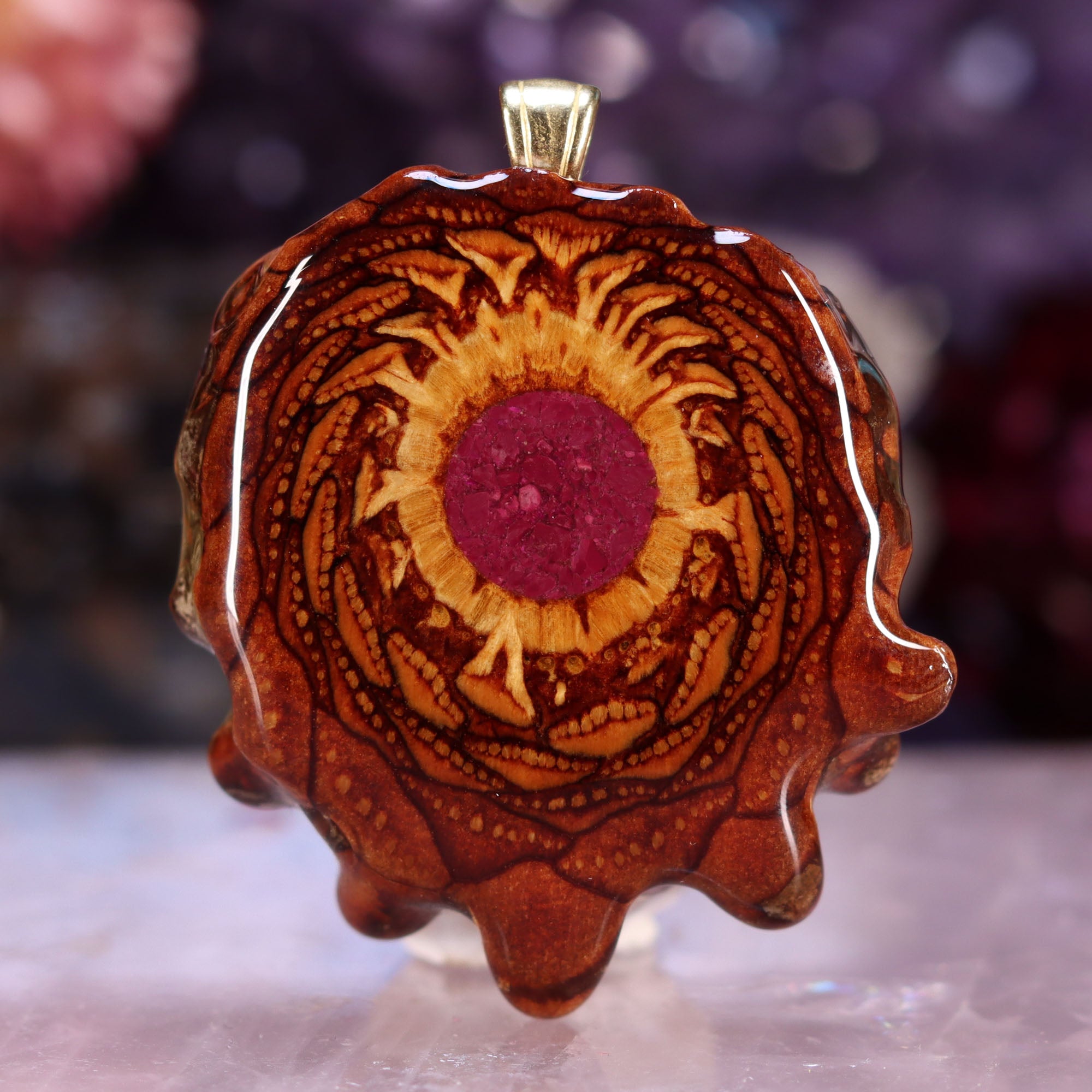 Every pinecone pendant is an elegant gift from Mother Nature -- unveiling the ornate Sacred Geometry hidden at the center of one of the world's densest Pinecones. Because only one cross-section is taken from the "heart" of each Cone, every pendant is absolutely unique, and truly one-of-a-kind.