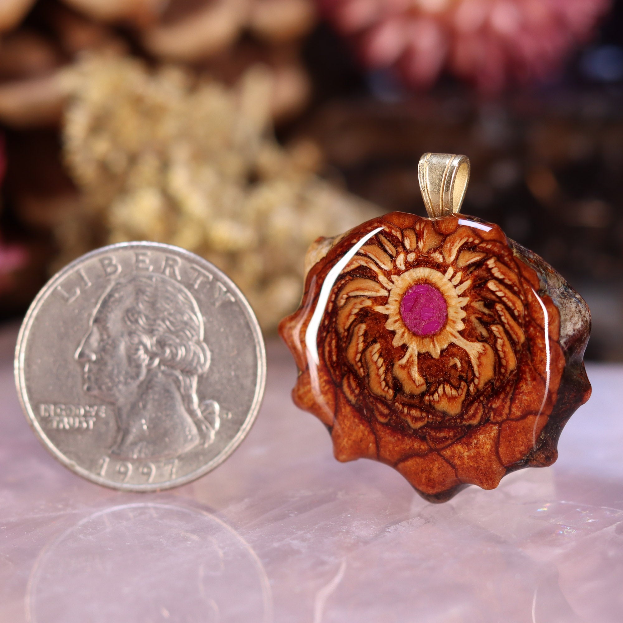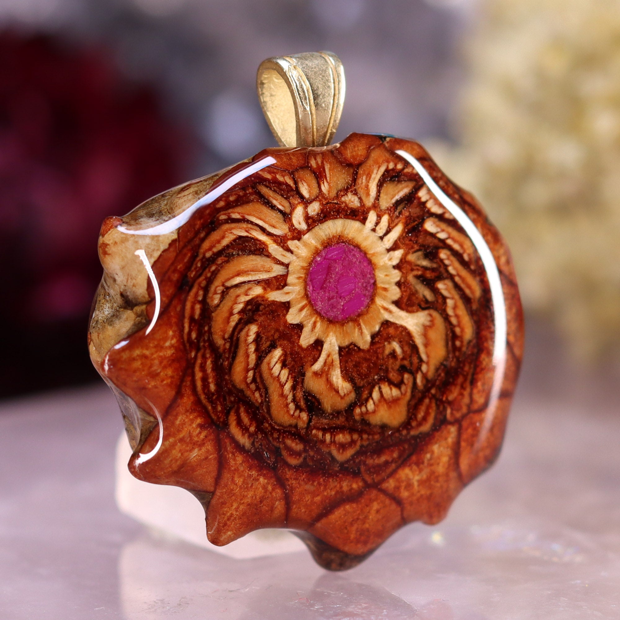 Every pinecone pendant is an elegant gift from Mother Nature -- unveiling the ornate Sacred Geometry hidden at the center of one of the world's densest Pinecones. Because only one cross-section is taken from the "heart" of each Cone, every pendant is absolutely unique, and truly one-of-a-kind.