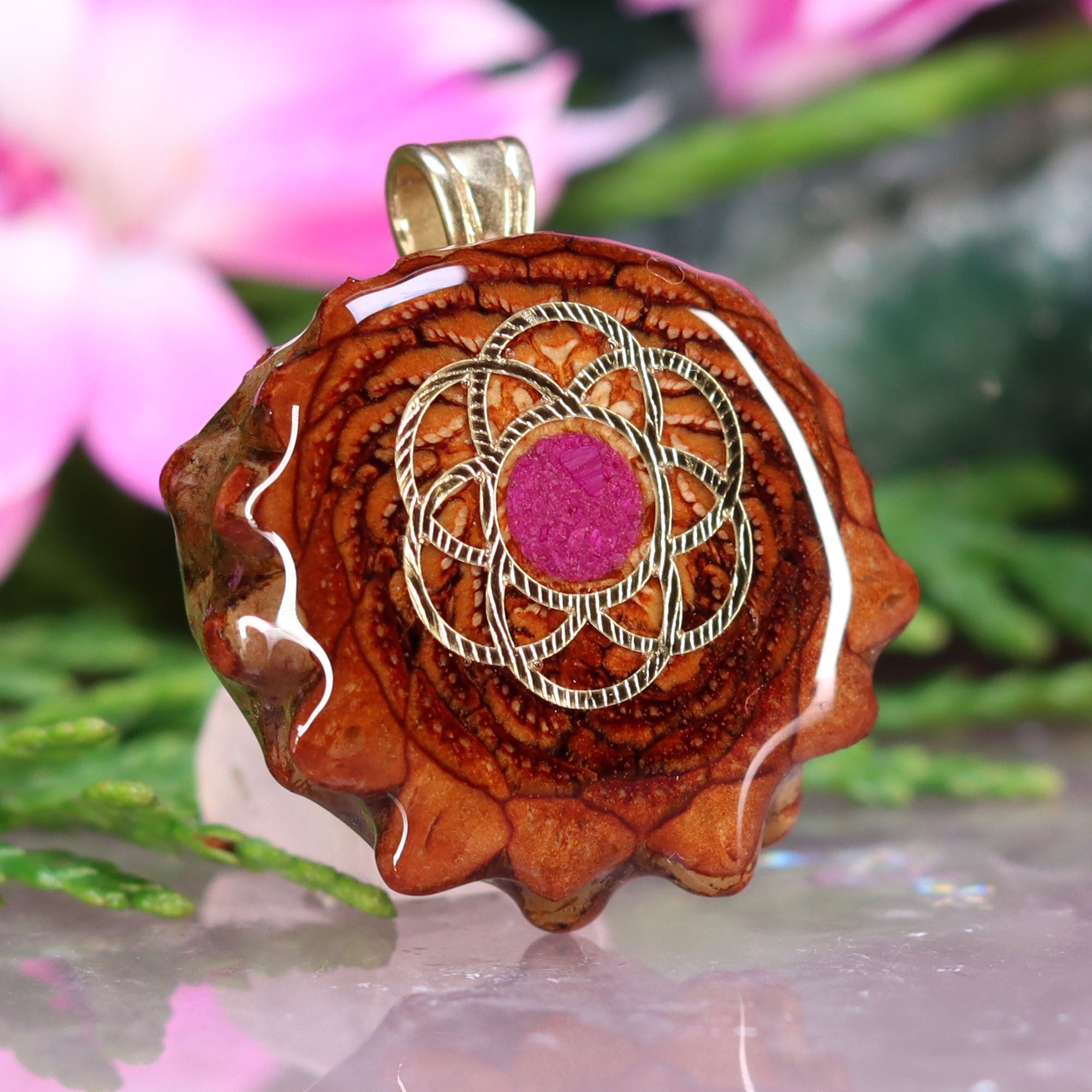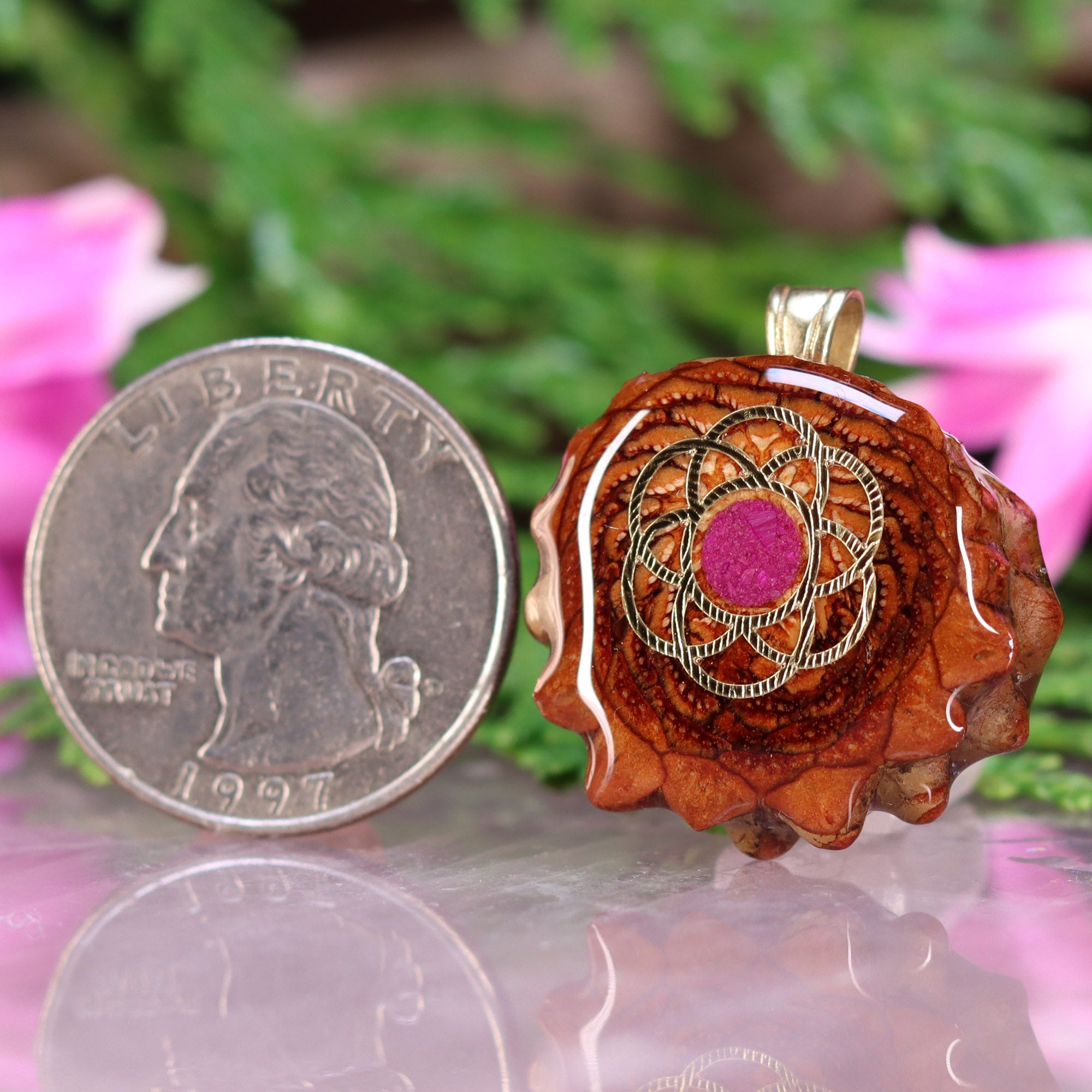 Every pinecone pendant is an elegant gift from Mother Nature -- unveiling the ornate Sacred Geometry hidden at the center of one of the world's densest Pinecones. Because only one cross-section is taken from the "heart" of each Cone, every pendant is absolutely unique, and truly one-of-a-kind.