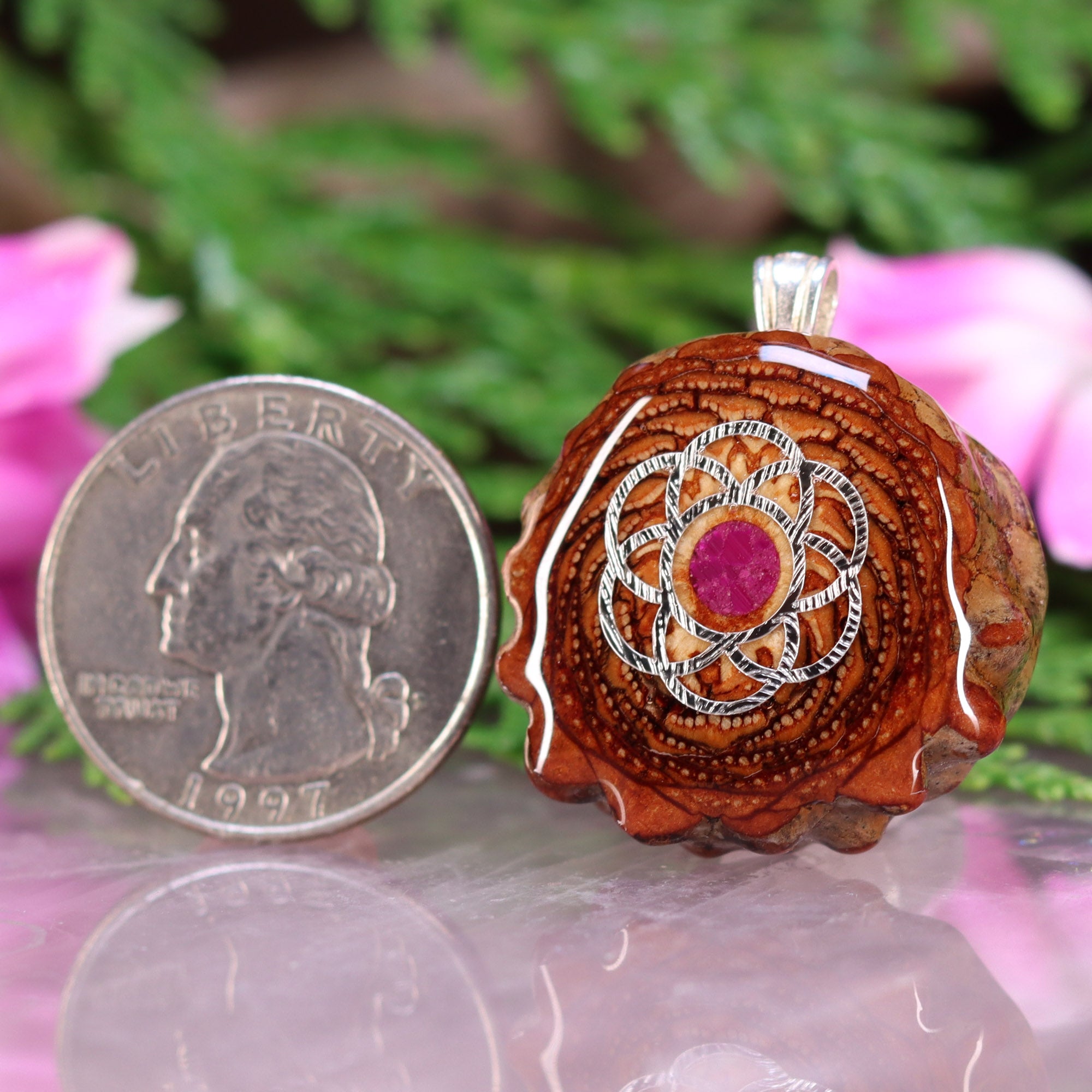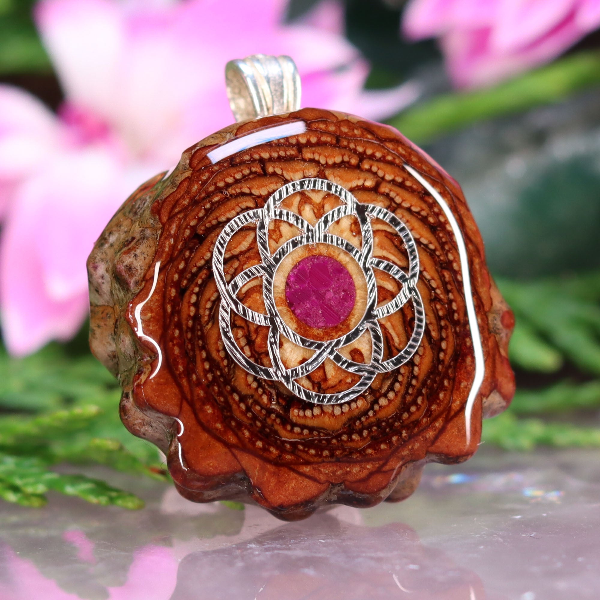 Every pinecone pendant is an elegant gift from Mother Nature -- unveiling the ornate Sacred Geometry hidden at the center of one of the world's densest Pinecones. Because only one cross-section is taken from the "heart" of each Cone, every pendant is absolutely unique, and truly one-of-a-kind.
