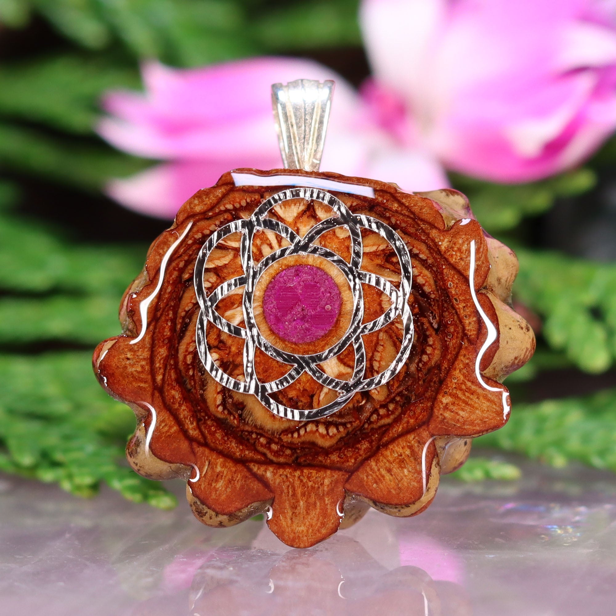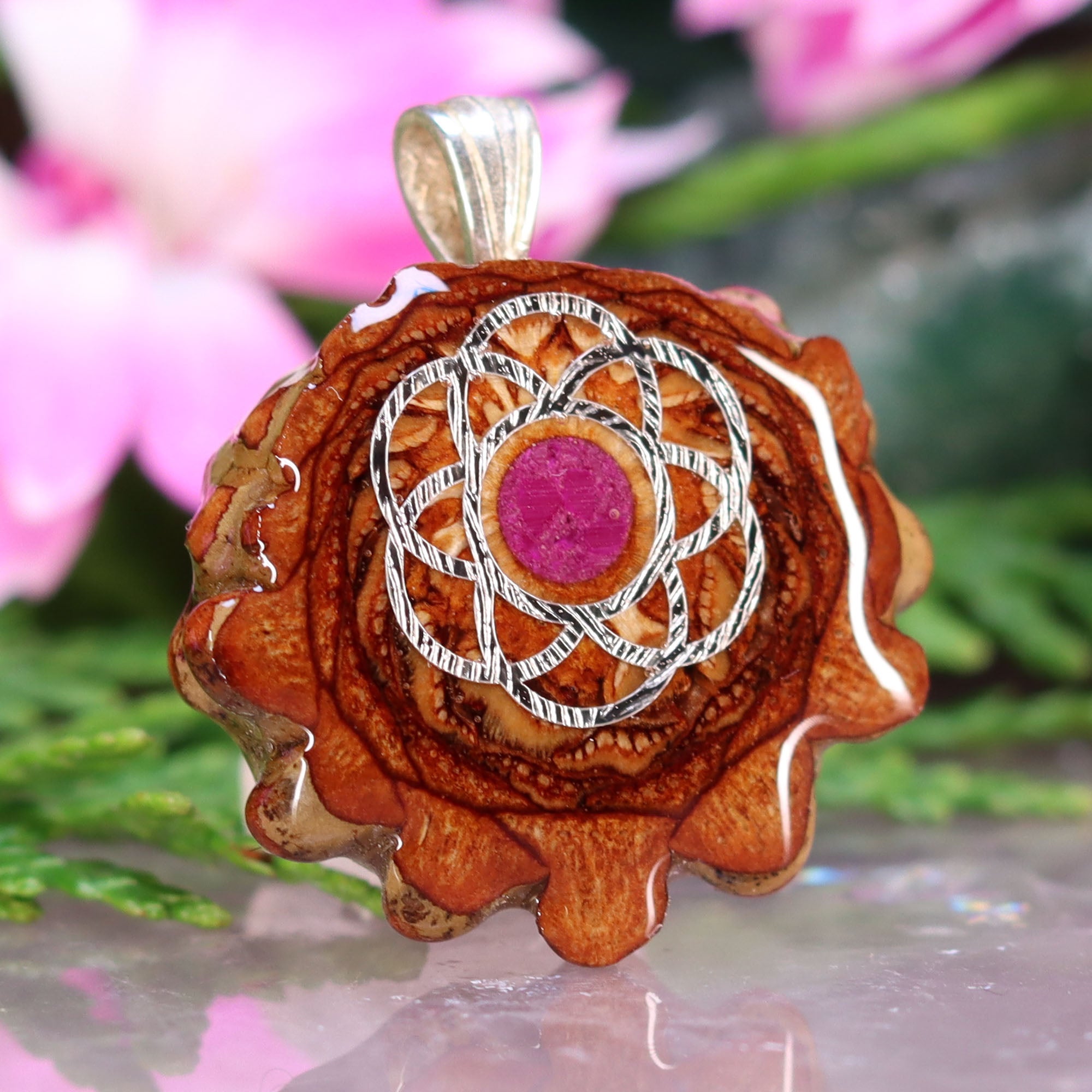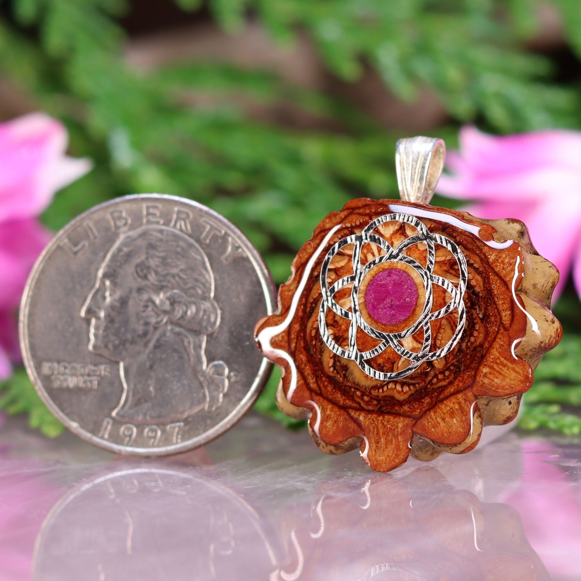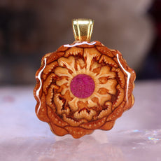 Every pinecone pendant is an elegant gift from Mother Nature -- unveiling the ornate Sacred Geometry hidden at the center of one of the world's densest Pinecones. Because only one cross-section is taken from the "heart" of each Cone, every pendant is absolutely unique, and truly one-of-a-kind.