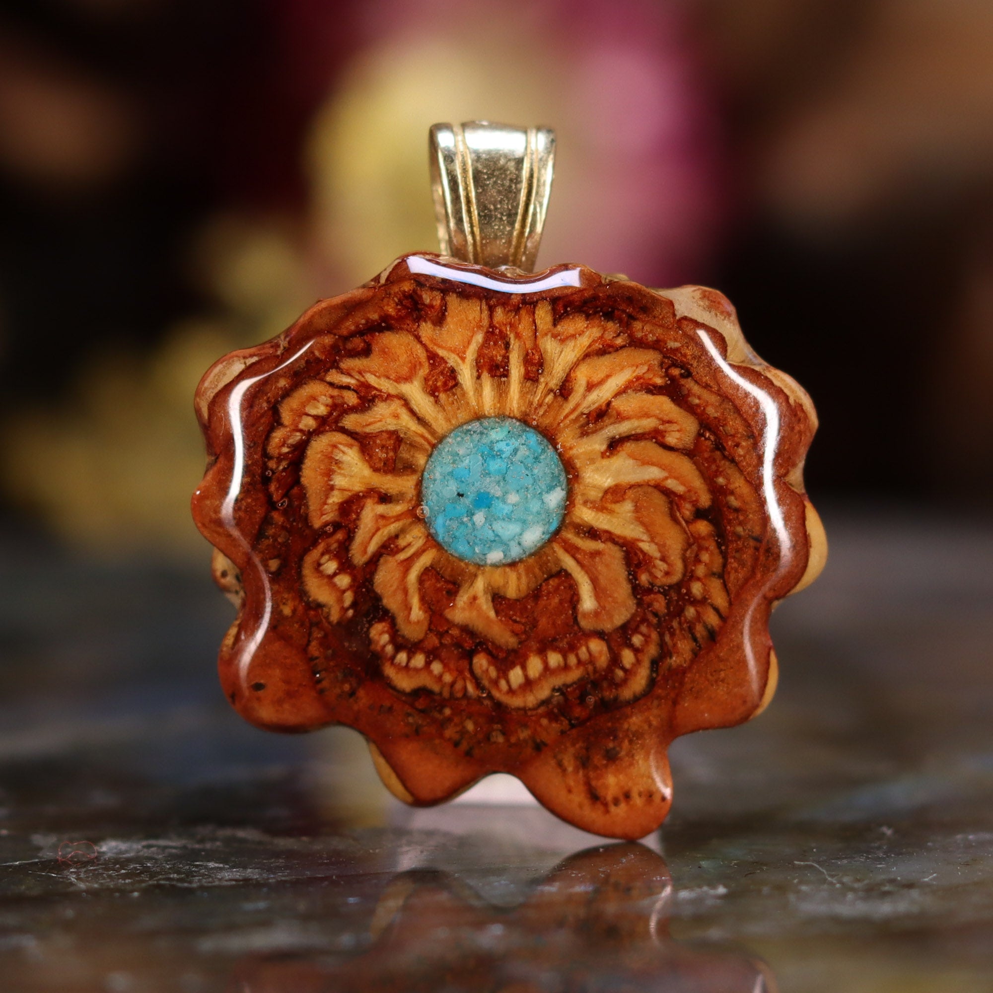 Crushed Turquoise has been carefully mixed with a Phosphorescent Powder, then inlaid into the center of this unique pendant -- causing it to gently "Glow" in the dark, in addition to its vibrant color during the day!