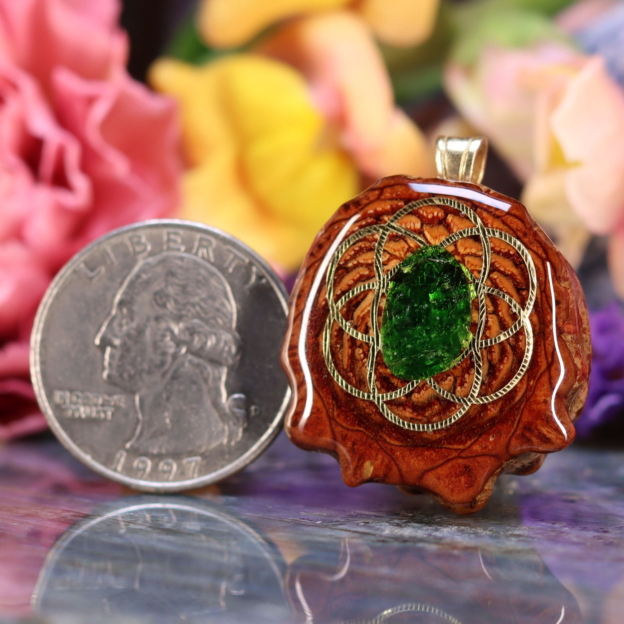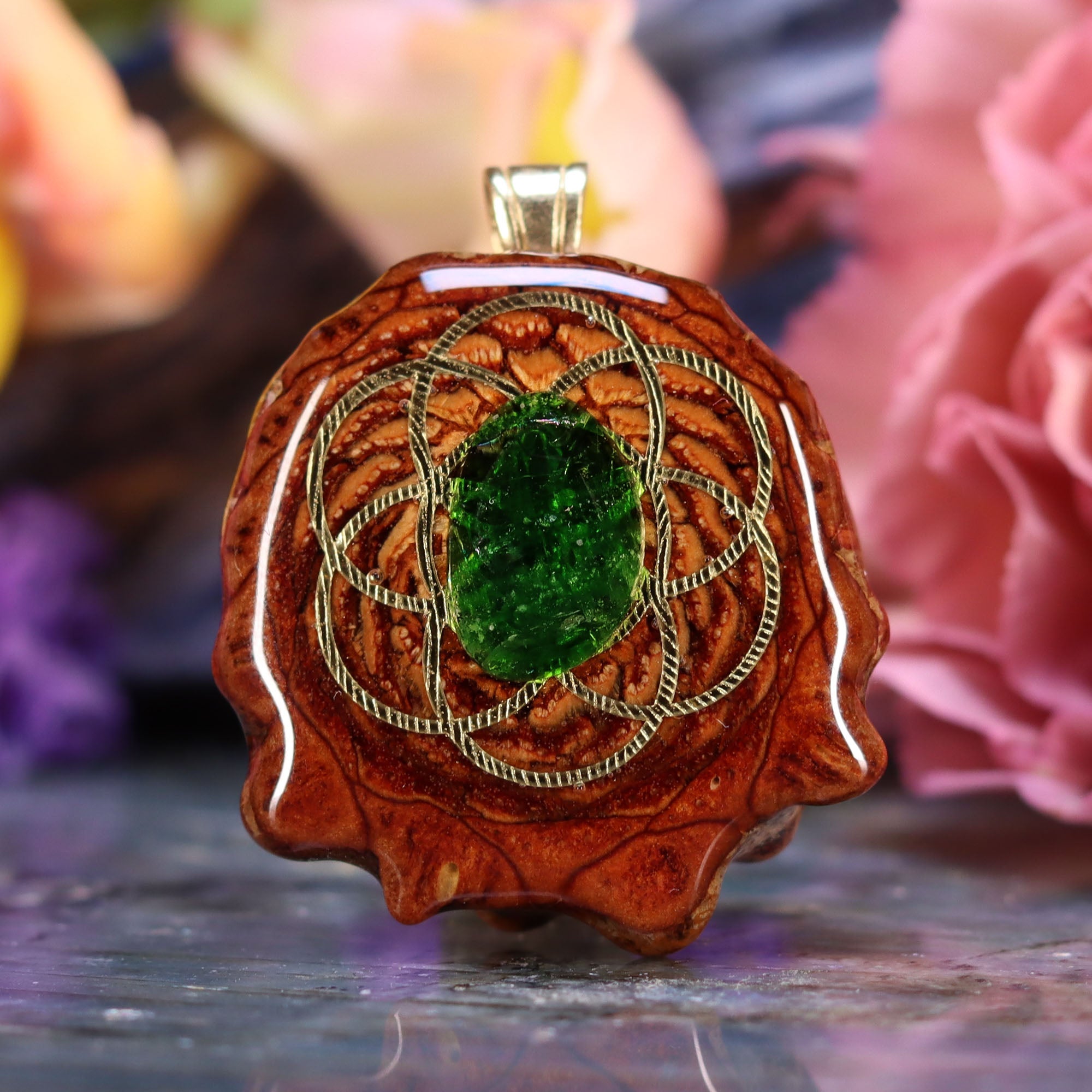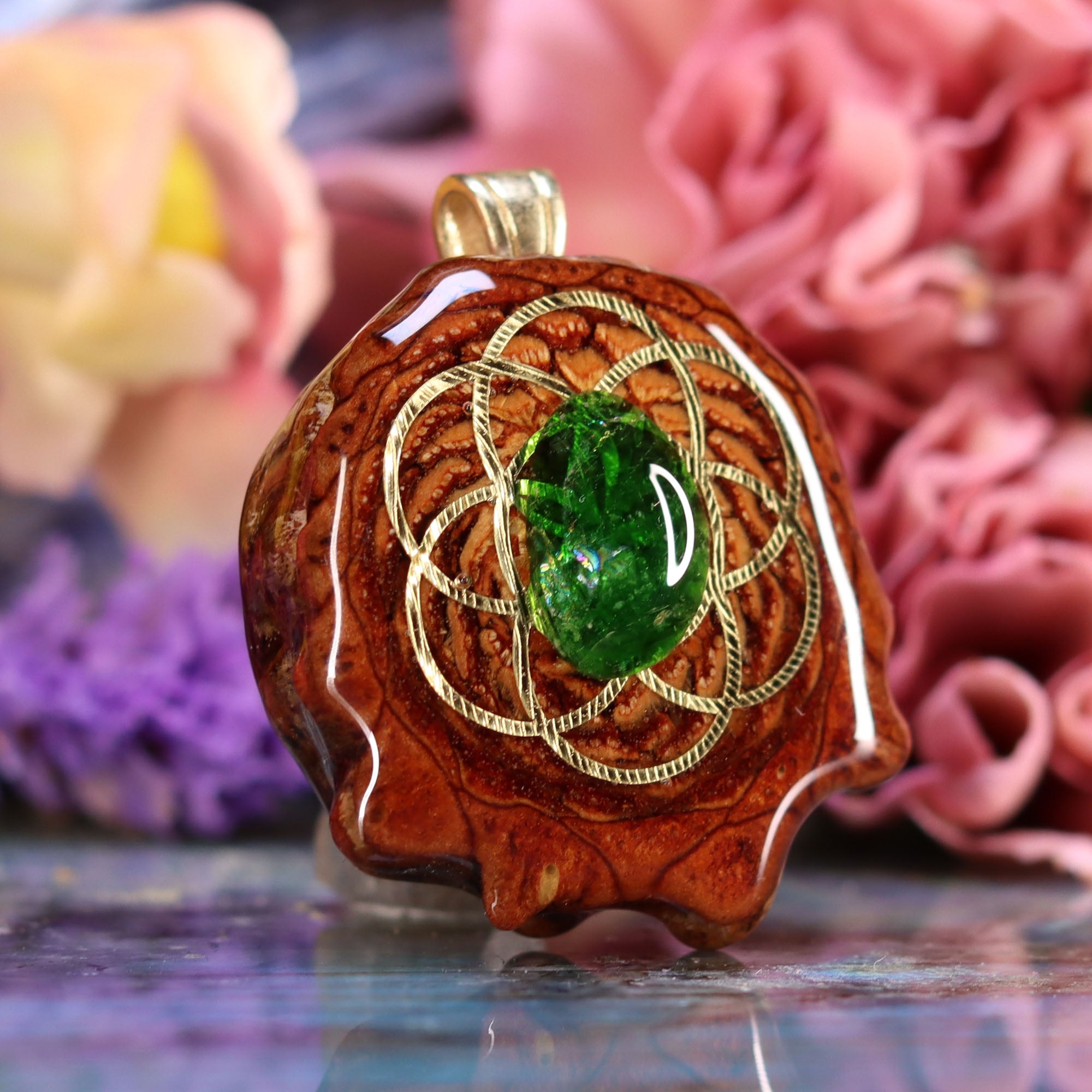 Every pinecone pendant is an elegant gift from Mother Nature -- unveiling the ornate Sacred Geometry hidden at the center of one of the world's densest Pinecones. Because only one cross-section is taken from the "heart" of each Cone, every pendant is absolutely unique, and truly one-of-a-kind.