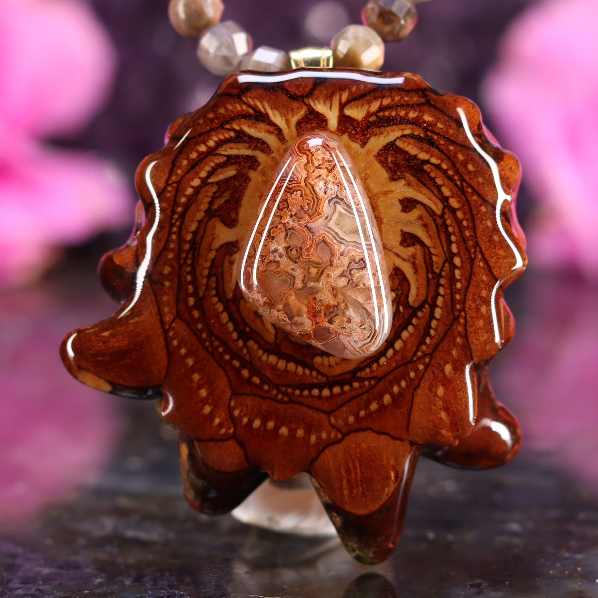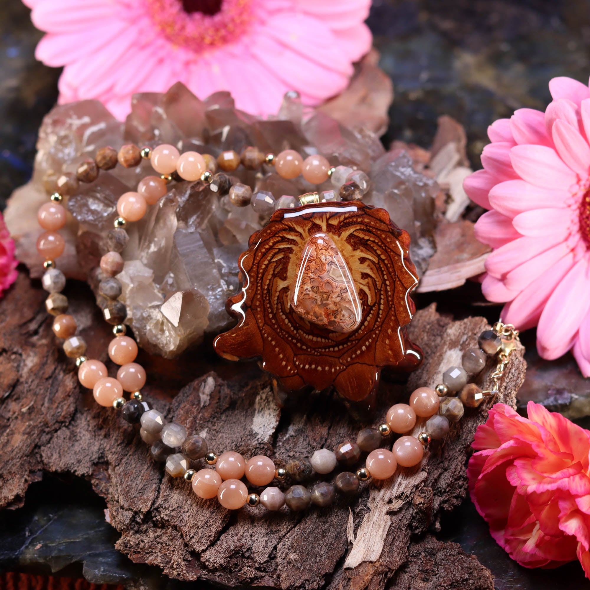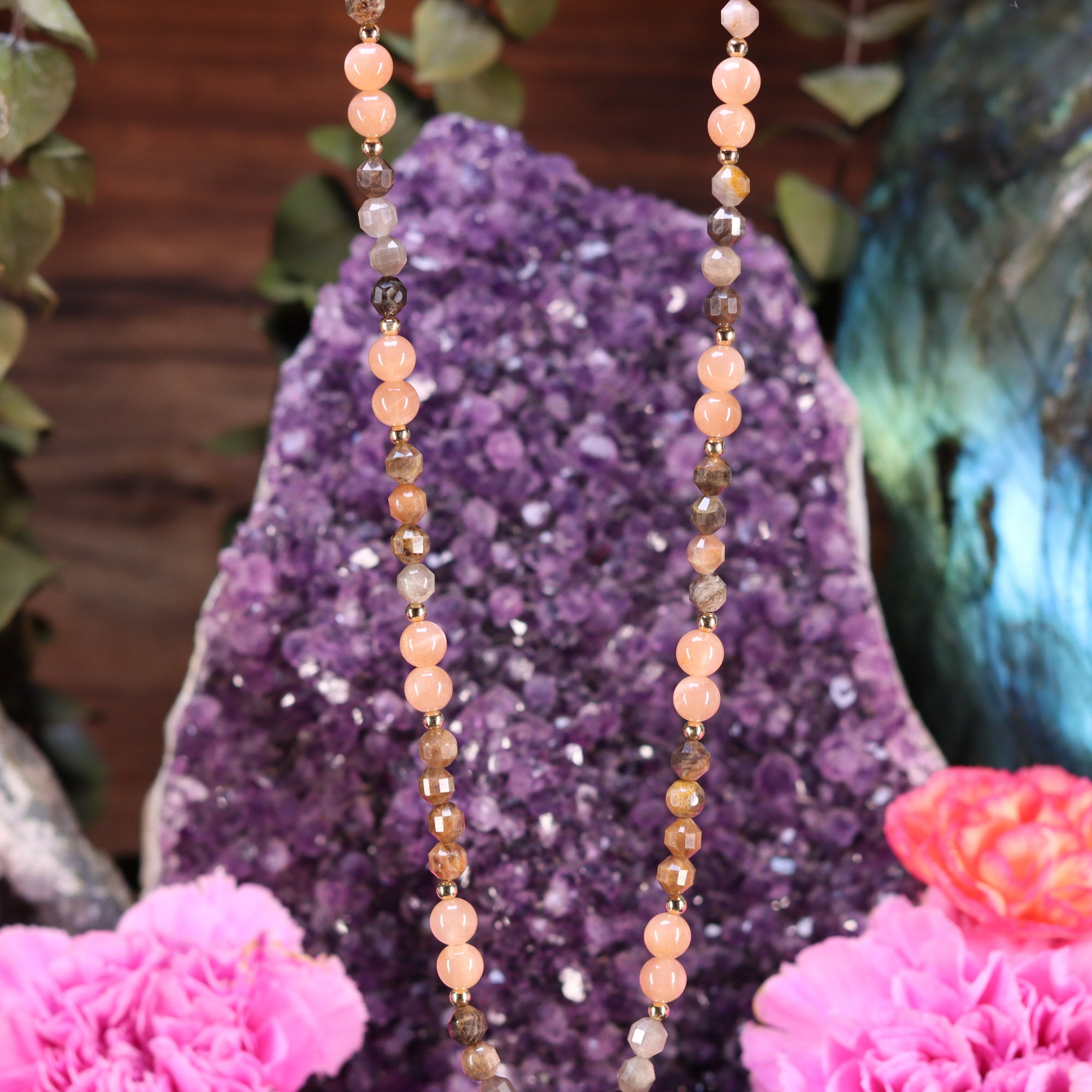 This necklace measures 17.5 inches (44.5 cm) and features a Crazy Lace Agate pendant lovingly strung with a 3-inch length-adjustable 14k Gold Fill chain strung with Peach Moonstone and Grey Brown Moonstone beads to activate and energize body, mind and spirit!