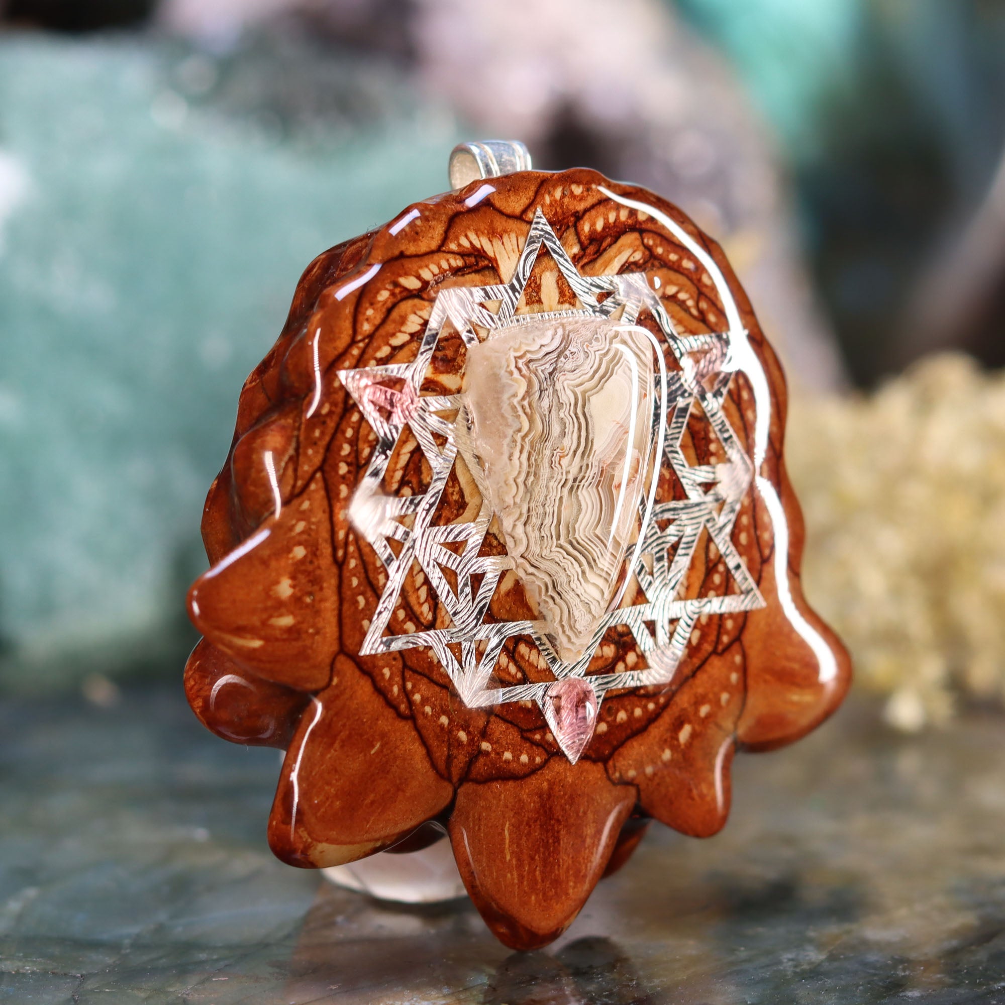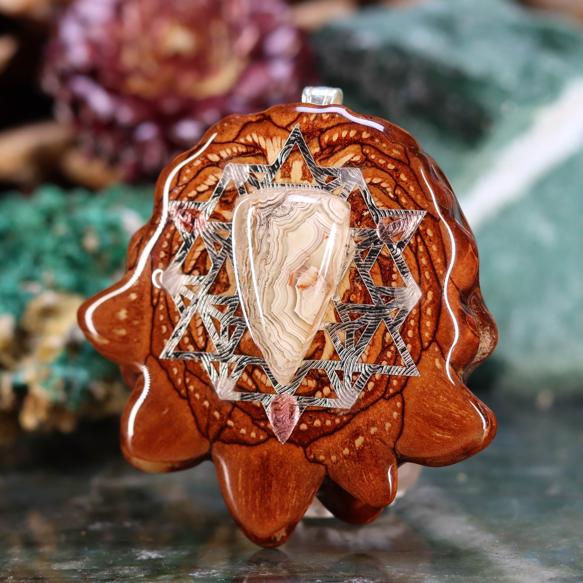 Every pinecone pendant is an elegant gift from Mother Nature -- unveiling the ornate Sacred Geometry hidden at the center of one of the world's densest Pinecones. Because only one cross-section is taken from the "heart" of each Cone, every pendant is absolutely unique, and truly one-of-a-kind.
