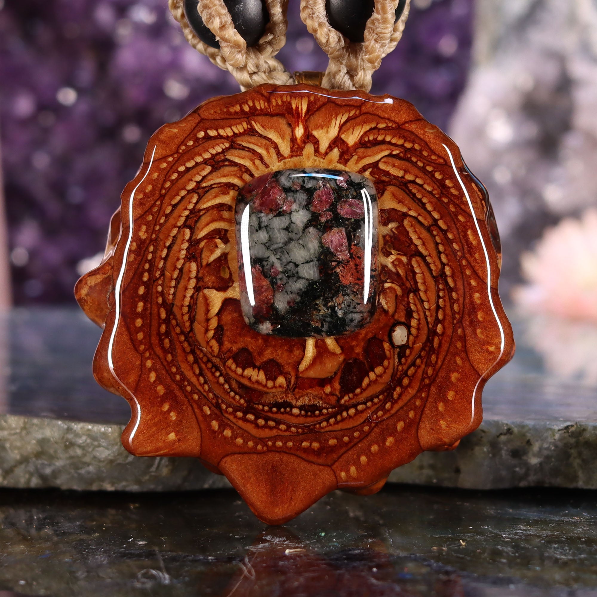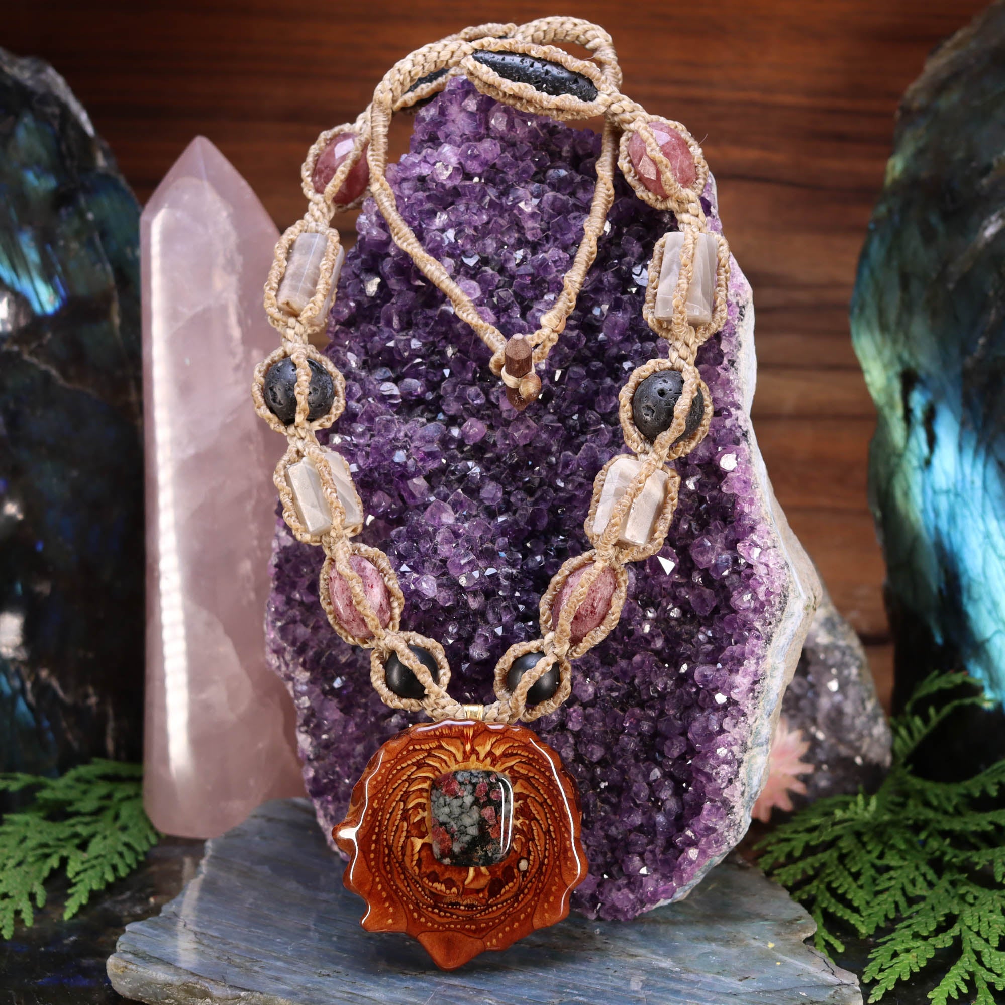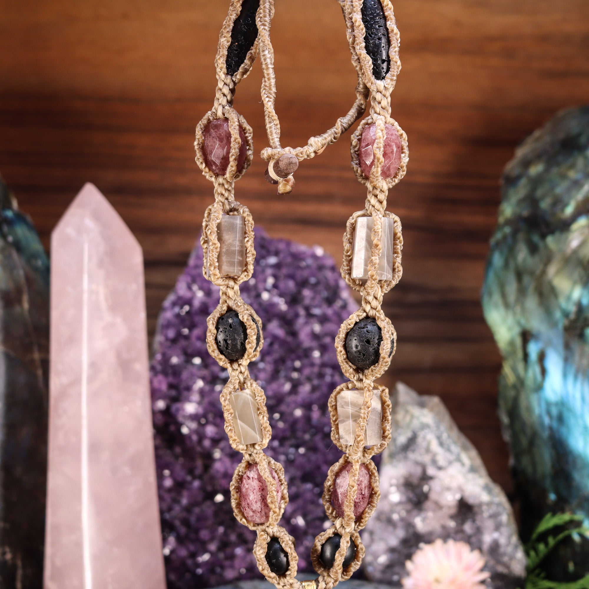 Hand-woven in Bellingham, WA, this necklace features a Eudialyte pendant lovingly strung with Matte Onyx, Strawberry Quartz, Peach Moonstone, and Lava Rock beads to activate and energize body, mind and spirit!