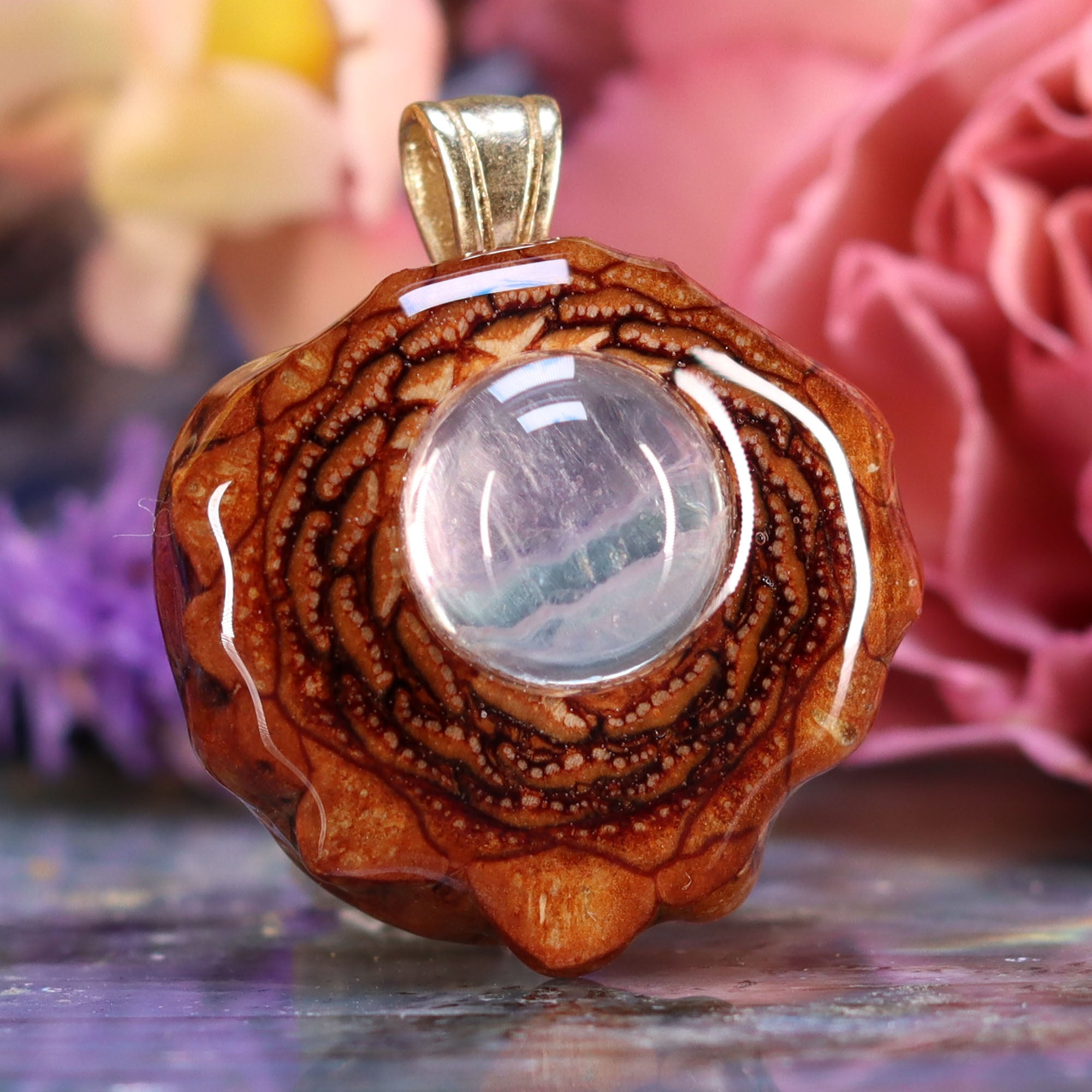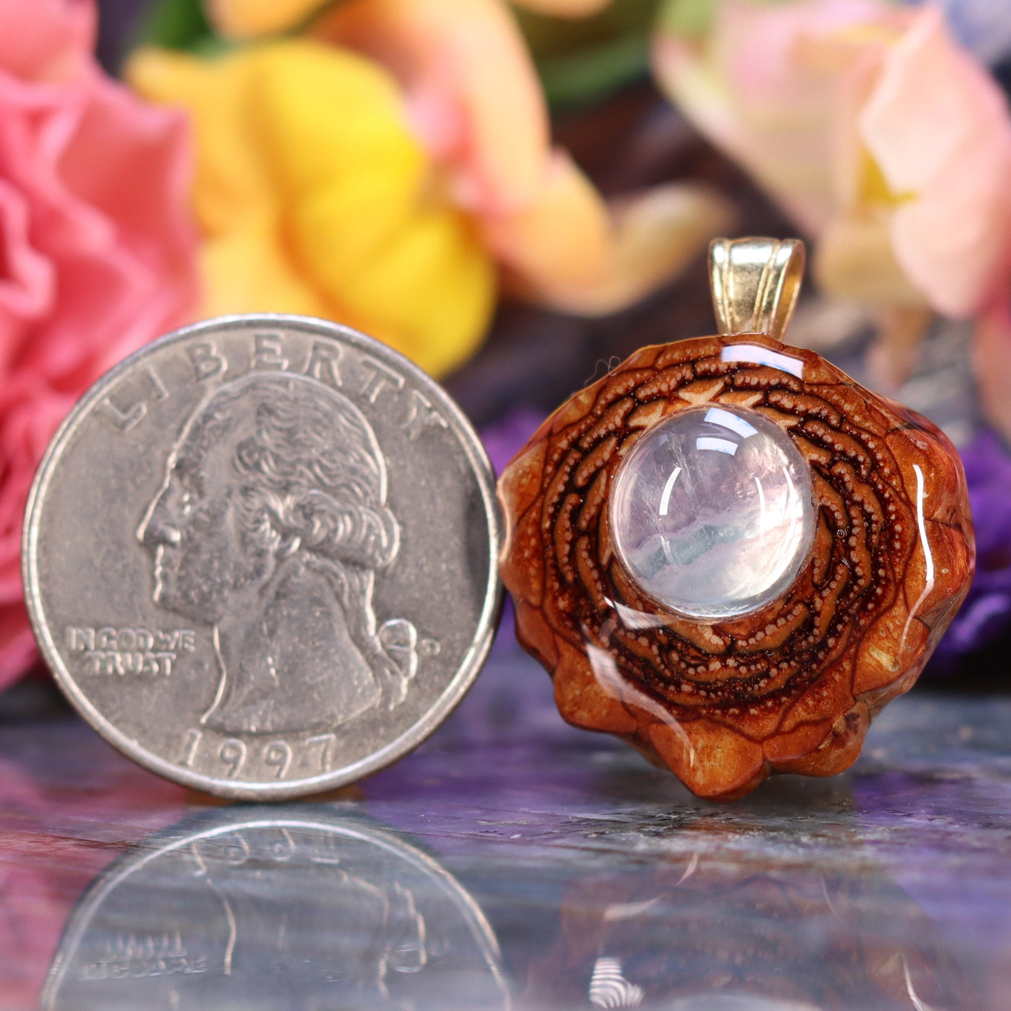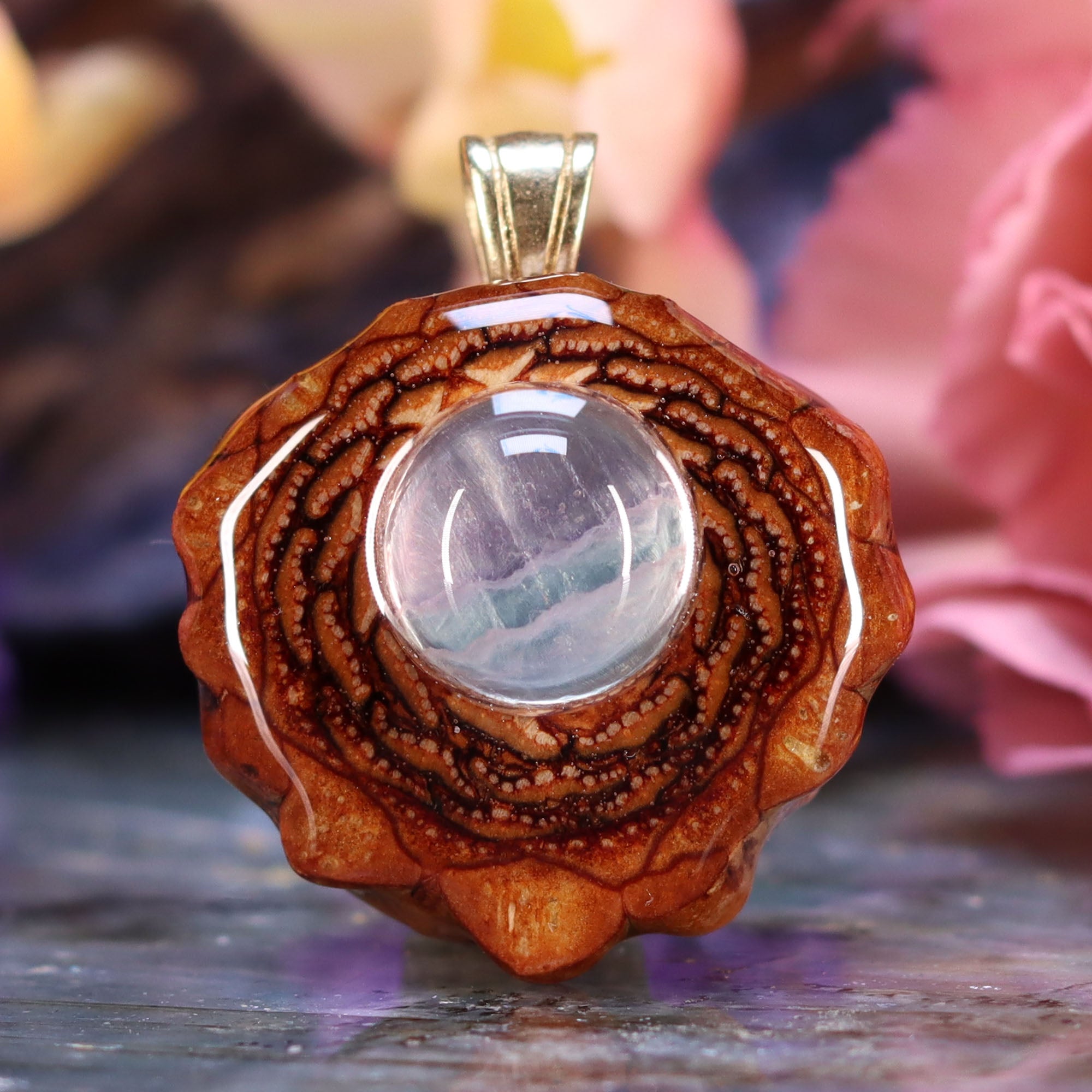 Every pinecone pendant is an elegant gift from Mother Nature -- unveiling the ornate Sacred Geometry hidden at the center of one of the world's densest Pinecones. Because only one cross-section is taken from the "heart" of each Cone, every pendant is absolutely unique, and truly one-of-a-kind.