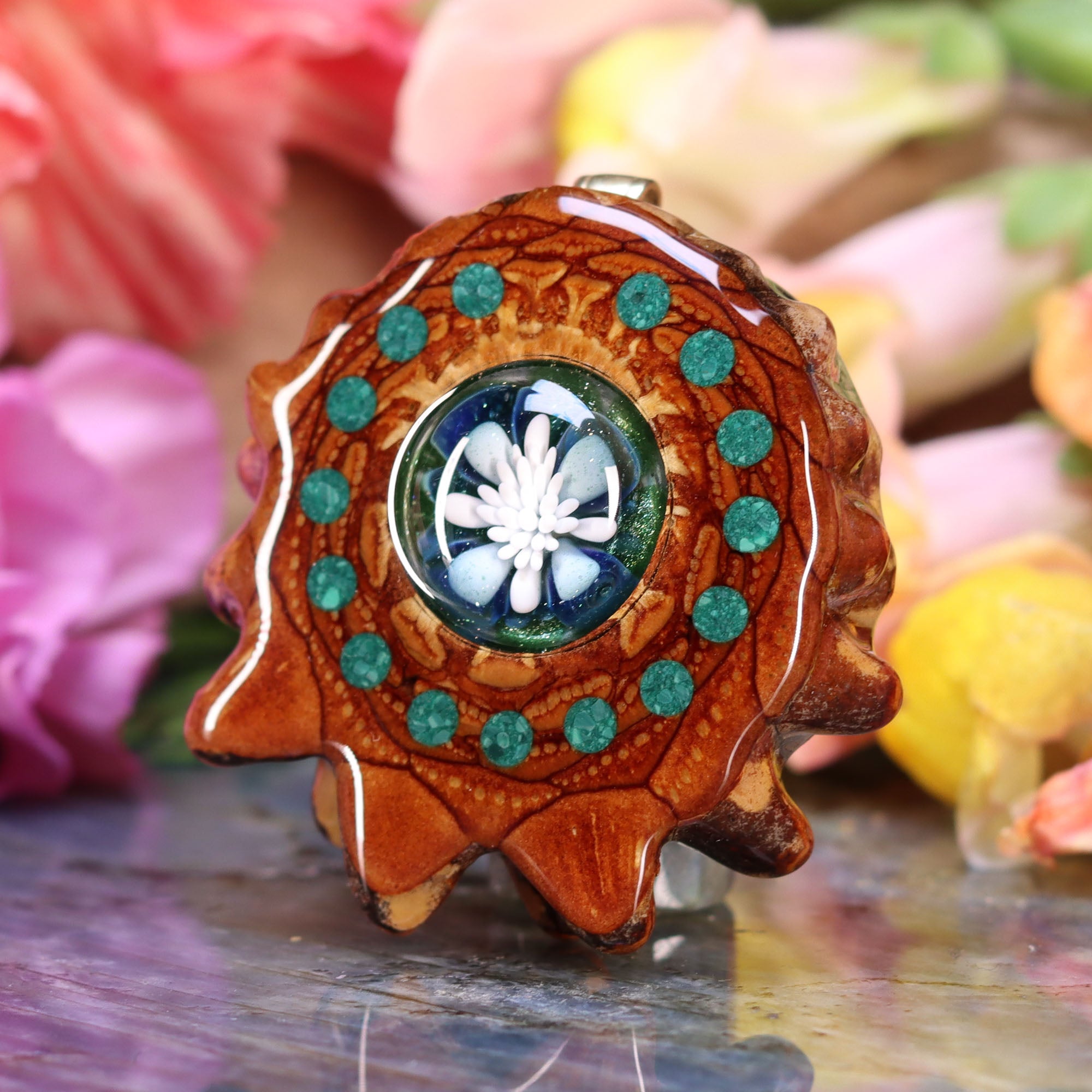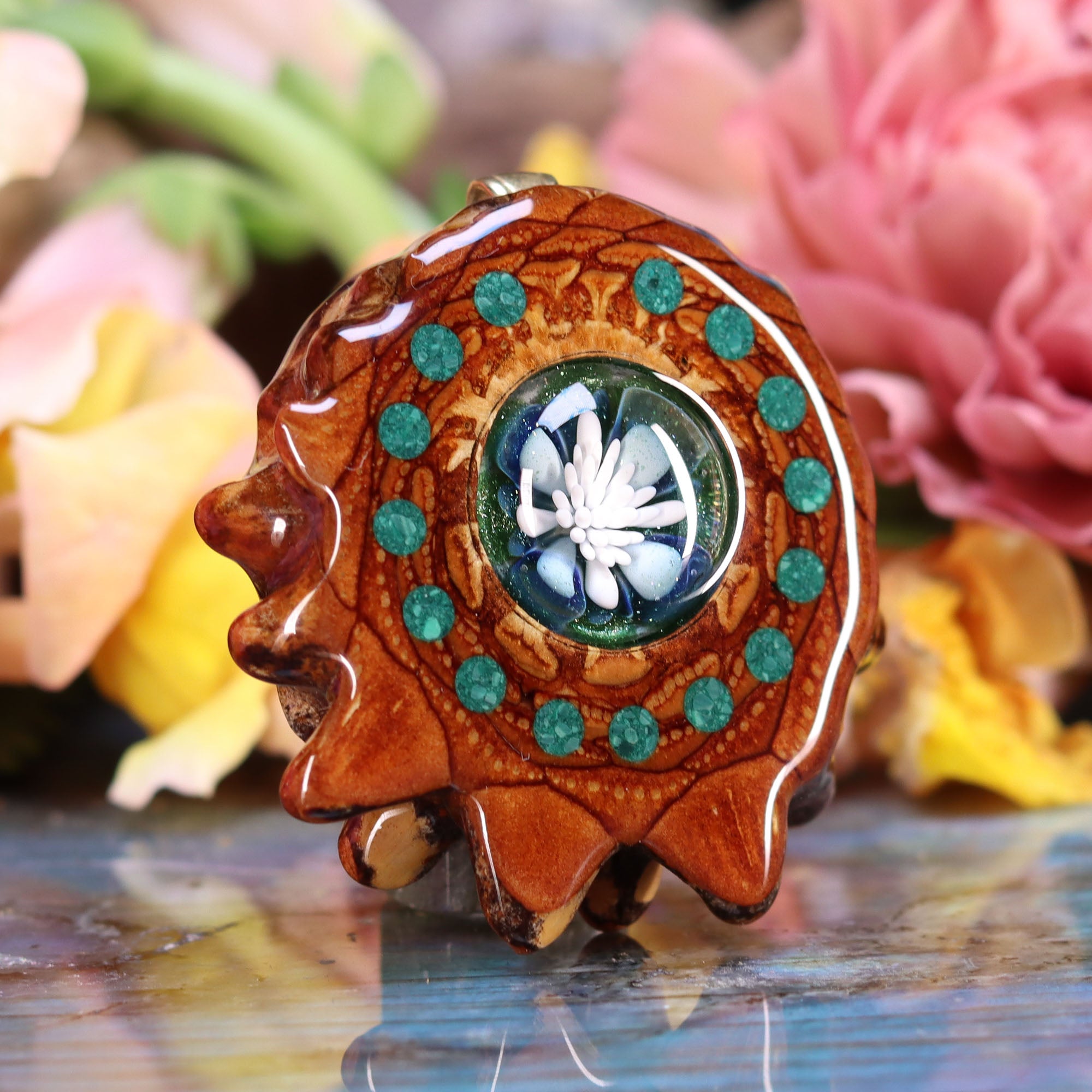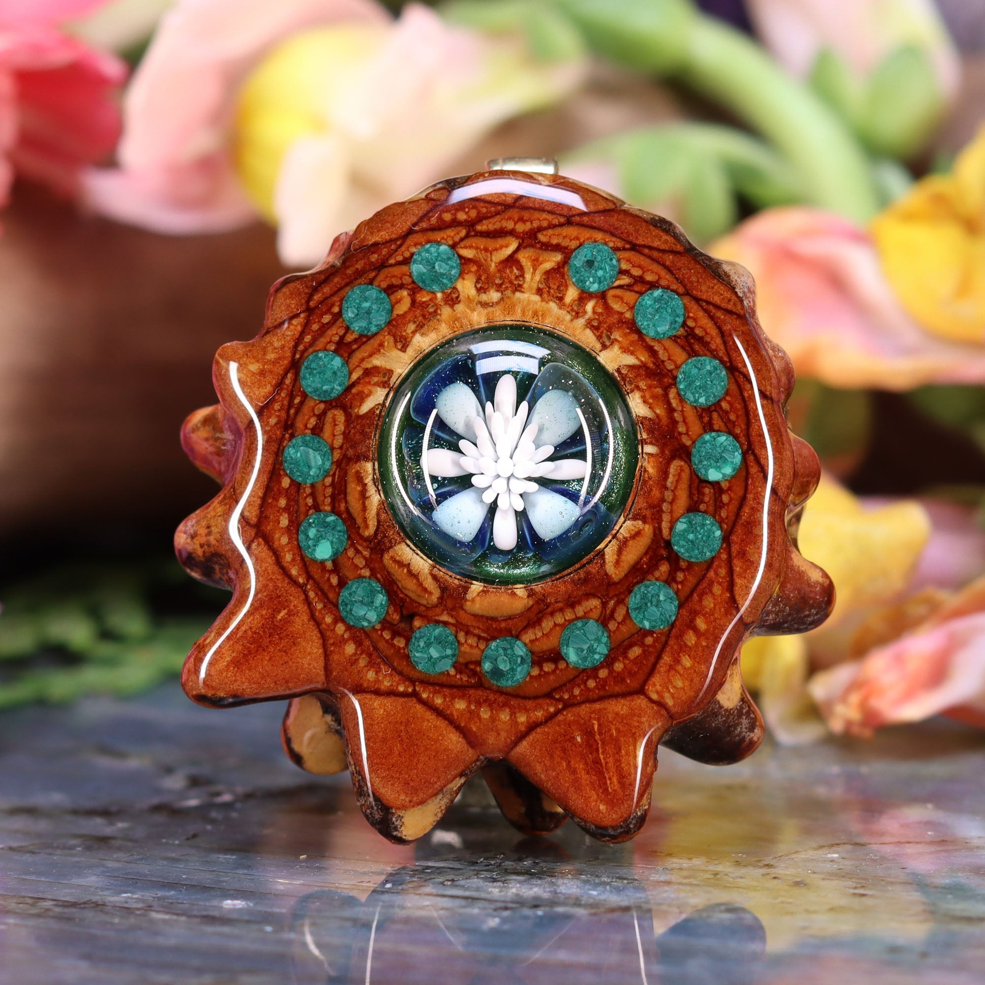 This epic collaboration between Third Eye Pinecones and Nick Anderson Art features a small Glass “Phoenix Orchid” Cab set inside one of our Pinecone Pendants! Each one of these Phoenix Orchid pendants is entirely unique, each with a life of its own. This piece is a one-of-a-kind creation, handmade by Nick, adding an exotic beauty and a stunning natural presence to the person wearing it.