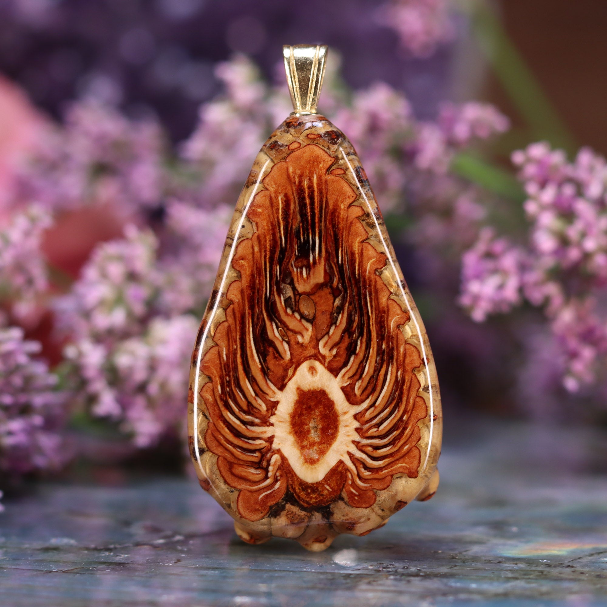 Our *new* Teardrop-style pendants reveal an elegant, angular pattern, only visible within the diagonal cross-section of specifically-shaped Pinecones. Due to the beautiful, diverse patterns displayed on both the front and back of these unique pendants, we’ve photographed both sides of these truly “reversible” new designs!