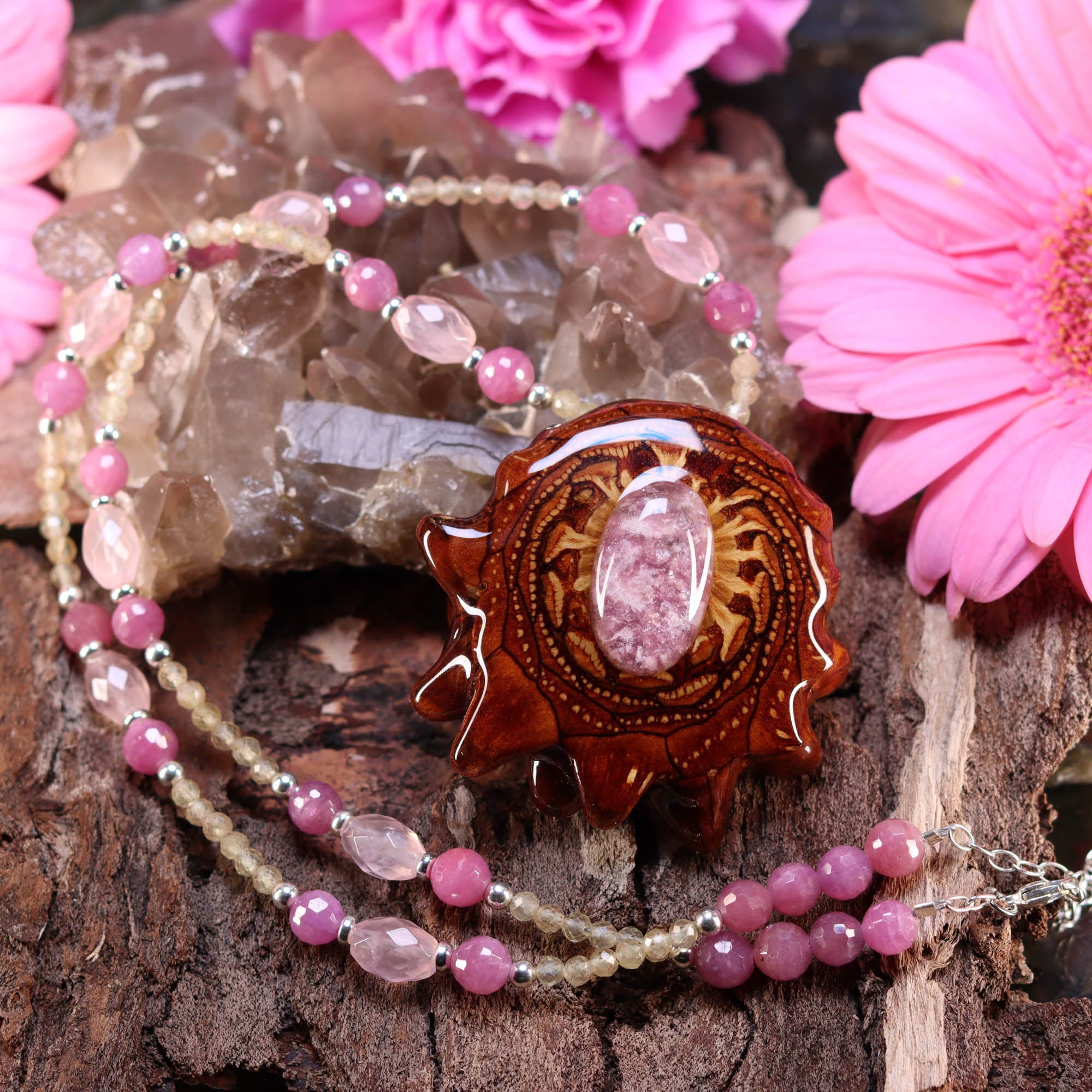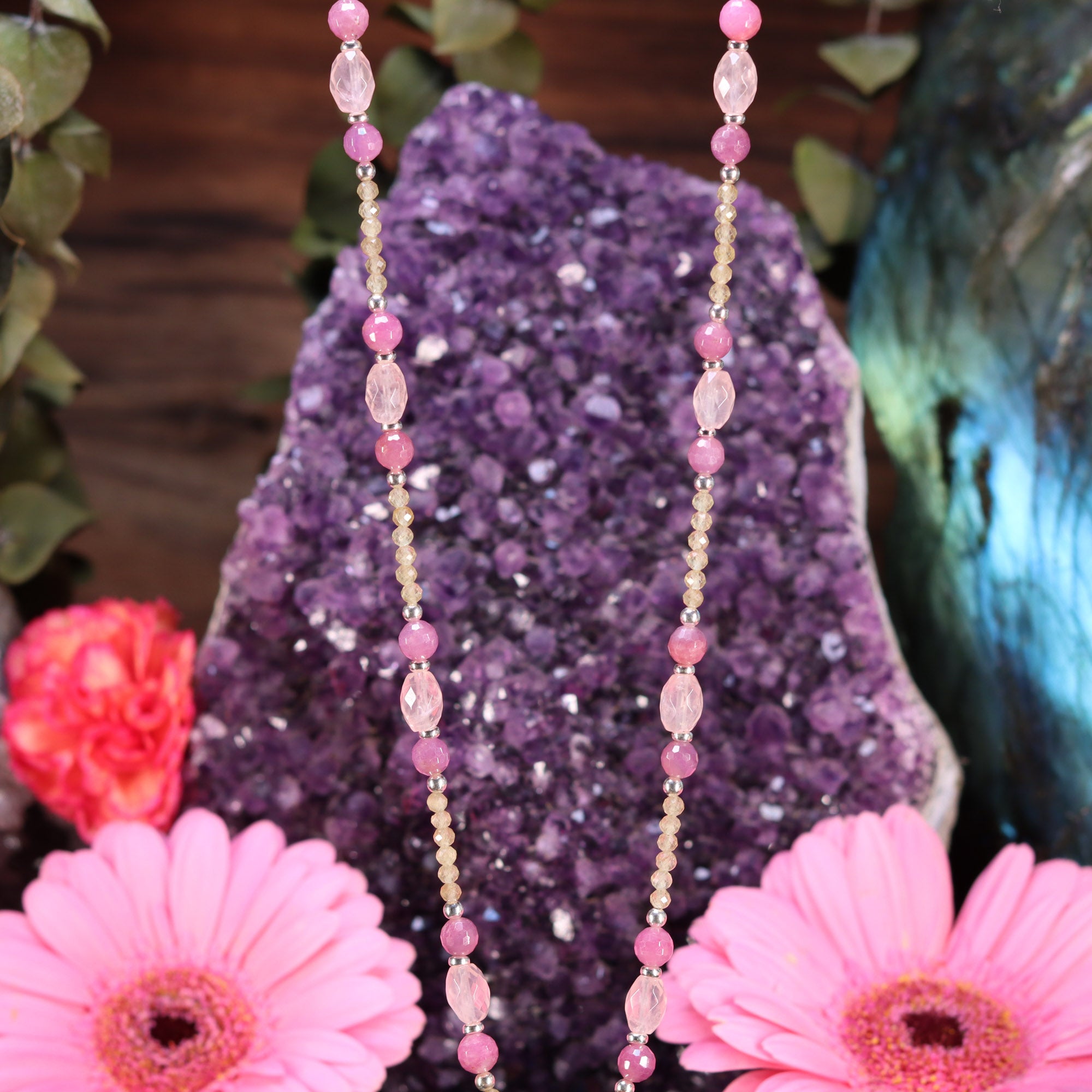 This necklace measures 18 inches (46 cm) and features a Lepidolite pendant lovingly strung with a 3.5-inch length-adjustable Sterling Silver chain strung with Citrine, Ruby Jade, and Rose Quartz beads to activate and energize body, mind and spirit!