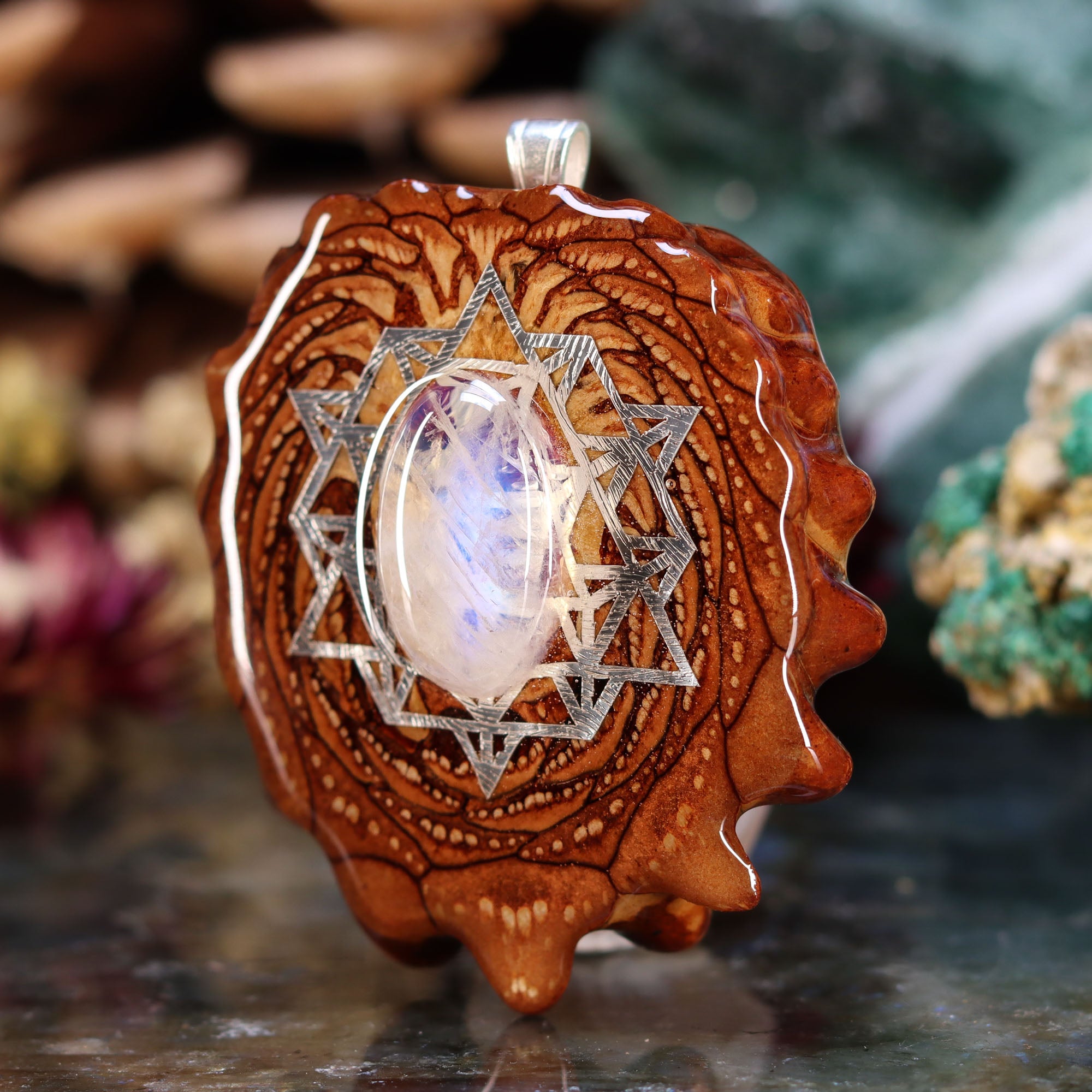 Every pinecone pendant is an elegant gift from Mother Nature -- unveiling the ornate Sacred Geometry hidden at the center of one of the world's densest Pinecones. Because only one cross-section is taken from the "heart" of each Cone, every pendant is absolutely unique, and truly one-of-a-kind.