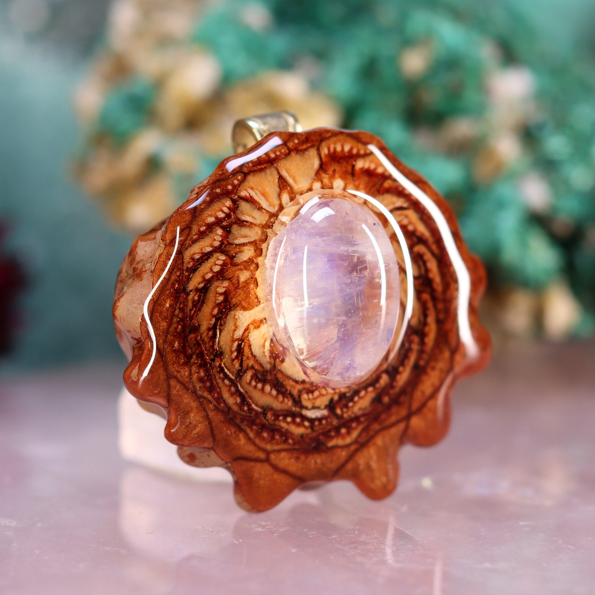 As its name suggests, Moonstone is strongly connected to the archetypal feminine energies of the moon, intuition, and empathy. It helps reconnect with the softness and wisdom of the great mother if one gets caught up in stress, fixation, or aggression. It is recognized as a powerful tool to make conscious the unconscious, and traditionally has been worn as a pendant to encourage the fruition of one's psychic gifts, as well as to facilitate lucid dreaming.