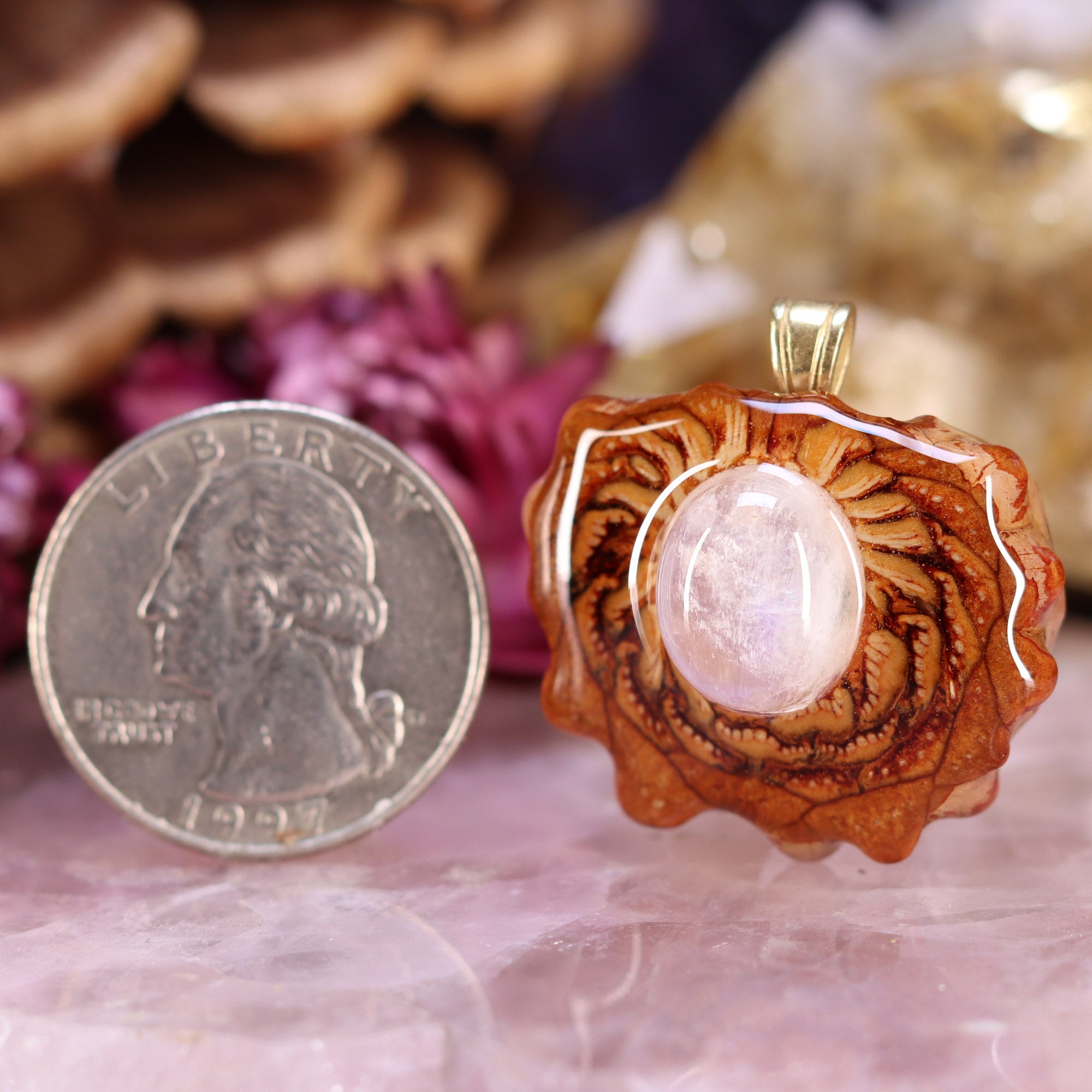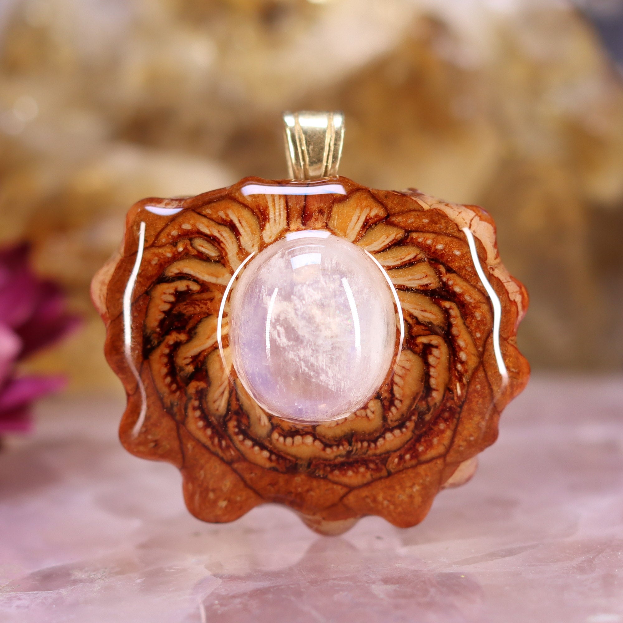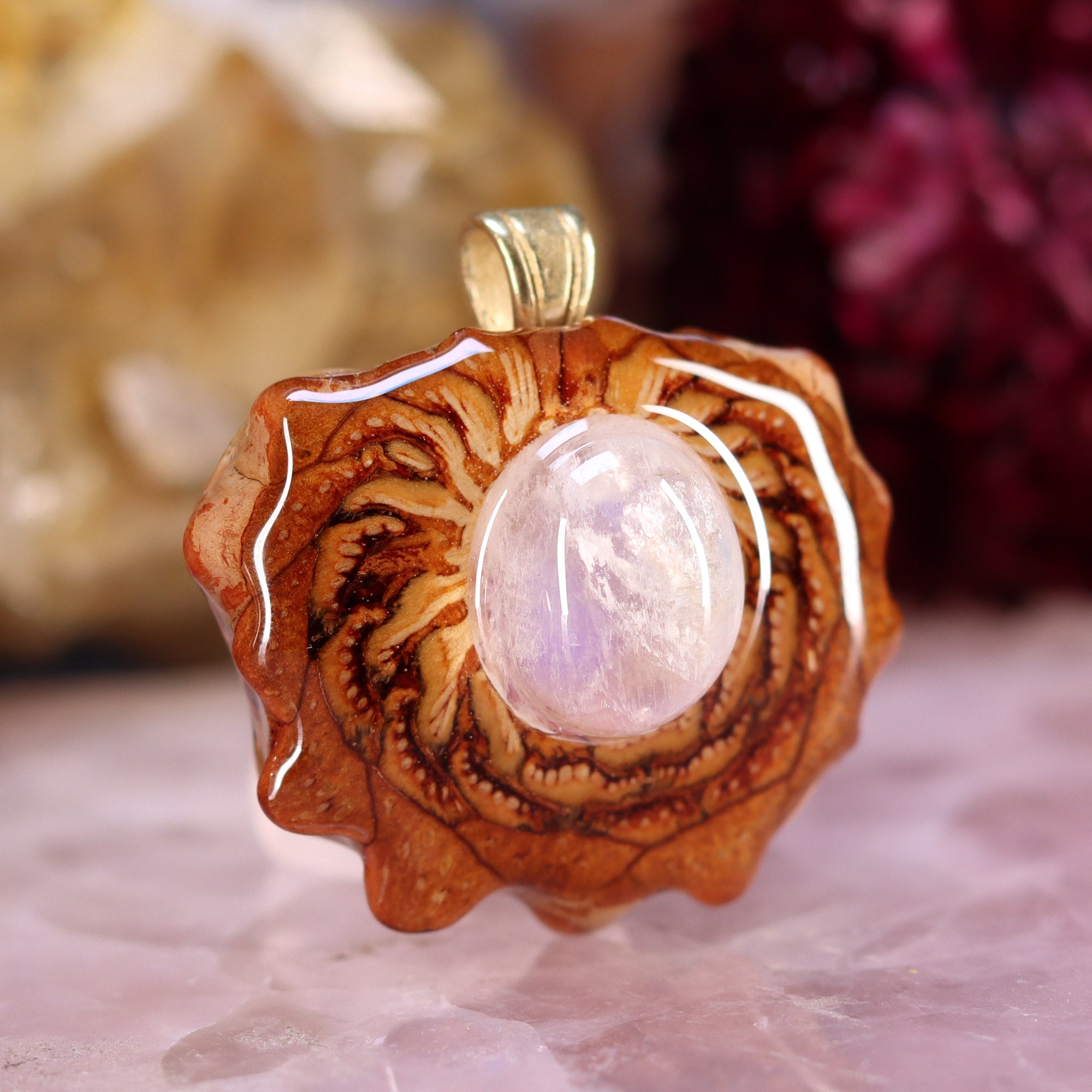 As its name suggests, Moonstone is strongly connected to the archetypal feminine energies of the moon, intuition, and empathy. It helps reconnect with the softness and wisdom of the great mother if one gets caught up in stress, fixation, or aggression. It is recognized as a powerful tool to make conscious the unconscious, and traditionally has been worn as a pendant to encourage the fruition of one's psychic gifts, as well as to facilitate lucid dreaming.