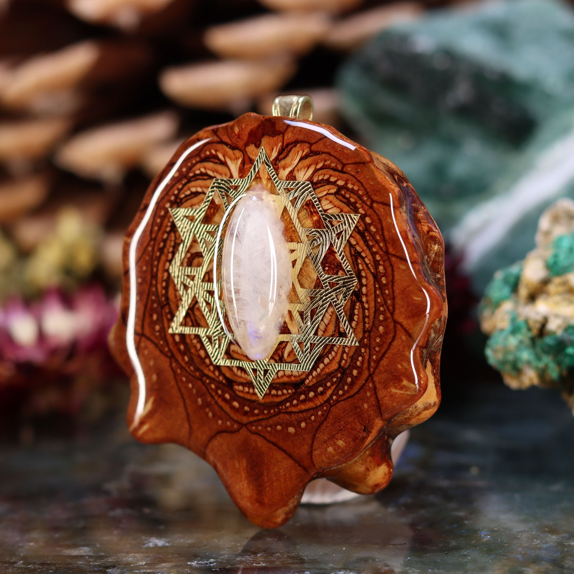 Every pinecone pendant is an elegant gift from Mother Nature -- unveiling the ornate Sacred Geometry hidden at the center of one of the world's densest Pinecones. Because only one cross-section is taken from the "heart" of each Cone, every pendant is absolutely unique, and truly one-of-a-kind.