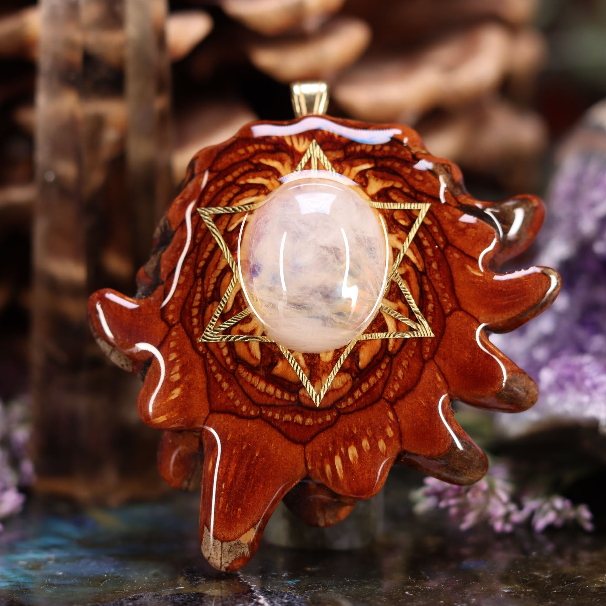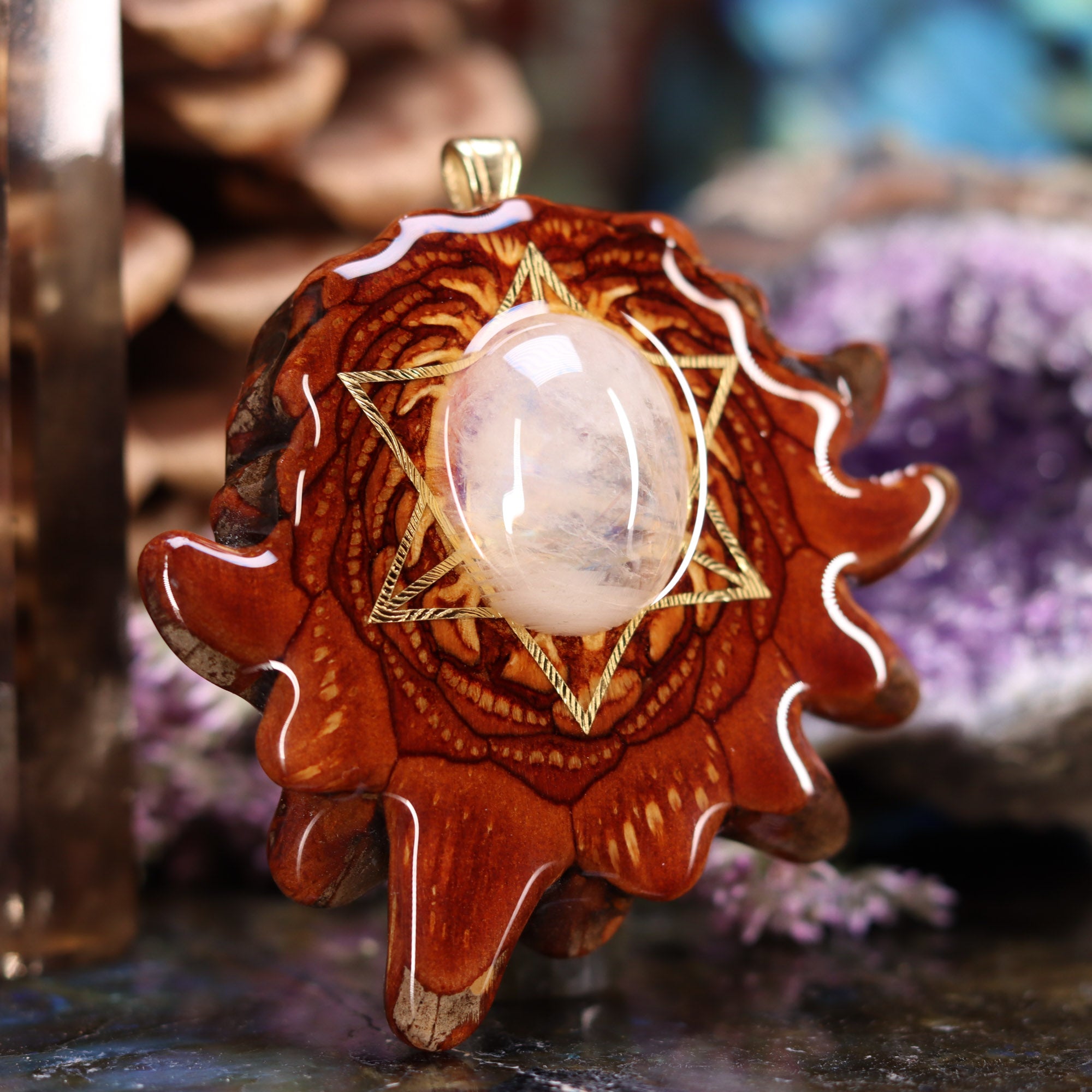 As its name suggests, Moonstone is strongly connected to the archetypal feminine energies of the moon, intuition, and empathy. It helps reconnect with the softness and wisdom of the great mother if one gets caught up in stress, fixation, or aggression. It is recognized as a powerful tool to make conscious the unconscious, and traditionally has been worn as a pendant to encourage the fruition of one's psychic gifts, as well as to facilitate lucid dreaming.